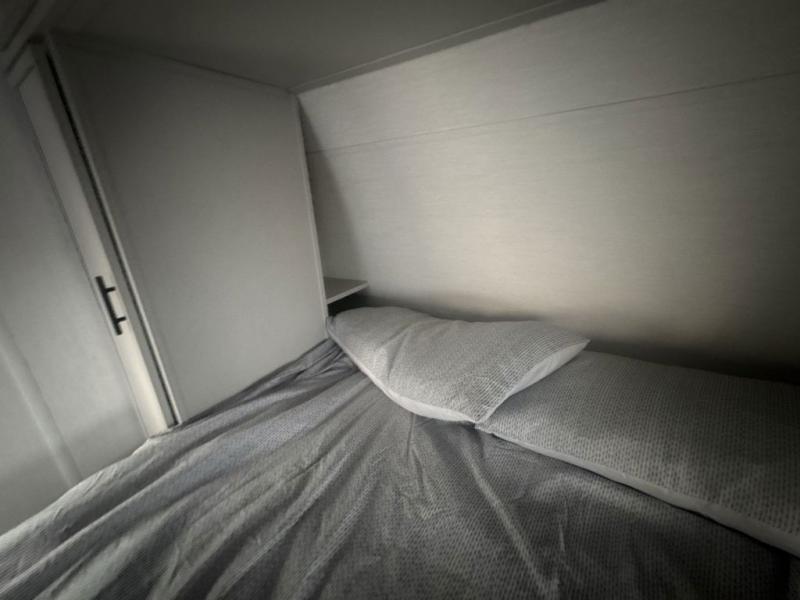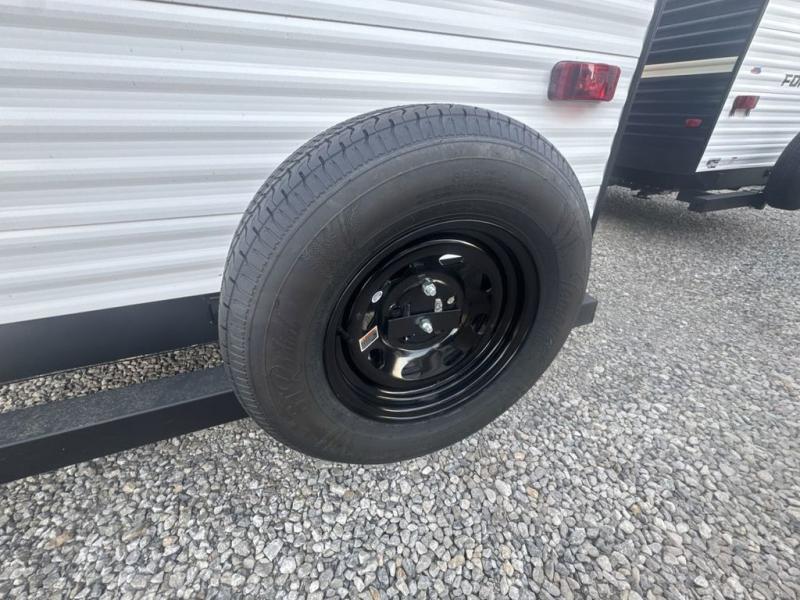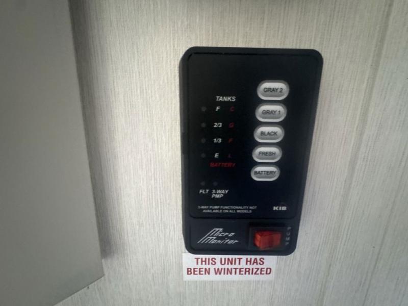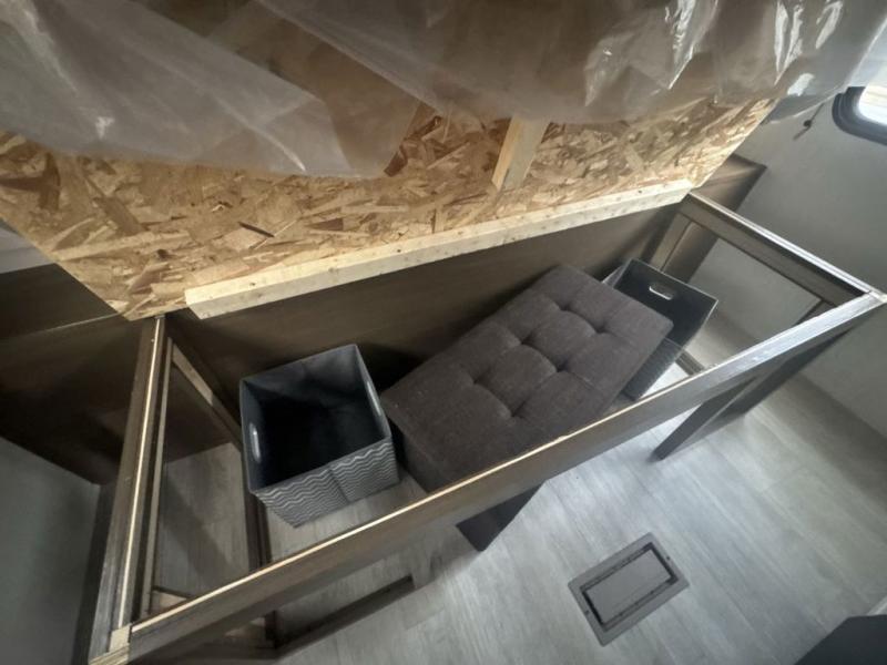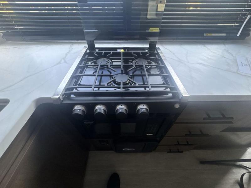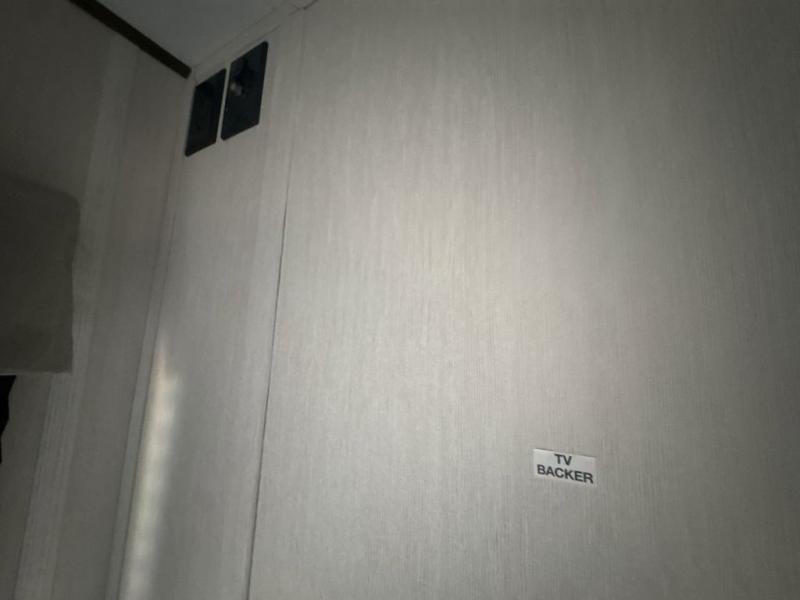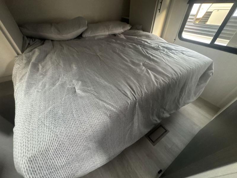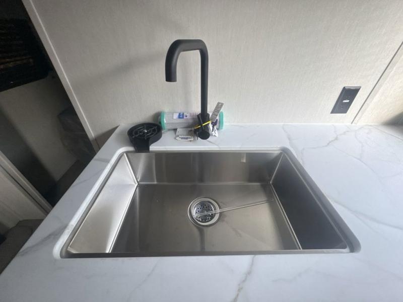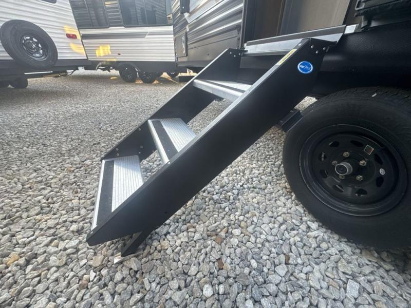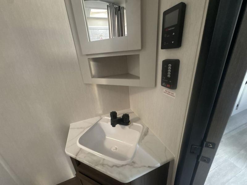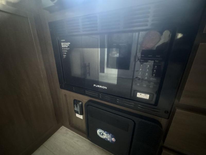 Head to your local state park in this spacious travel trailer! Once you arrive at the campground, you can grab a cold drink from the exterior refrigerator, then head inside to make lunch. An L-shaped counter with two stools provides a place to enjoy your morning coffee at, or you may find yourselves on the sofa within the slide out. The pantry and 12V refrigerator is also found here and can hold all your food for the week. You'll feel right at home in the front private bedroom that includes a camp king bed, dual wardrobes, and an overhead cabinet for even more storage. This model also includes washer and dryer prep if you choose to add those appliances!