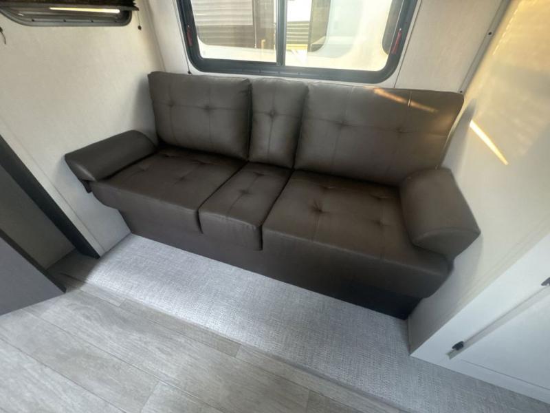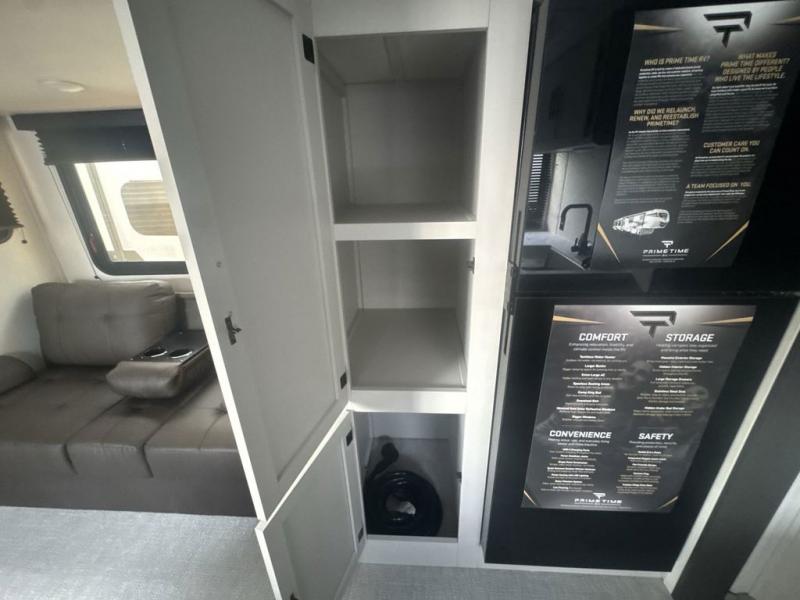 With any Avenger travel trailer by Prime Time RV, you will find innovation, a solid build, and comfort at every turn. Each model is built with Tuff Coat on the exterior metal, a fully enclosed underbelly, and a PVC roof membrane to help extend the life of your trailer. You will also find automotive name badging on the exterior, along with an exterior shower, front rail LED light strips, plus an XL padded entry grab handle to name a few conveniences. There are plenty of storage spaces inside, as well as Congoleum flooring and woven PVC marine grade slide out flooring, a designer shower surround, and seamless pressed countertops. You are sure to appreciate the onboard water filtration system, tankless water heater, plus 30K BTU furnace and 15K ducted A/C to help keep you comfortable.