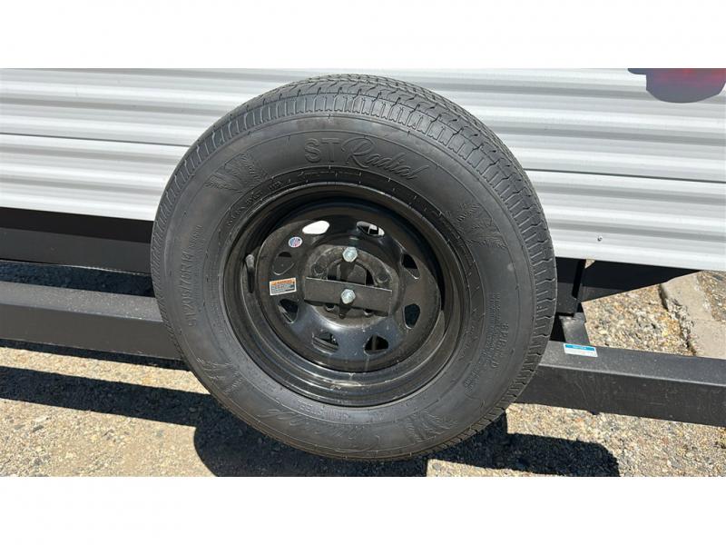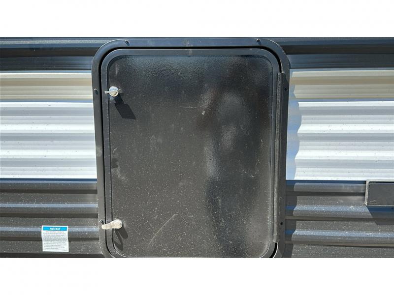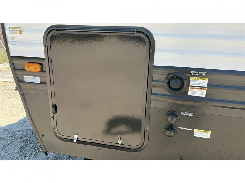 Head to your local state park in this spacious travel trailer! Once you arrive at the campground, you can grab a cold drink from the exterior refrigerator, then head inside to make lunch. An L-shaped counter with two stools provides a place to enjoy your morning coffee at, or you may find yourselves on the sofa within the slide out. The pantry and 12V refrigerator is also found here and can hold all your food for the week. You'll feel right at home in the front private bedroom that includes a camp king bed, dual wardrobes, and an overhead cabinet for even more storage. This model also includes washer and dryer prep if you choose to add those appliances!