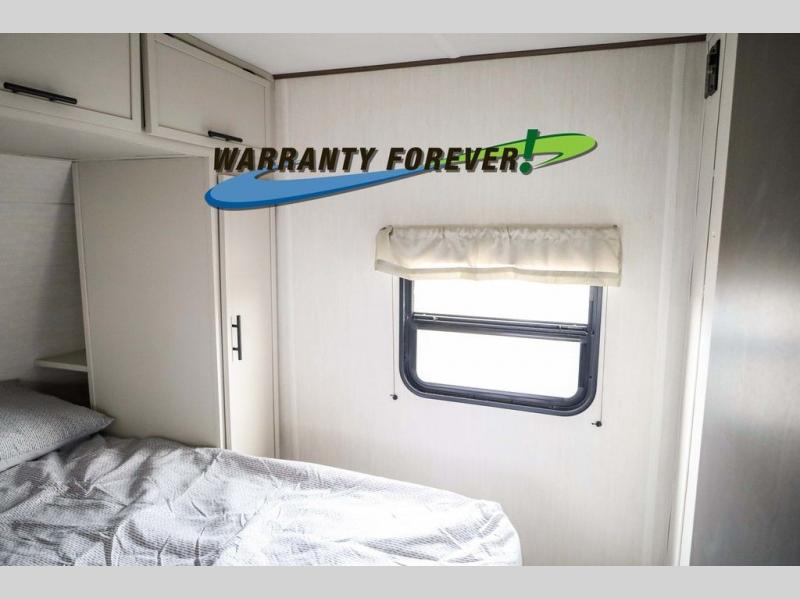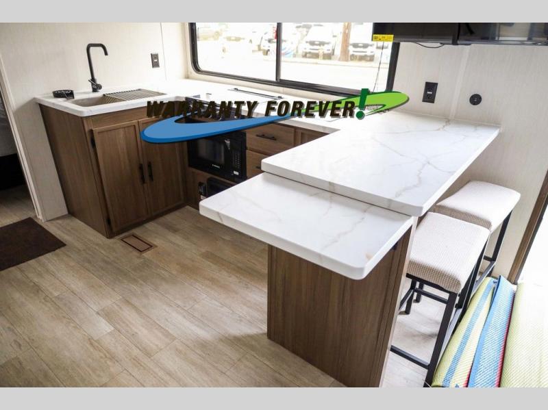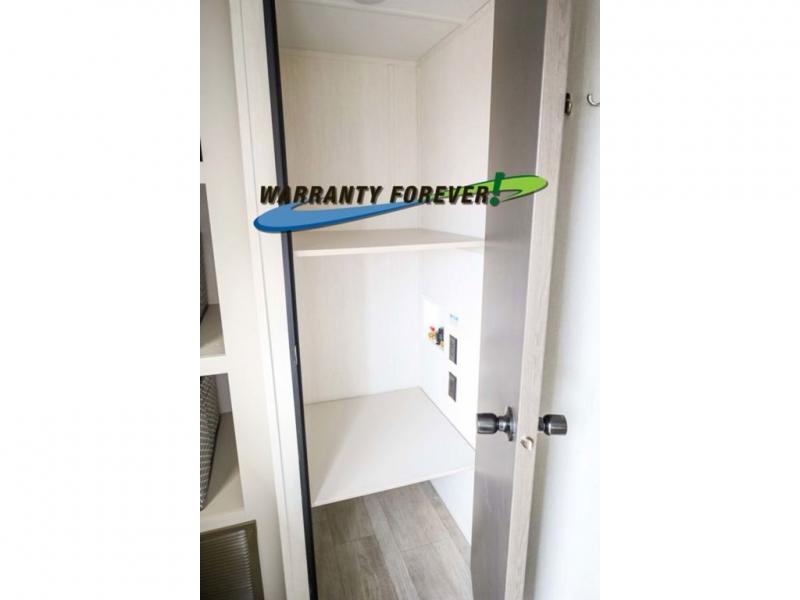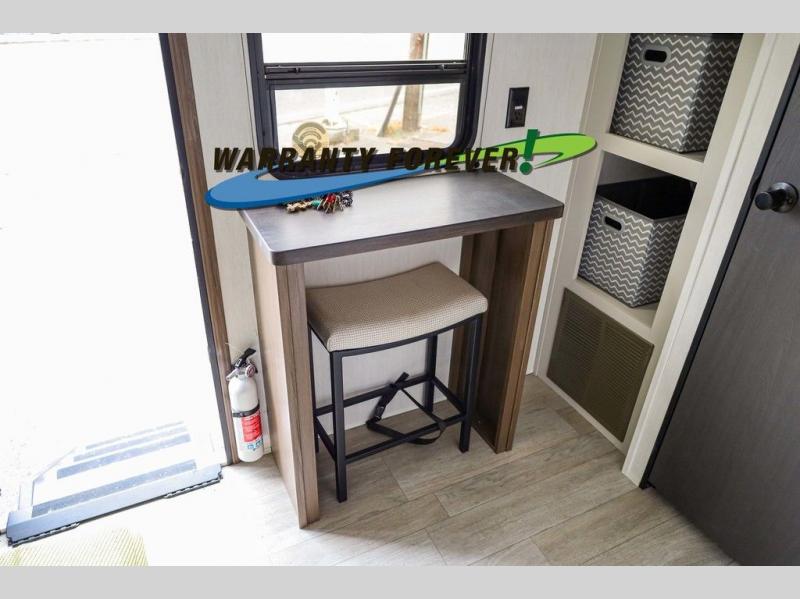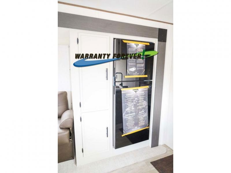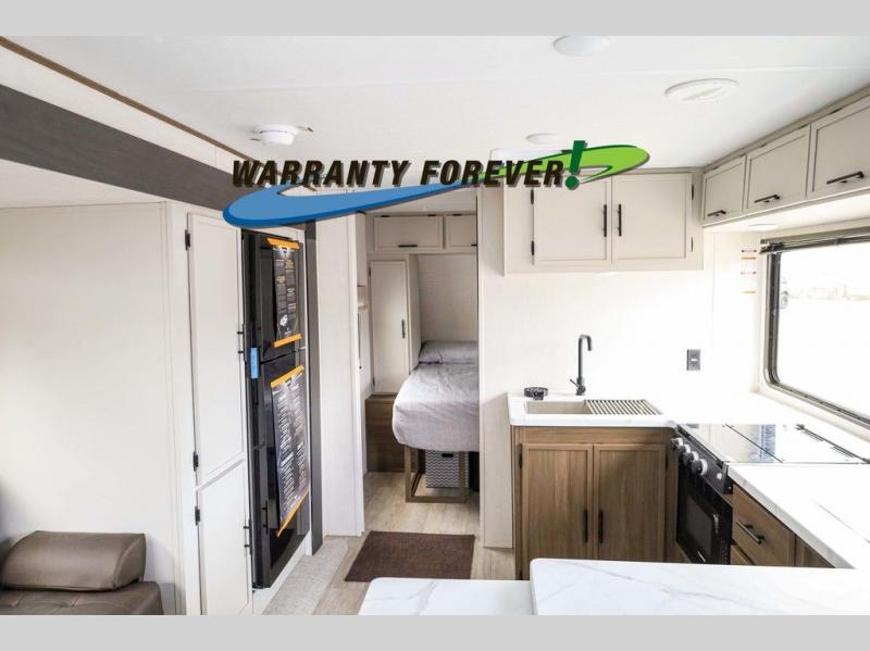 Head to your local state park in this spacious travel trailer! Once you arrive at the campground, you can grab a cold drink from the exterior refrigerator, then head inside to make lunch. An L-shaped counter with two stools provides a place to enjoy your morning coffee at, or you may find yourselves on the sofa within the slide out. The pantry and 12V refrigerator is also found here and can hold all your food for the week. You'll feel right at home in the front private bedroom that includes a camp king bed, dual wardrobes, and an overhead cabinet for even more storage. This model also includes washer and dryer prep if you choose to add those appliances!