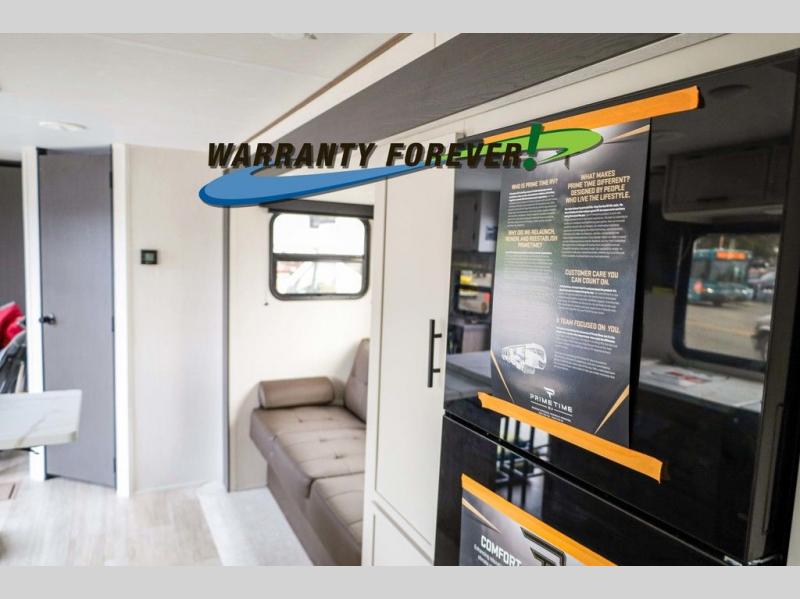 With any Avenger travel trailer by Prime Time RV, you will find innovation, a solid build, and comfort at every turn. Each model is built with Tuff Coat on the exterior metal, a fully enclosed underbelly, and a PVC roof membrane to help extend the life of your trailer. You will also find automotive name badging on the exterior, along with an exterior shower, front rail LED light strips, plus an XL padded entry grab handle to name a few conveniences. There are plenty of storage spaces inside, as well as Congoleum flooring and woven PVC marine grade slide out flooring, a designer shower surround, and seamless pressed countertops. You are sure to appreciate the onboard water filtration system, tankless water heater, plus 30K BTU furnace and 15K ducted A/C to help keep you comfortable.