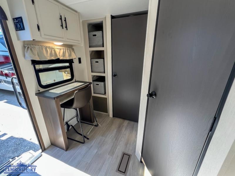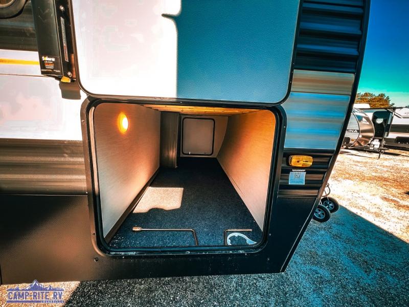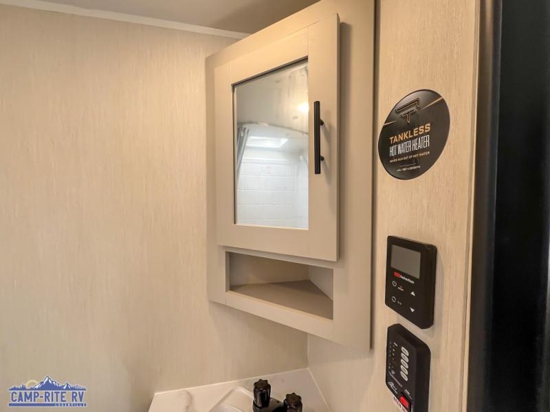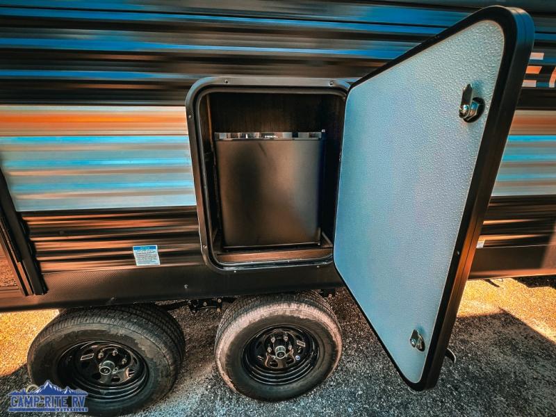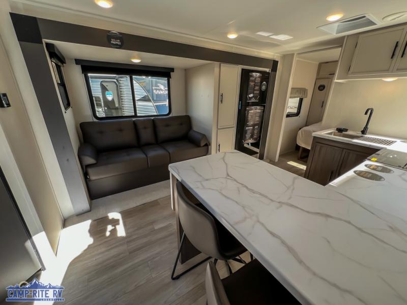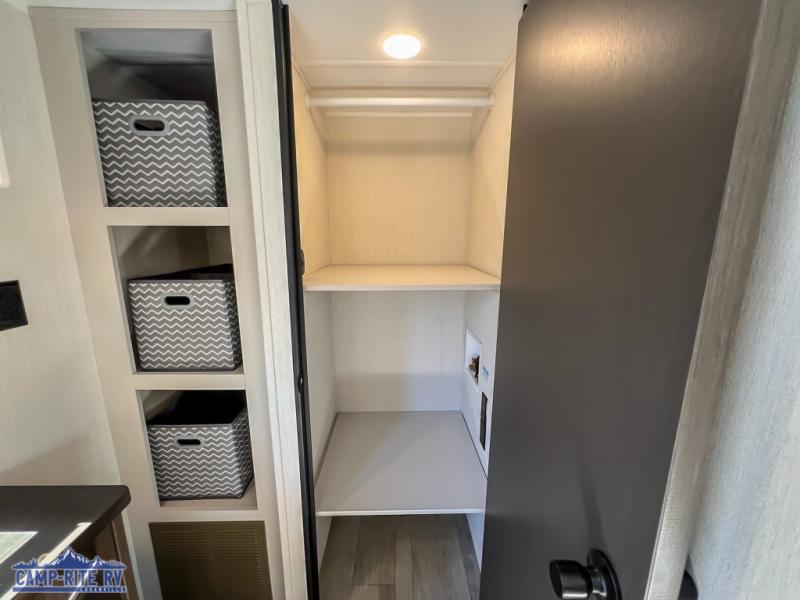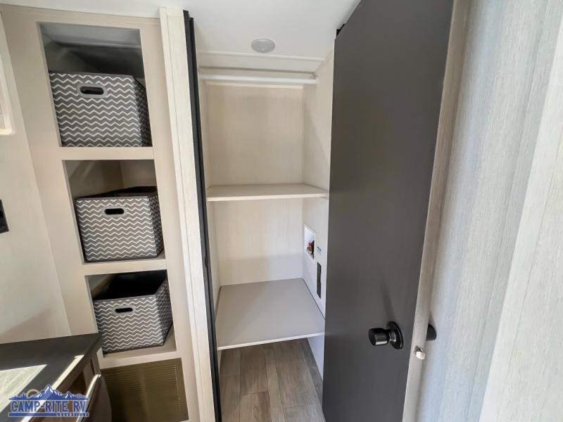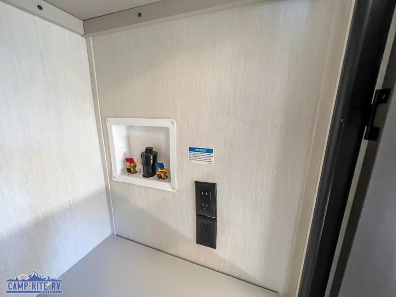 Head to your local state park in this spacious travel trailer! Once you arrive at the campground, you can grab a cold drink from the exterior refrigerator, then head inside to make lunch. An L-shaped counter with two stools provides a place to enjoy your morning coffee at, or you may find yourselves on the sofa within the slide out. The pantry and 12V refrigerator is also found here and can hold all your food for the week. You'll feel right at home in the front private bedroom that includes a camp king bed, dual wardrobes, and an overhead cabinet for even more storage. This model also includes washer and dryer prep if you choose to add those appliances!