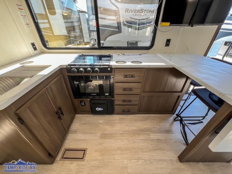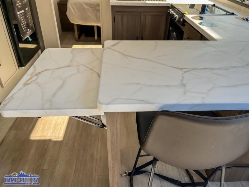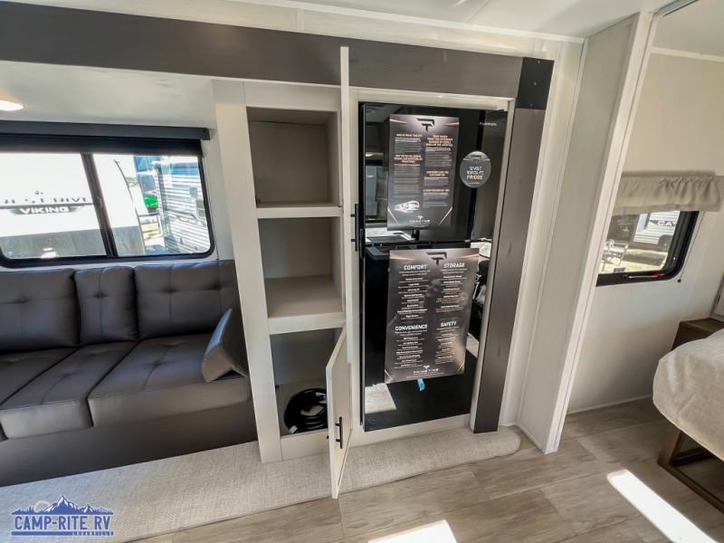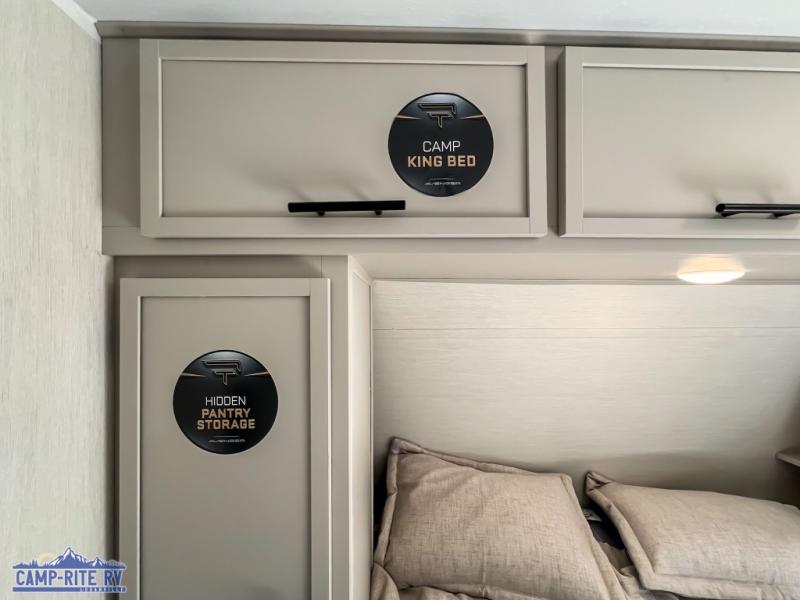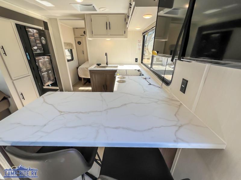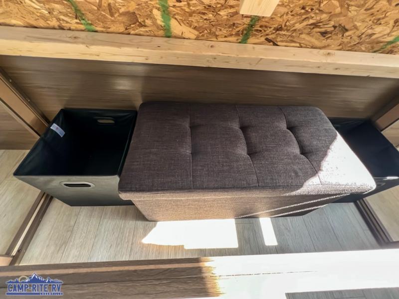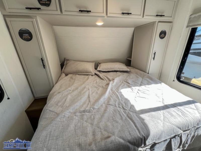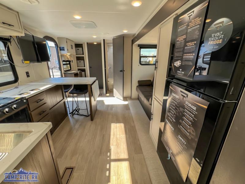 Head to your local state park in this spacious travel trailer! Once you arrive at the campground, you can grab a cold drink from the exterior refrigerator, then head inside to make lunch. An L-shaped counter with two stools provides a place to enjoy your morning coffee at, or you may find yourselves on the sofa within the slide out. The pantry and 12V refrigerator is also found here and can hold all your food for the week. You'll feel right at home in the front private bedroom that includes a camp king bed, dual wardrobes, and an overhead cabinet for even more storage. This model also includes washer and dryer prep if you choose to add those appliances!