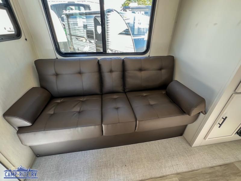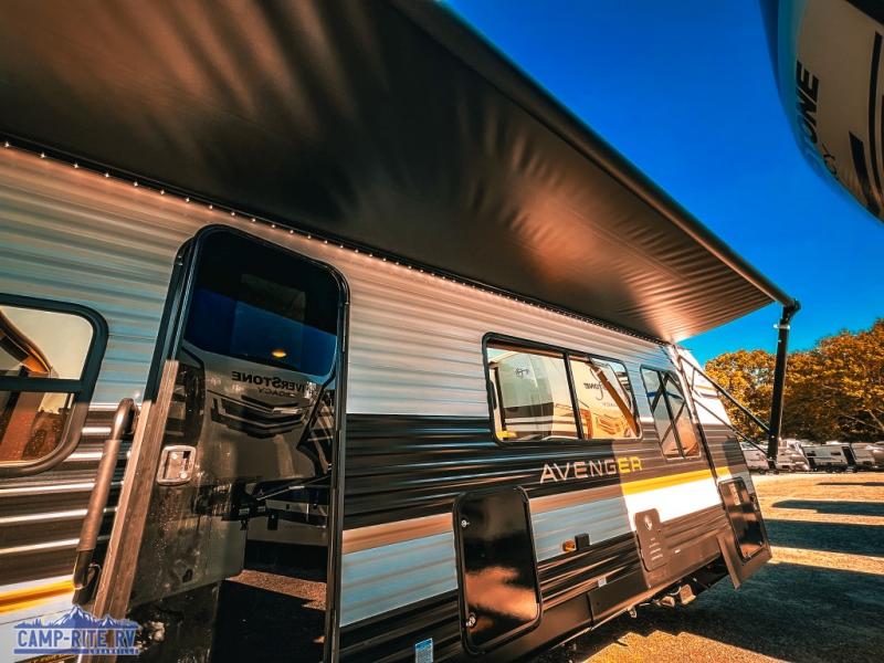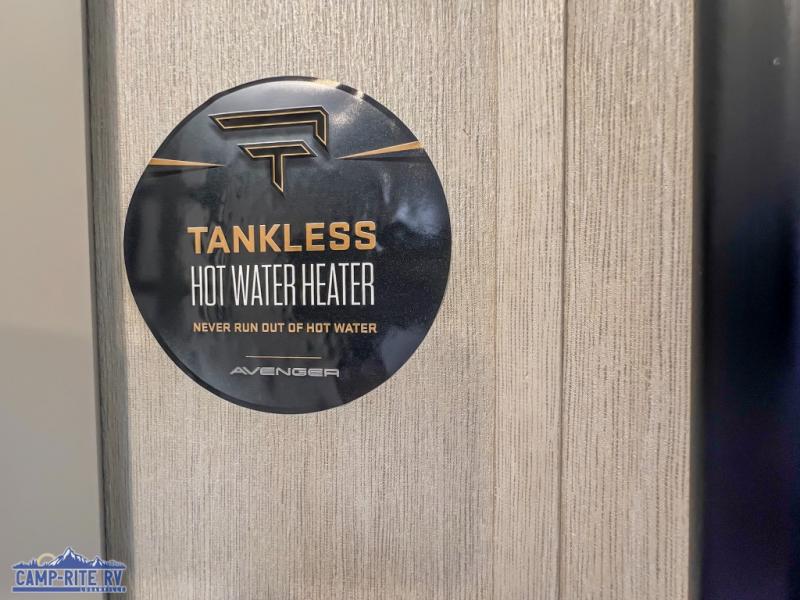 With any Avenger travel trailer by Prime Time RV, you will find innovation, a solid build, and comfort at every turn. Each model is built with Tuff Coat on the exterior metal, a fully enclosed underbelly, and a PVC roof membrane to help extend the life of your trailer. You will also find automotive name badging on the exterior, along with an exterior shower, front rail LED light strips, plus an XL padded entry grab handle to name a few conveniences. There are plenty of storage spaces inside, as well as Congoleum flooring and woven PVC marine grade slide out flooring, a designer shower surround, and seamless pressed countertops. You are sure to appreciate the onboard water filtration system, tankless water heater, plus 30K BTU furnace and 15K ducted A/C to help keep you comfortable.