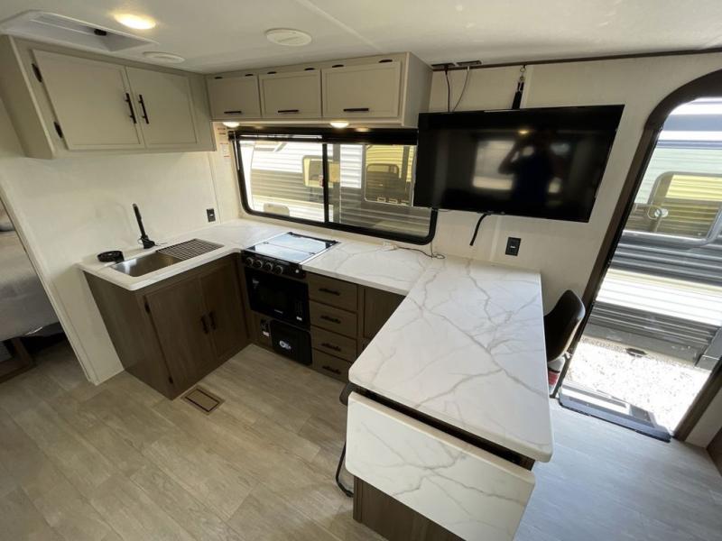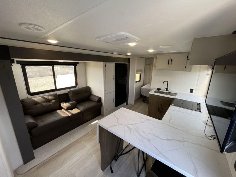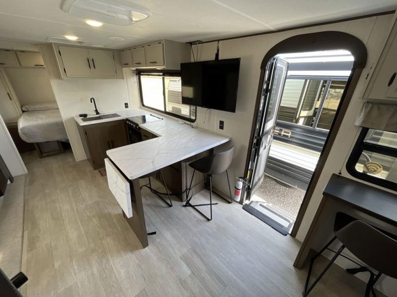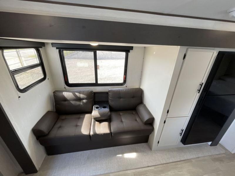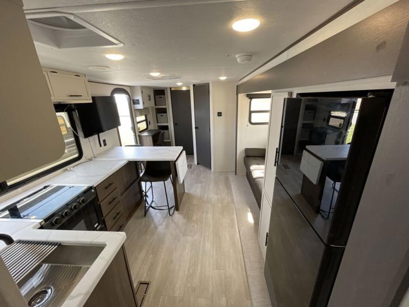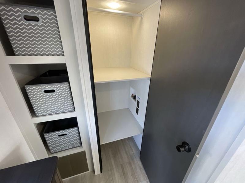 Head to your local state park in this spacious travel trailer! Once you arrive at the campground, you can grab a cold drink from the exterior refrigerator, then head inside to make lunch. An L-shaped counter with two stools provides a place to enjoy your morning coffee at, or you may find yourselves on the sofa within the slide out. The pantry and 12V refrigerator is also found here and can hold all your food for the week. You'll feel right at home in the front private bedroom that includes a camp king bed, dual wardrobes, and an overhead cabinet for even more storage. This model also includes washer and dryer prep if you choose to add those appliances!