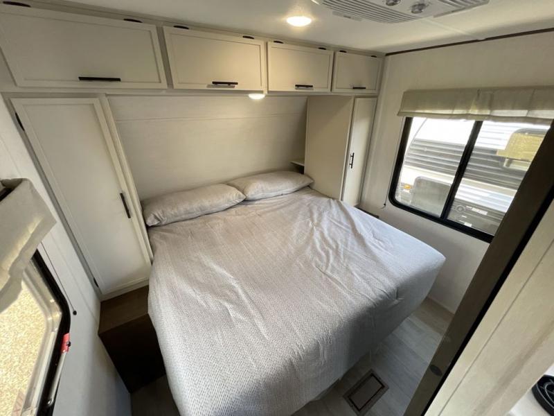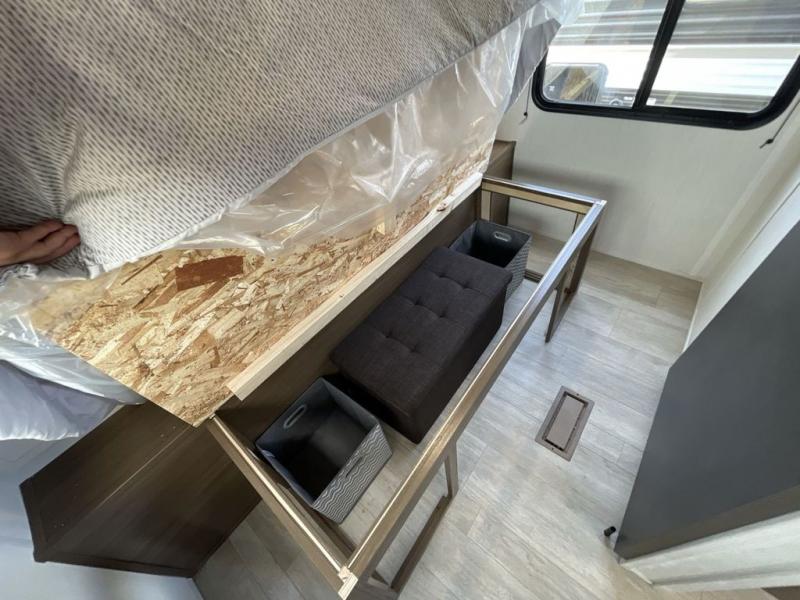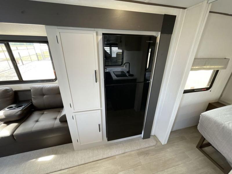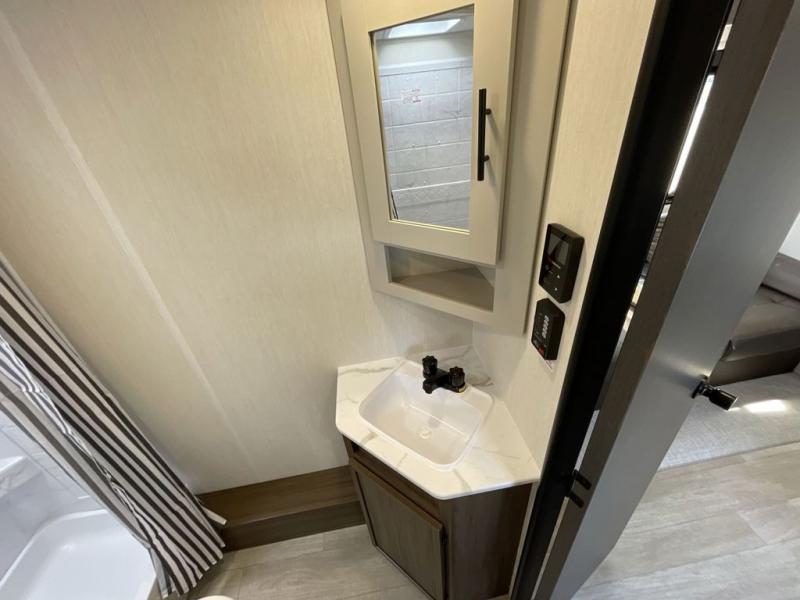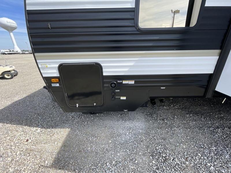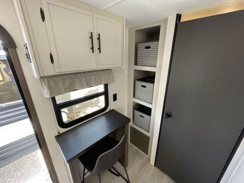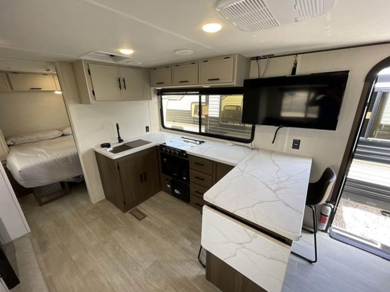 Head to your local state park in this spacious travel trailer! Once you arrive at the campground, you can grab a cold drink from the exterior refrigerator, then head inside to make lunch. An L-shaped counter with two stools provides a place to enjoy your morning coffee at, or you may find yourselves on the sofa within the slide out. The pantry and 12V refrigerator is also found here and can hold all your food for the week. You'll feel right at home in the front private bedroom that includes a camp king bed, dual wardrobes, and an overhead cabinet for even more storage. This model also includes washer and dryer prep if you choose to add those appliances!