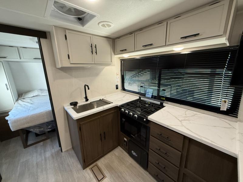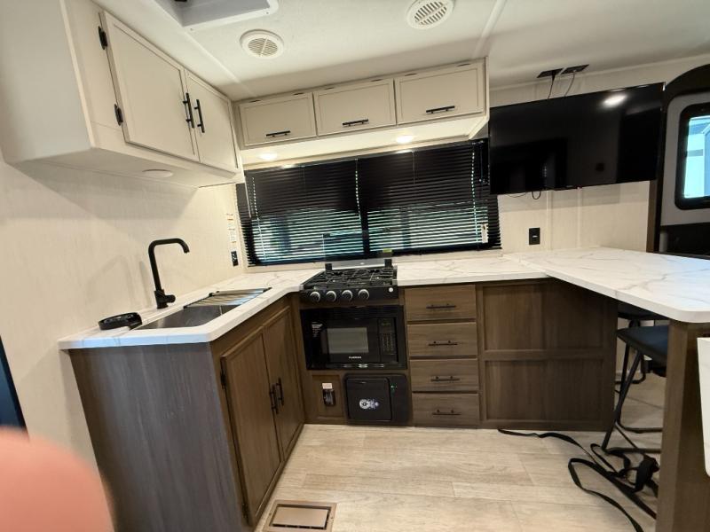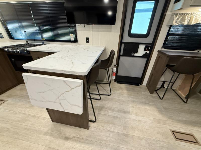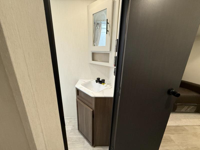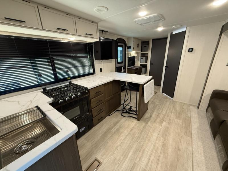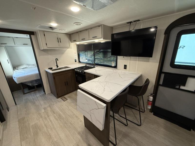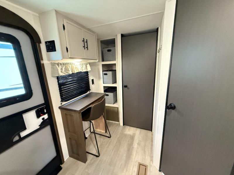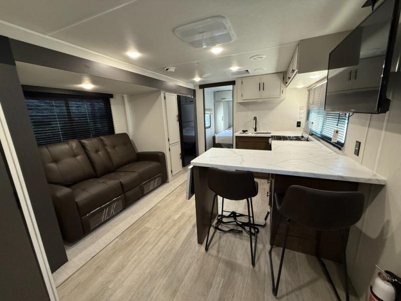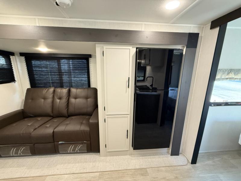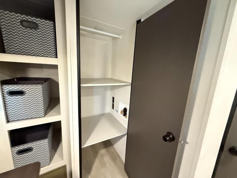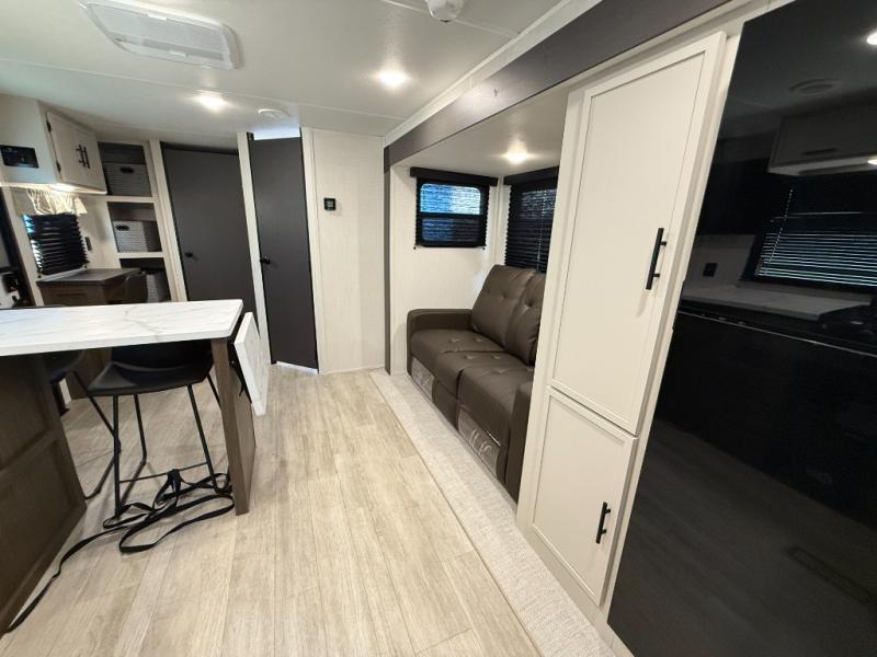 Head to your local state park in this spacious travel trailer! Once you arrive at the campground, you can grab a cold drink from the exterior refrigerator, then head inside to make lunch. An L-shaped counter with two stools provides a place to enjoy your morning coffee at, or you may find yourselves on the sofa within the slide out. The pantry and 12V refrigerator is also found here and can hold all your food for the week. You'll feel right at home in the front private bedroom that includes a camp king bed, dual wardrobes, and an overhead cabinet for even more storage. This model also includes washer and dryer prep if you choose to add those appliances!