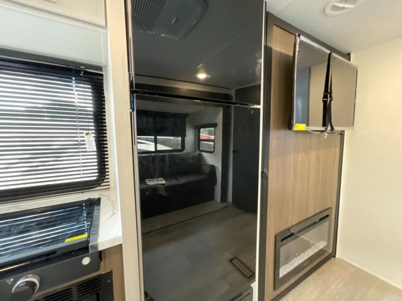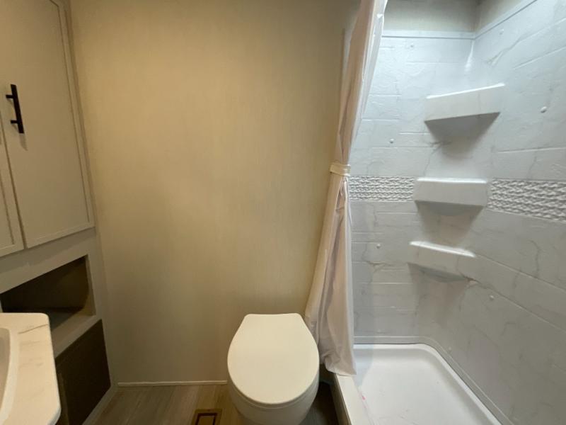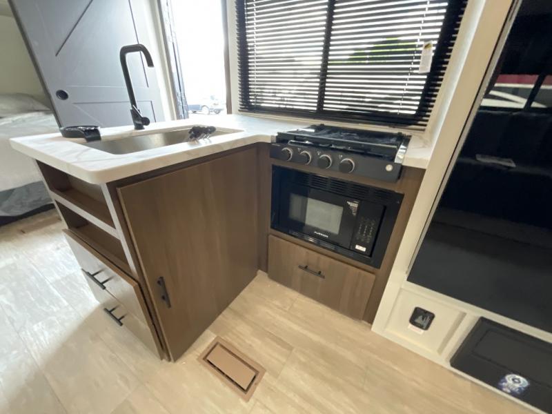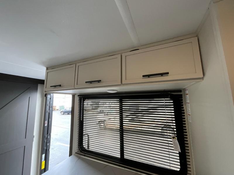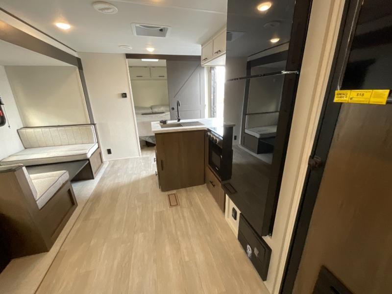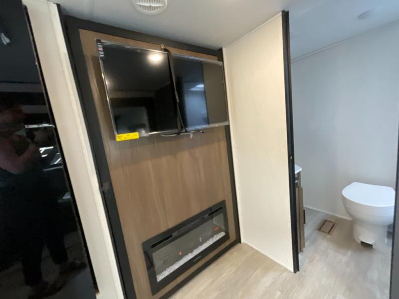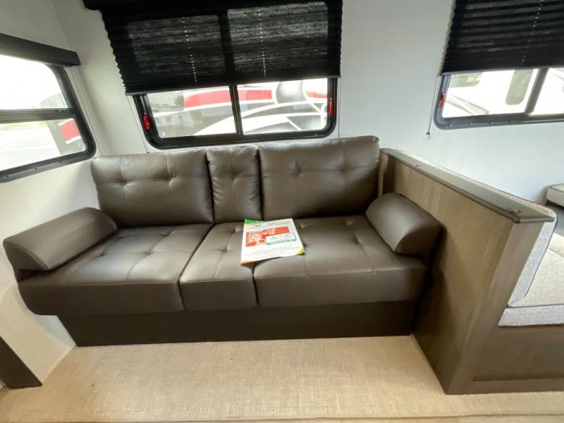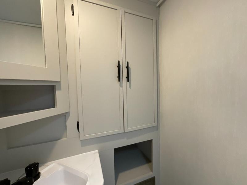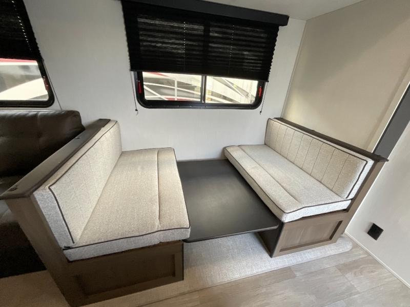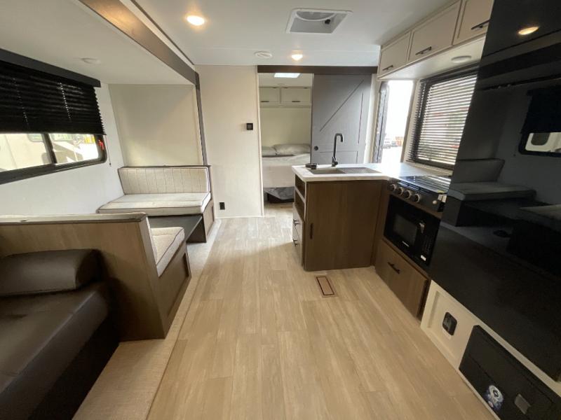 Step inside and discover a thoughtfully crafted interior that maximizes space and livability. The rear kitchen layout features modern appliances, ample countertop space, and plenty of cabinetry, making meal prep easy and enjoyable. The front bedroom provides a cozy queen bed with convenient storage, creating a private retreat at the end of the day. A comfortable dinette serves as a perfect spot to enjoy meals, relax, or convert into extra sleeping space when needed. The full bathroom includes a shower and practical storage, ensuring comfort for everyone on the road.