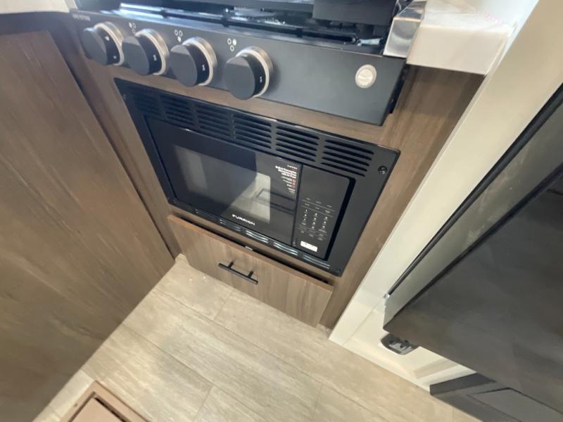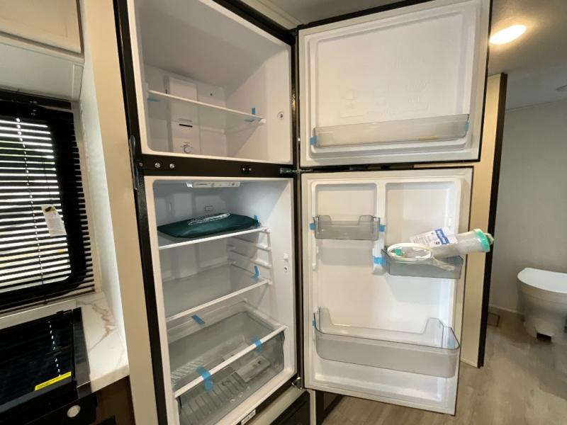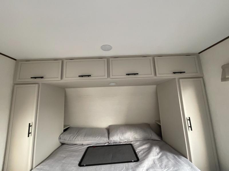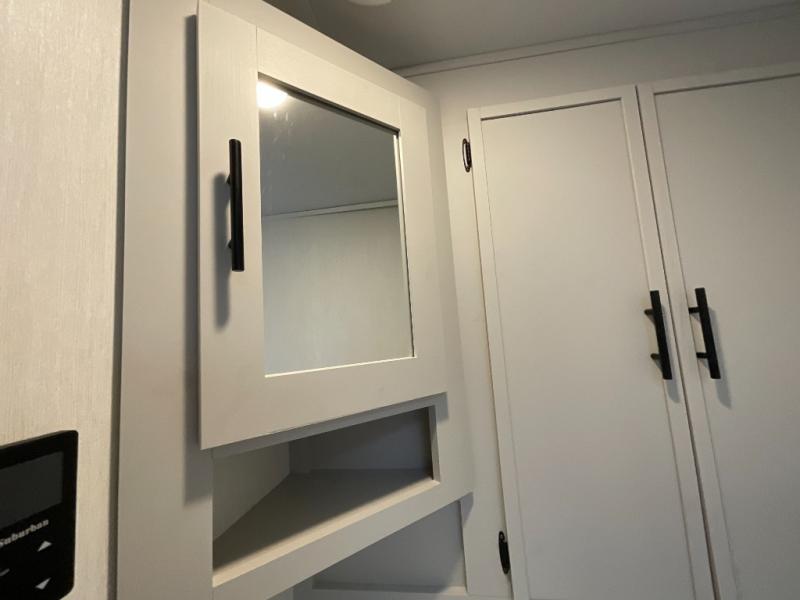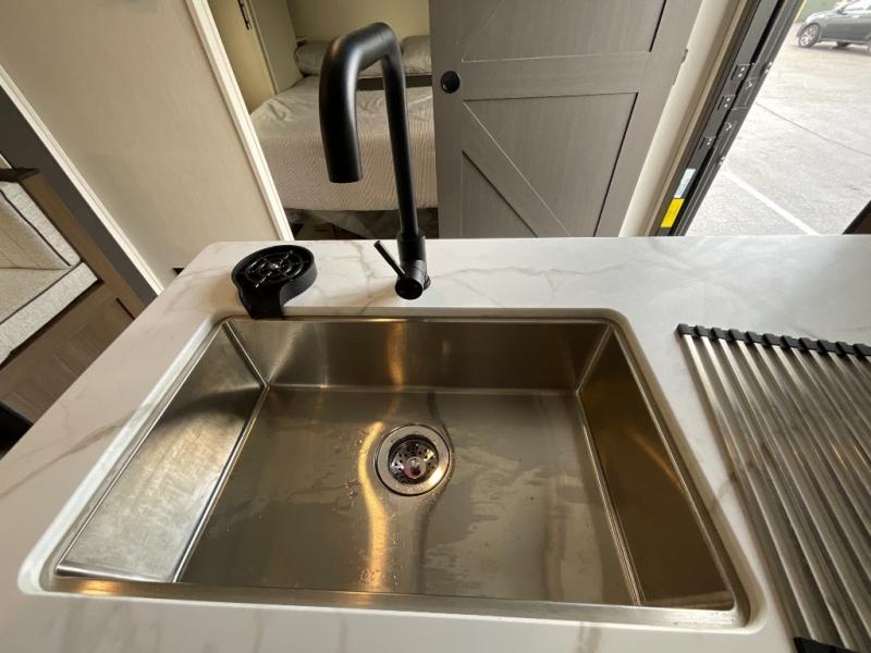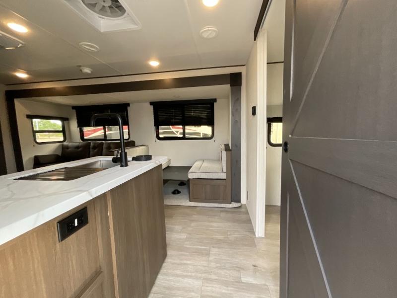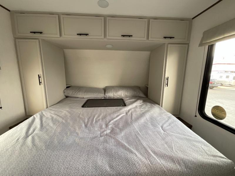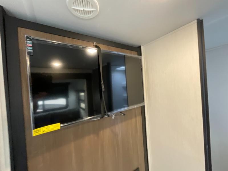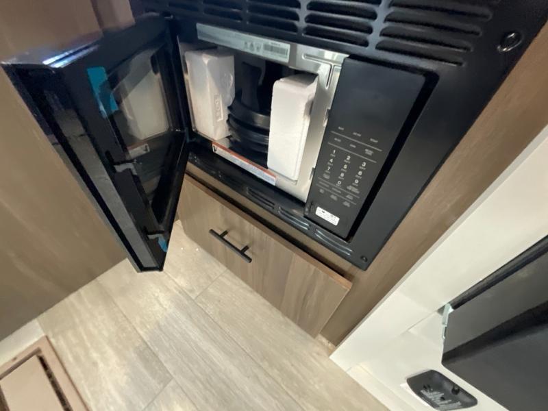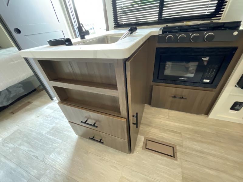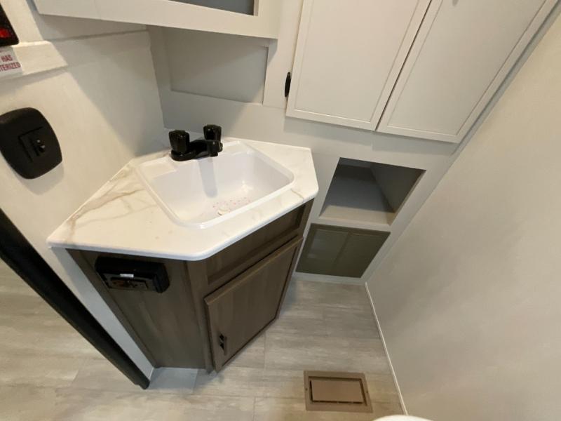 Step inside and discover a thoughtfully crafted interior that maximizes space and livability. The rear kitchen layout features modern appliances, ample countertop space, and plenty of cabinetry, making meal prep easy and enjoyable. The front bedroom provides a cozy queen bed with convenient storage, creating a private retreat at the end of the day. A comfortable dinette serves as a perfect spot to enjoy meals, relax, or convert into extra sleeping space when needed. The full bathroom includes a shower and practical storage, ensuring comfort for everyone on the road.