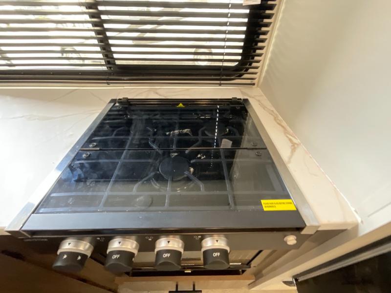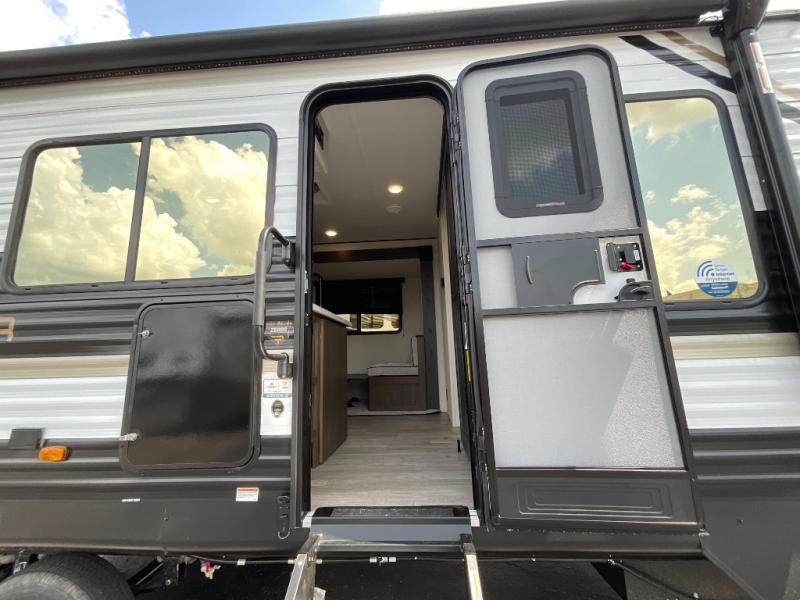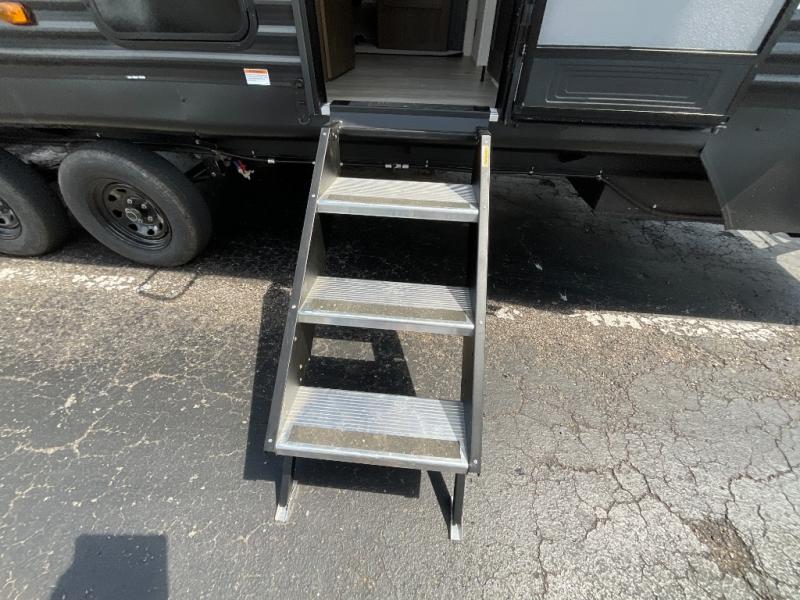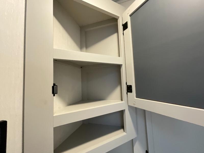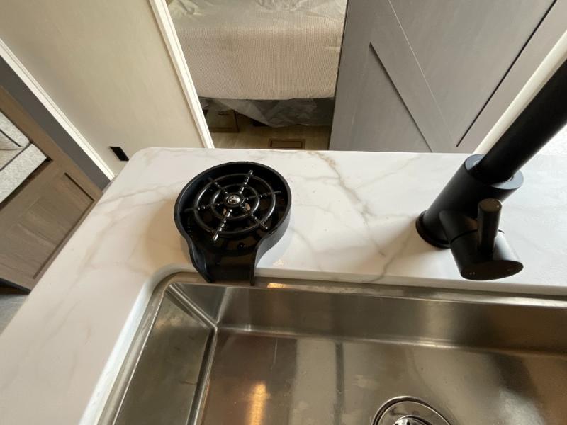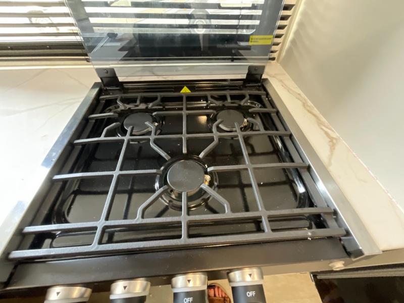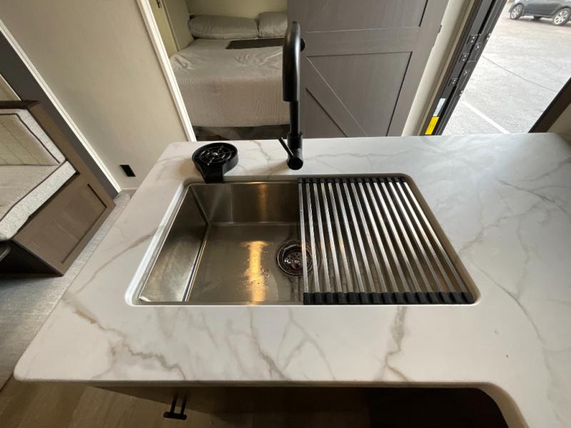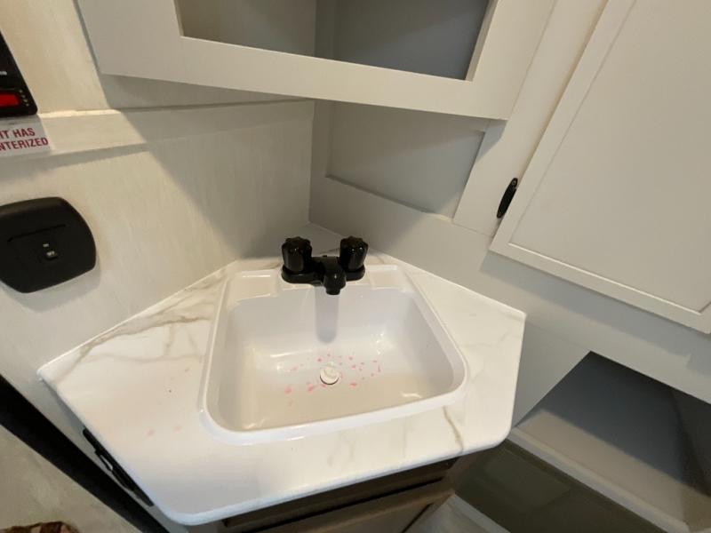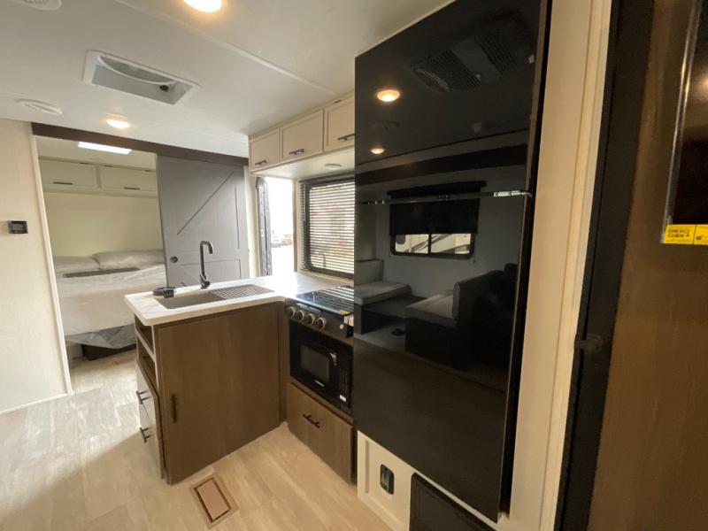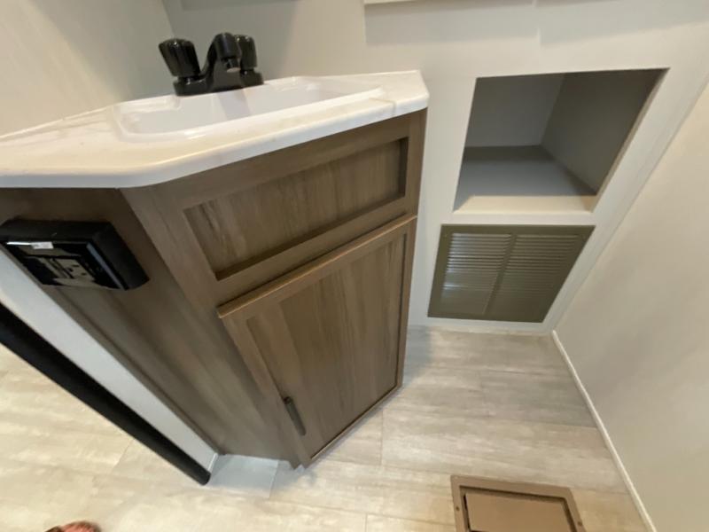 Step inside and discover a thoughtfully crafted interior that maximizes space and livability. The rear kitchen layout features modern appliances, ample countertop space, and plenty of cabinetry, making meal prep easy and enjoyable. The front bedroom provides a cozy queen bed with convenient storage, creating a private retreat at the end of the day. A comfortable dinette serves as a perfect spot to enjoy meals, relax, or convert into extra sleeping space when needed. The full bathroom includes a shower and practical storage, ensuring comfort for everyone on the road.