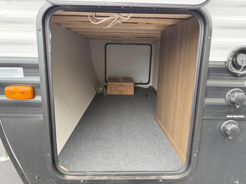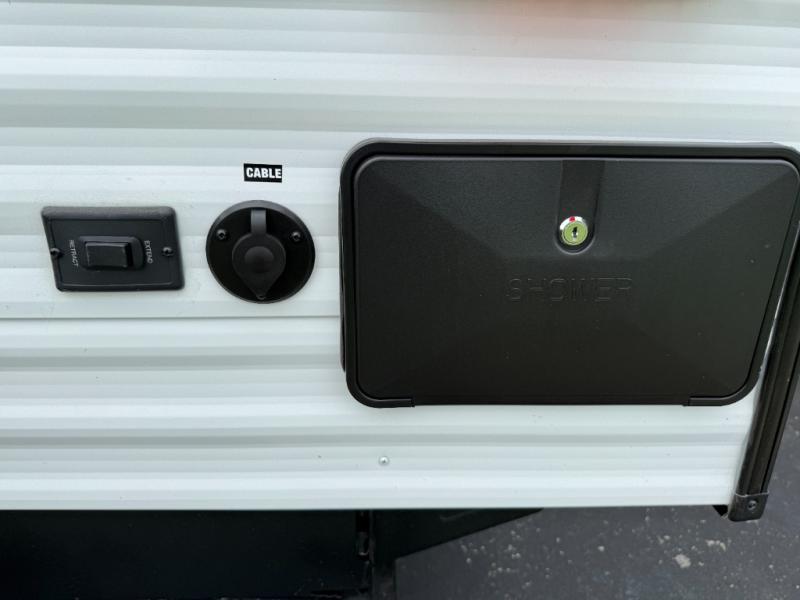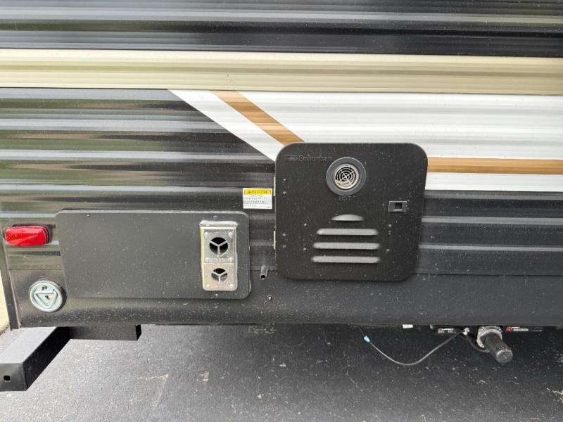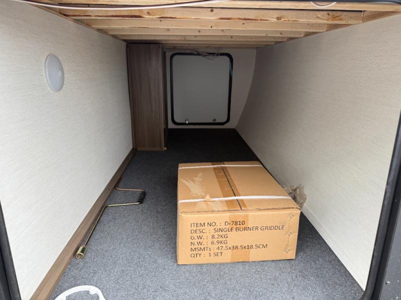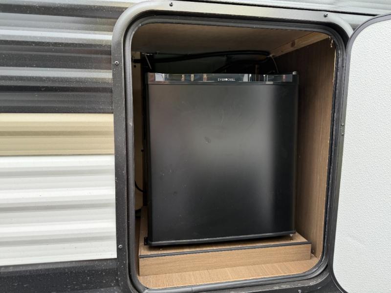 You'll appreciate the added space in this travel trailer thanks to the large slide out! The booth dinette and sofa are found here, and there is a moveable storage ottoman for extra blankets or board games. You'll have your own space up front in the private bedroom, complete with a camp king bed and storage for your things. The chef of your group will find a three burner cooktop and a built-in convection microwave with an air fryer to cook meals, plus there is a 12V refrigerator and hidden pantry for food storage. This unit also includes a power awning outdoors and an outside refrigerator to keep cold drinks close by.