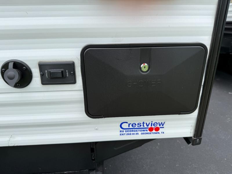 You'll appreciate the added space in this travel trailer thanks to the large slide out! The booth dinette and sofa are found here, and there is a moveable storage ottoman for extra blankets or board games. You'll have your own space up front in the private bedroom, complete with a camp king bed and storage for your things. The chef of your group will find a three burner cooktop and a built-in convection microwave with an air fryer to cook meals, plus there is a 12V refrigerator and hidden pantry for food storage. This unit also includes a power awning outdoors and an outside refrigerator to keep cold drinks close by.