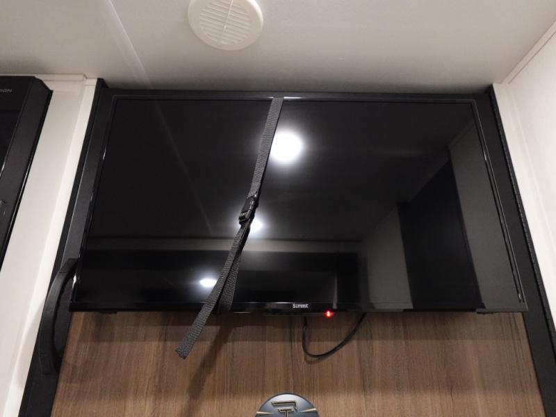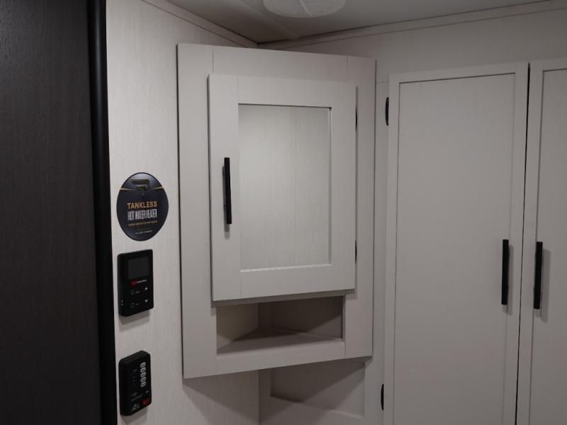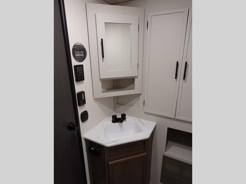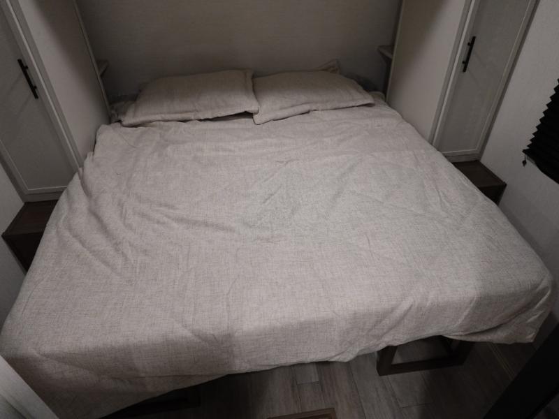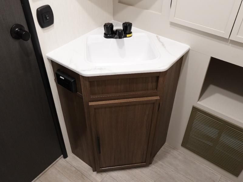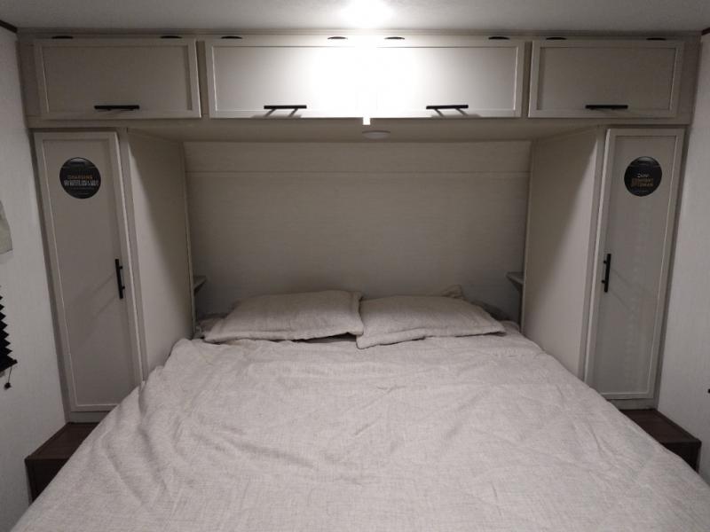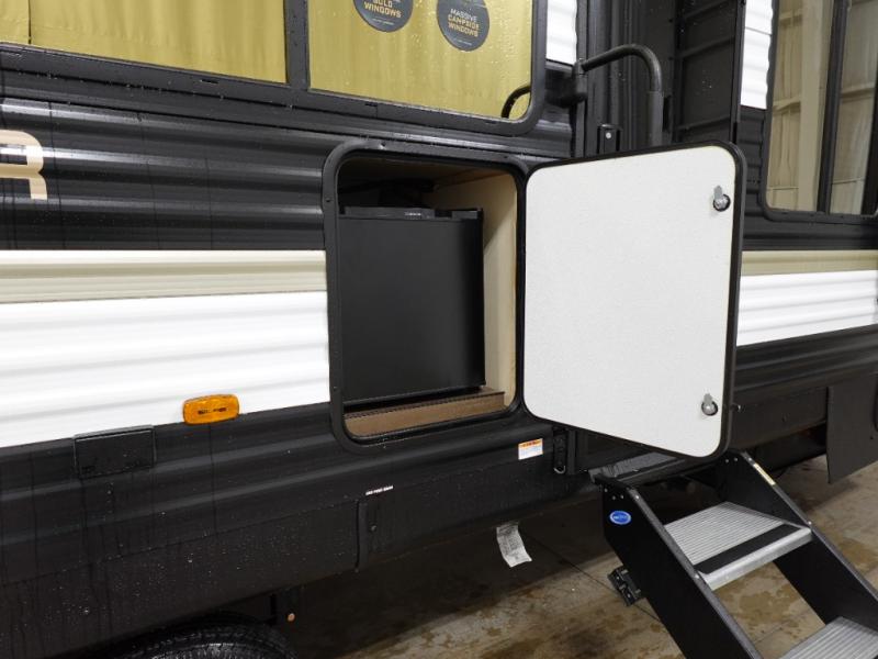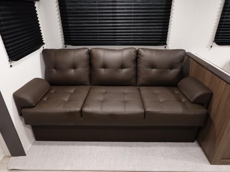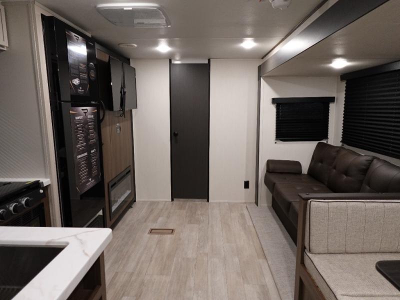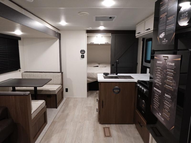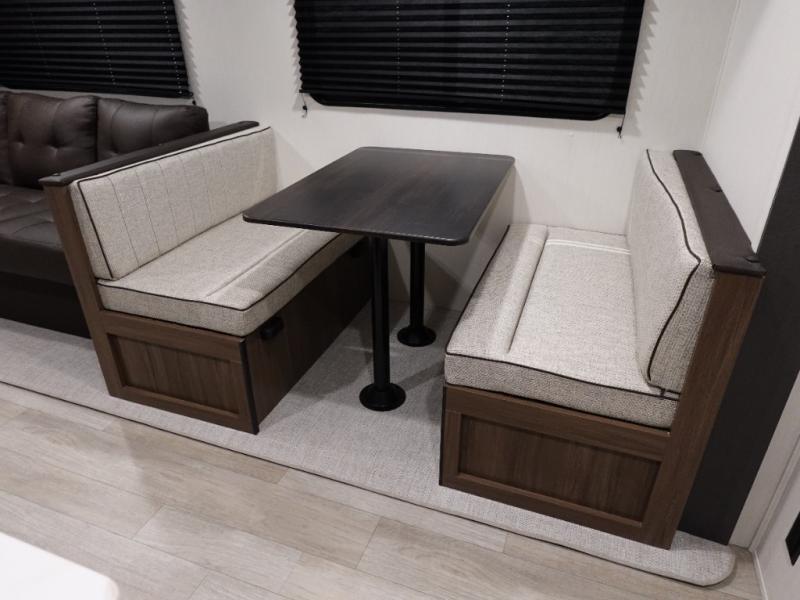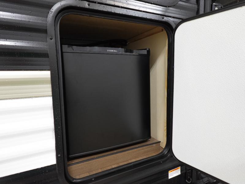 You'll appreciate the added space in this travel trailer thanks to the large slide out! The booth dinette and sofa are found here, and there is a moveable storage ottoman for extra blankets or board games. You'll have your own space up front in the private bedroom, complete with a camp king bed and storage for your things. The chef of your group will find a three burner cooktop and a built-in convection microwave with an air fryer to cook meals, plus there is a 12V refrigerator and hidden pantry for food storage. This unit also includes a power awning outdoors and an outside refrigerator to keep cold drinks close by.