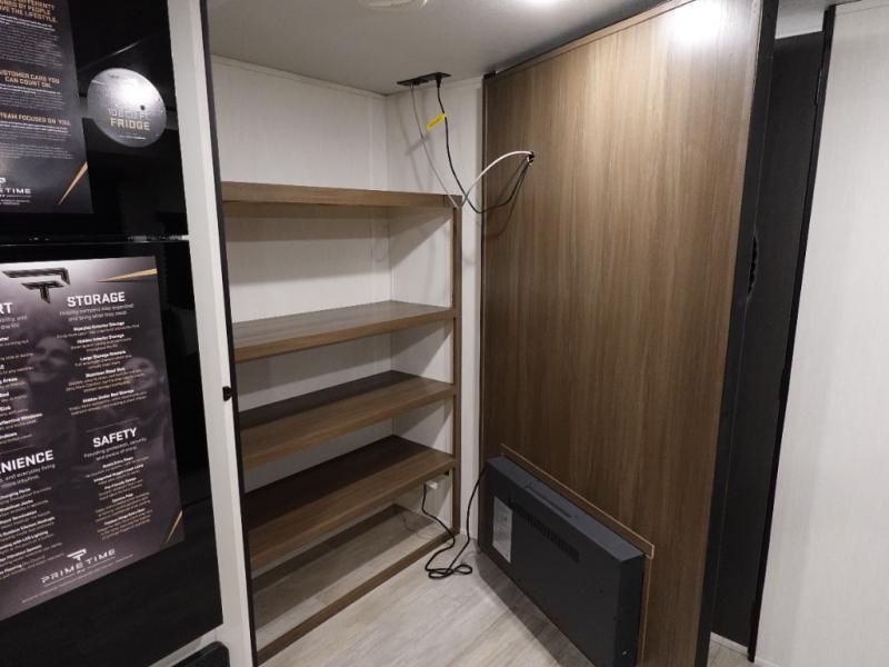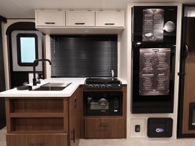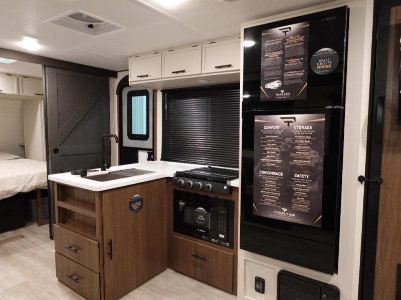 With any Avenger travel trailer by Prime Time RV, you will find innovation, a solid build, and comfort at every turn. Each model is built with Tuff Coat on the exterior metal, a fully enclosed underbelly, and a PVC roof membrane to help extend the life of your trailer. You will also find automotive name badging on the exterior, along with an exterior shower, front rail LED light strips, plus an XL padded entry grab handle to name a few conveniences. There are plenty of storage spaces inside, as well as Congoleum flooring and woven PVC marine grade slide out flooring, a designer shower surround, and seamless pressed countertops. You are sure to appreciate the onboard water filtration system, tankless water heater, plus 30K BTU furnace and 15K ducted A/C to help keep you comfortable.