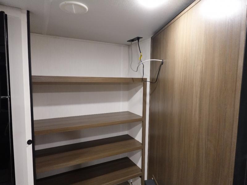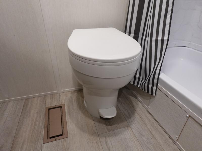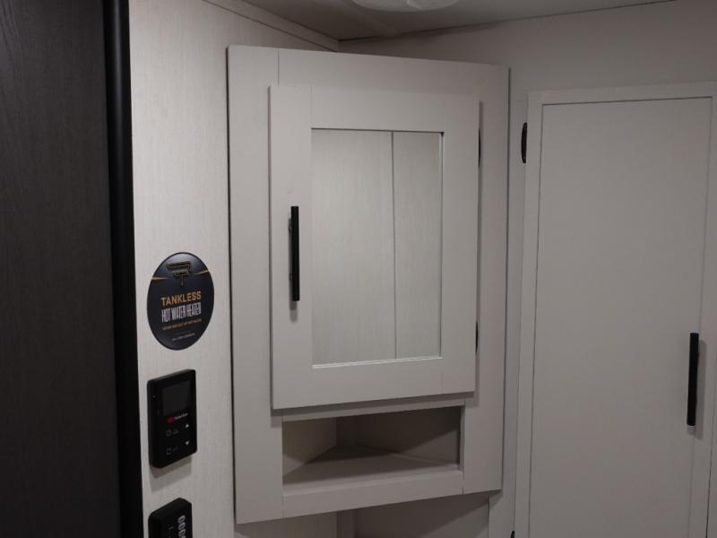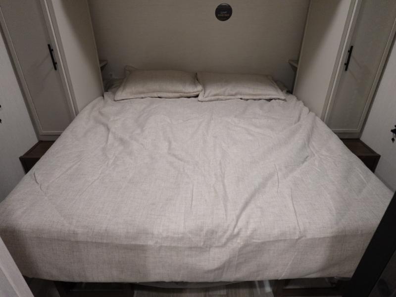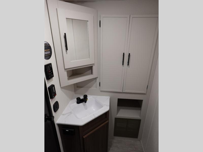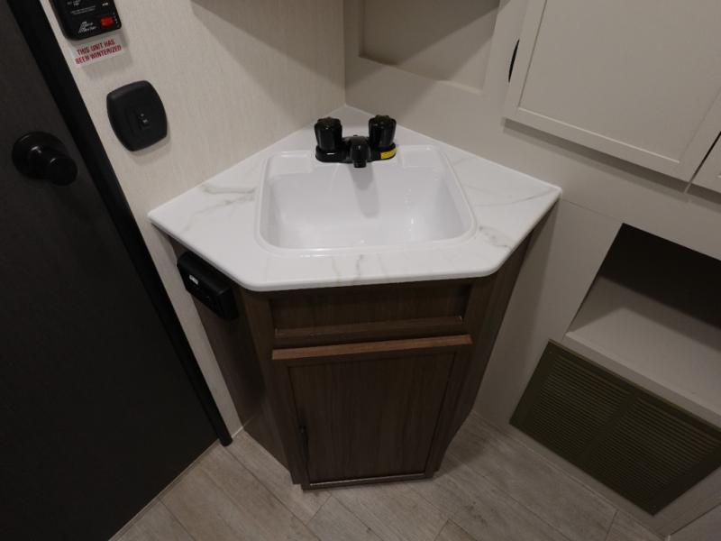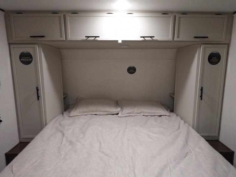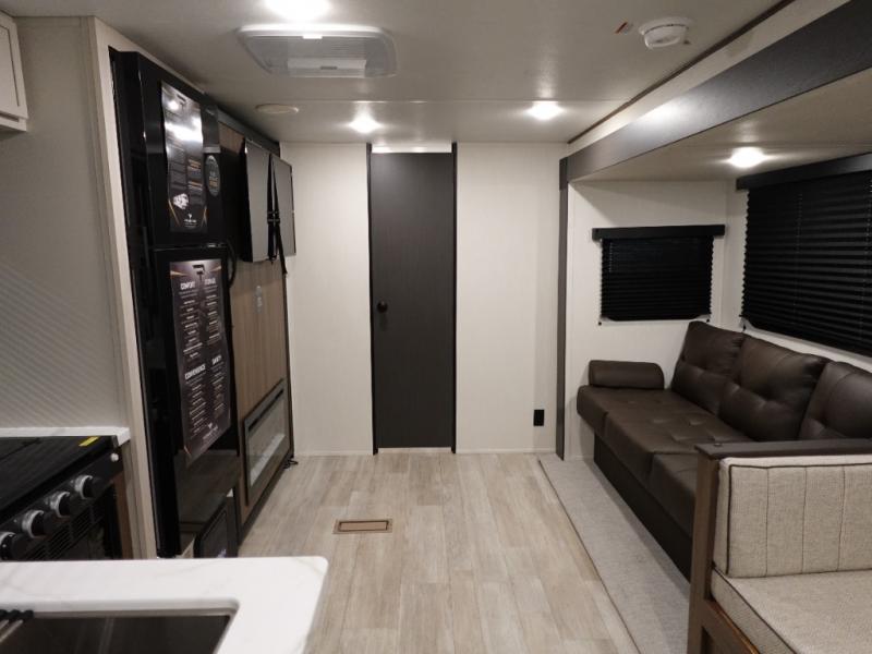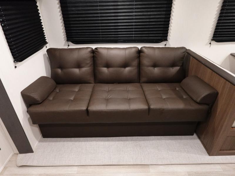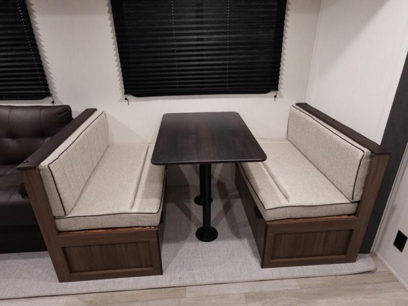 You'll appreciate the added space in this travel trailer thanks to the large slide out! The booth dinette and sofa are found here, and there is a moveable storage ottoman for extra blankets or board games. You'll have your own space up front in the private bedroom, complete with a camp king bed and storage for your things. The chef of your group will find a three burner cooktop and a built-in convection microwave with an air fryer to cook meals, plus there is a 12V refrigerator and hidden pantry for food storage. This unit also includes a power awning outdoors and an outside refrigerator to keep cold drinks close by.