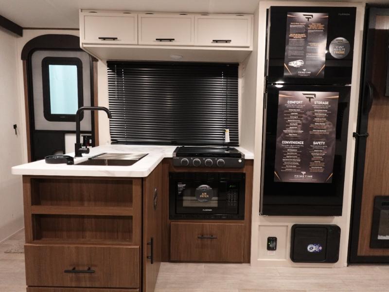 With any Avenger travel trailer by Prime Time RV, you will find innovation, a solid build, and comfort at every turn. Each model is built with Tuff Coat on the exterior metal, a fully enclosed underbelly, and a PVC roof membrane to help extend the life of your trailer. You will also find automotive name badging on the exterior, along with an exterior shower, front rail LED light strips, plus an XL padded entry grab handle to name a few conveniences. There are plenty of storage spaces inside, as well as Congoleum flooring and woven PVC marine grade slide out flooring, a designer shower surround, and seamless pressed countertops. You are sure to appreciate the onboard water filtration system, tankless water heater, plus 30K BTU furnace and 15K ducted A/C to help keep you comfortable.