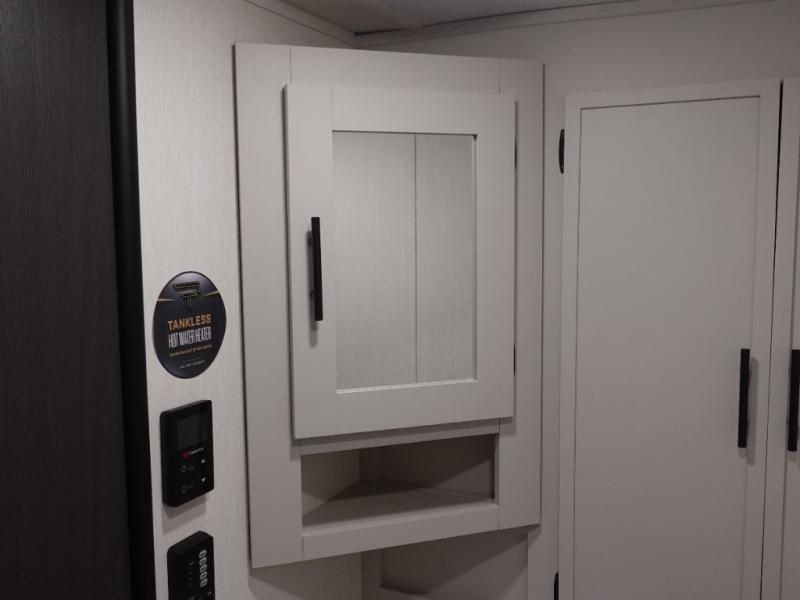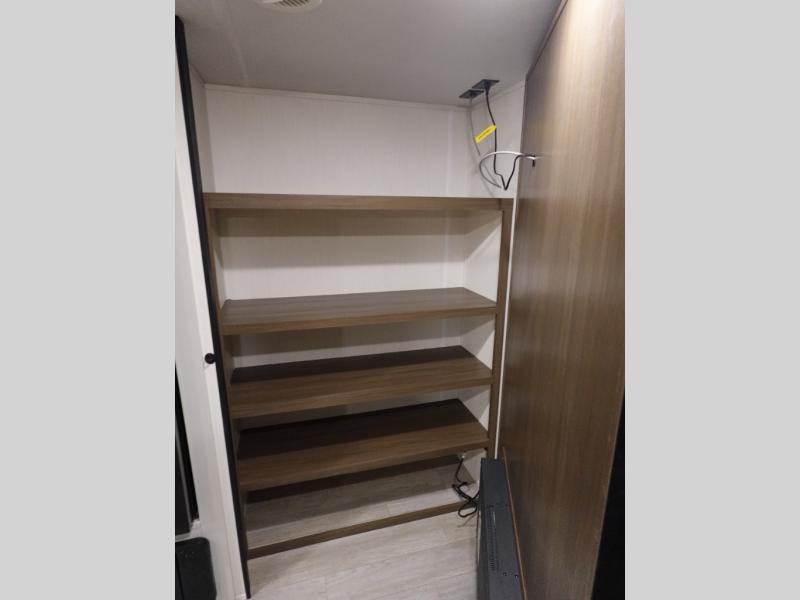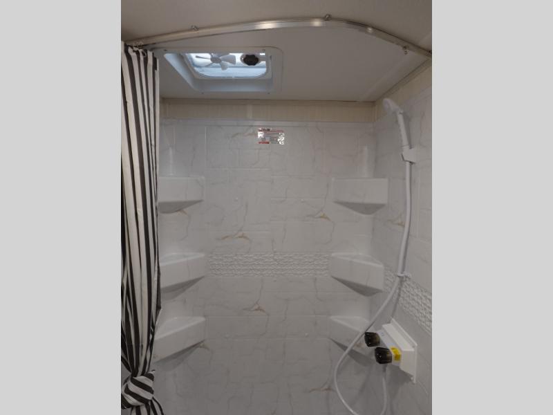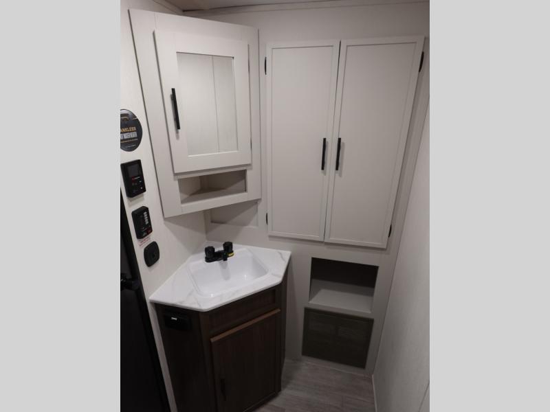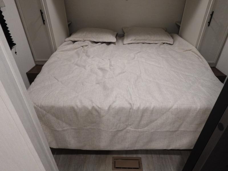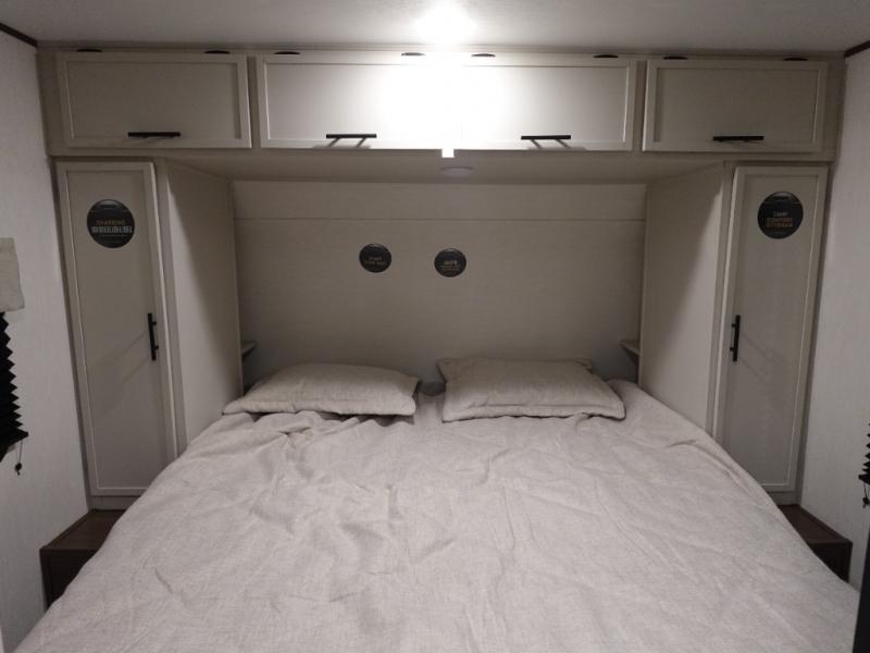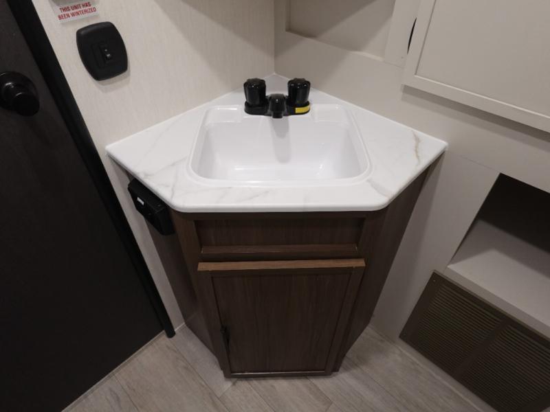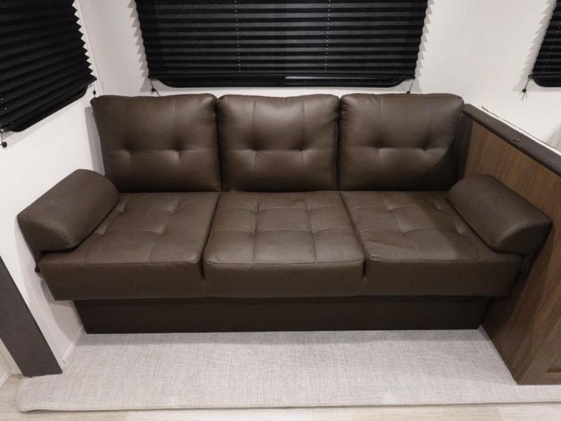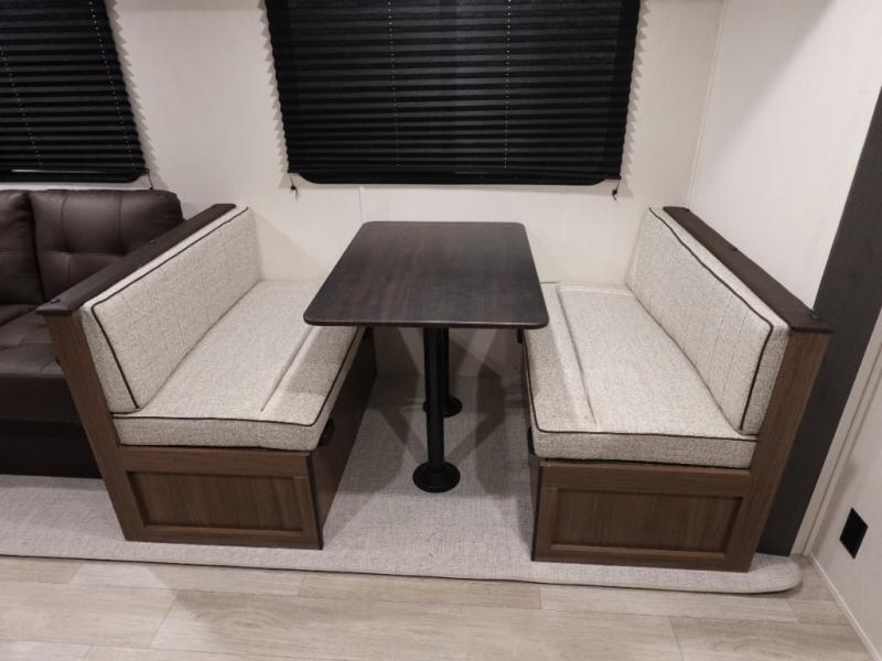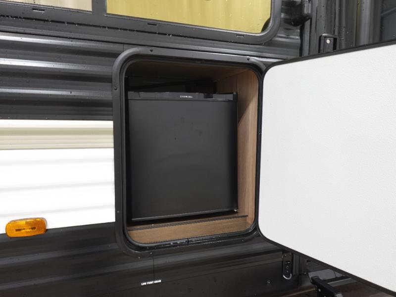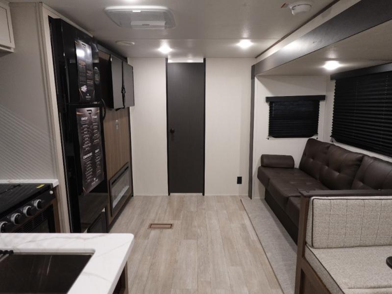 You'll appreciate the added space in this travel trailer thanks to the large slide out! The booth dinette and sofa are found here, and there is a moveable storage ottoman for extra blankets or board games. You'll have your own space up front in the private bedroom, complete with a camp king bed and storage for your things. The chef of your group will find a three burner cooktop and a built-in convection microwave with an air fryer to cook meals, plus there is a 12V refrigerator and hidden pantry for food storage. This unit also includes a power awning outdoors and an outside refrigerator to keep cold drinks close by.