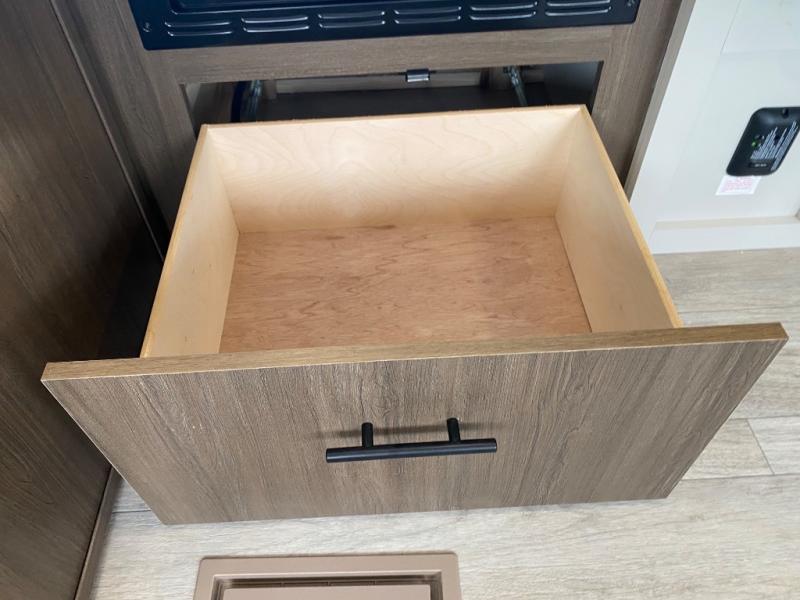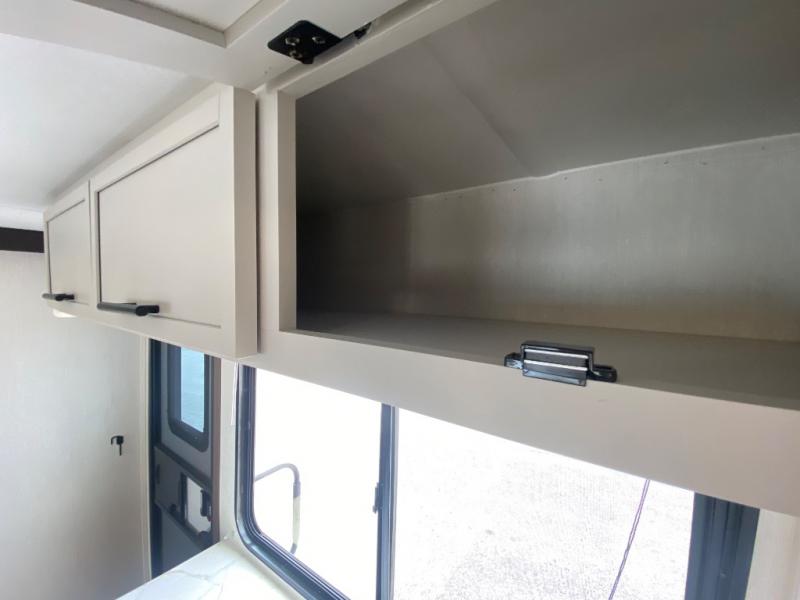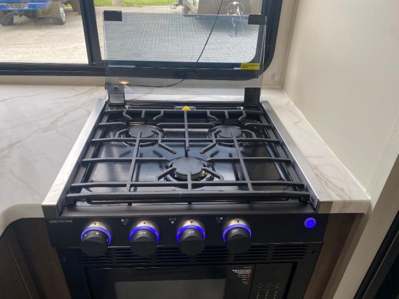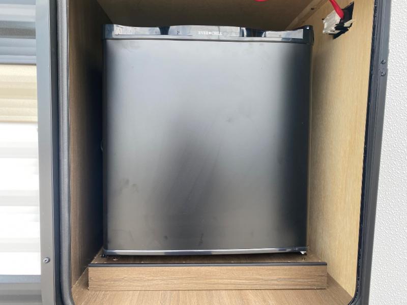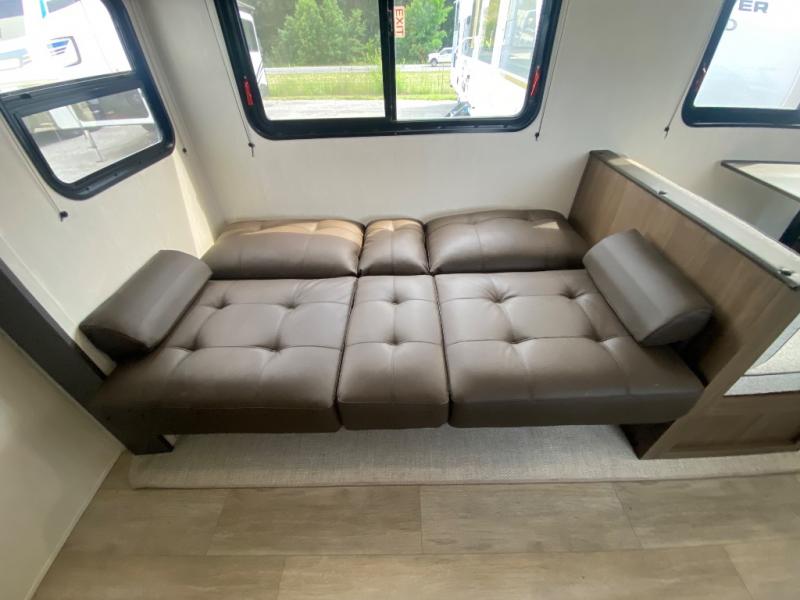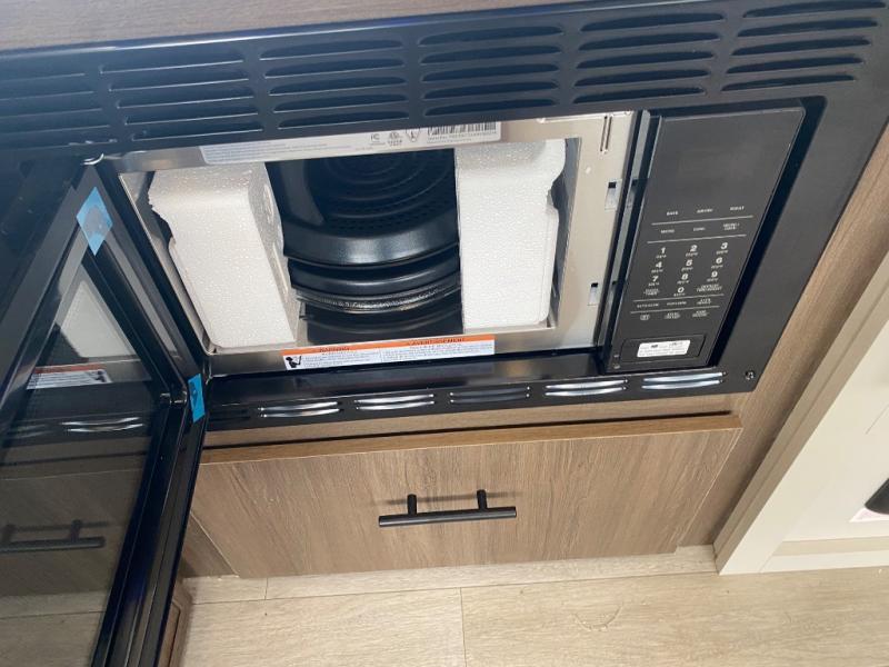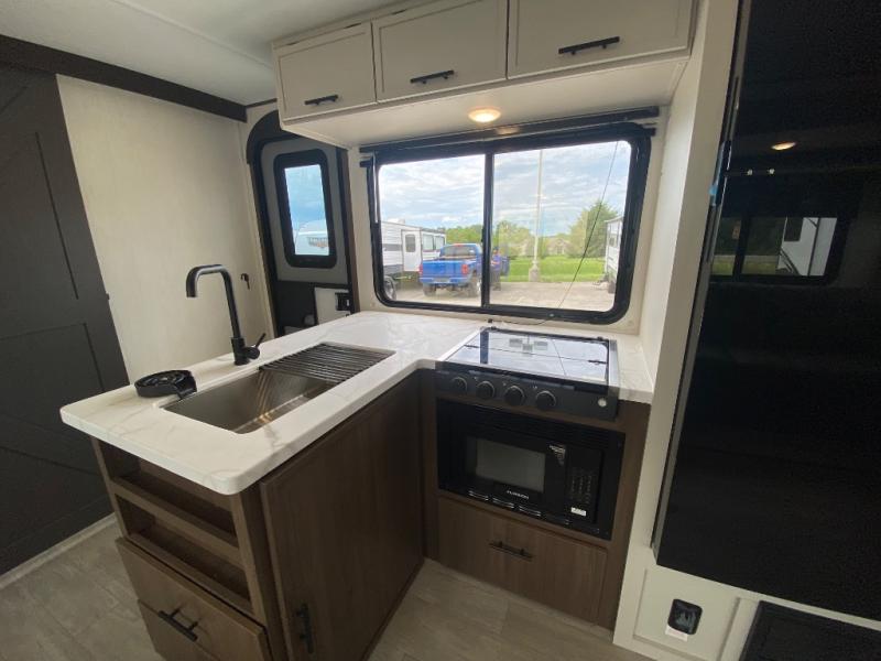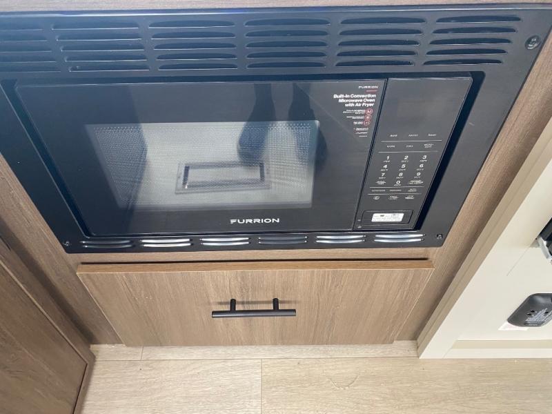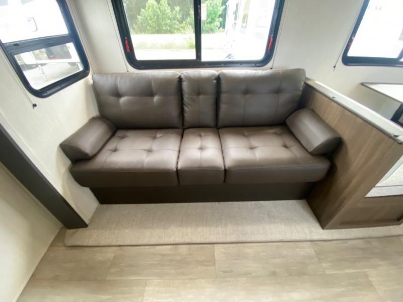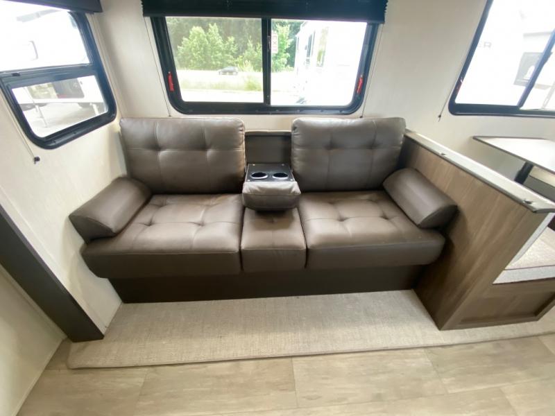 You'll appreciate the added space in this travel trailer thanks to the large slide out! The booth dinette and sofa are found here, and there is a moveable storage ottoman for extra blankets or board games. You'll have your own space up front in the private bedroom, complete with a camp king bed and storage for your things. The chef of your group will find a three burner cooktop and a built-in convection microwave with an air fryer to cook meals, plus there is a 12V refrigerator and hidden pantry for food storage. This unit also includes a power awning outdoors and an outside refrigerator to keep cold drinks close by.