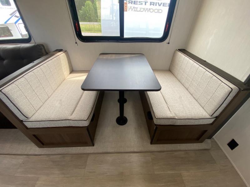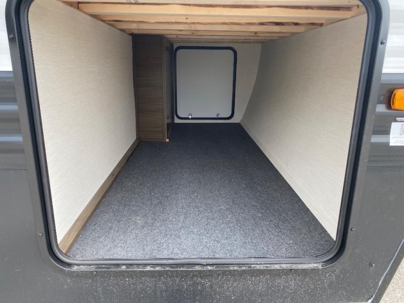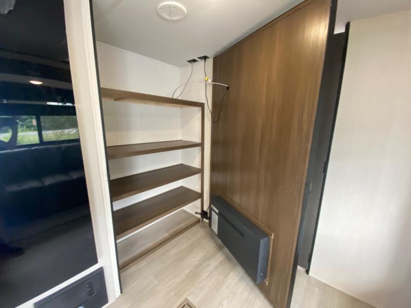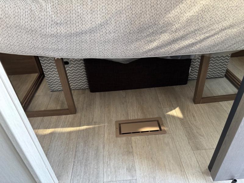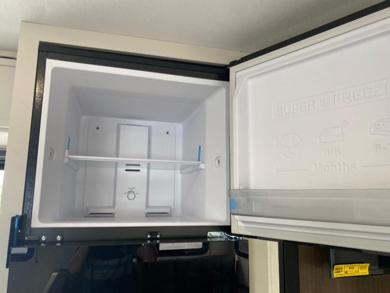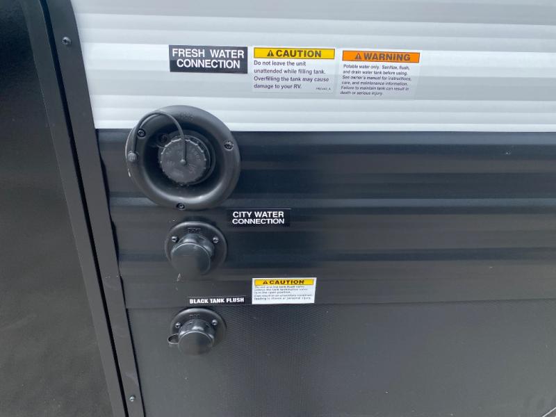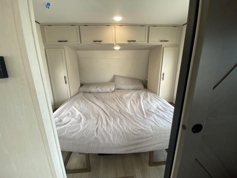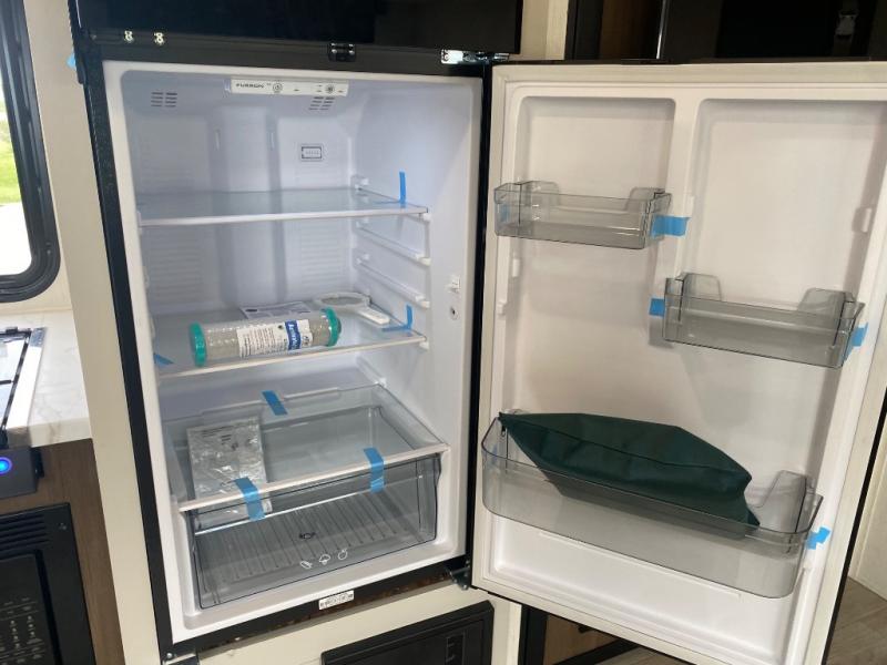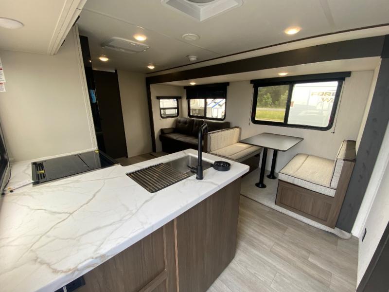 You'll appreciate the added space in this travel trailer thanks to the large slide out! The booth dinette and sofa are found here, and there is a moveable storage ottoman for extra blankets or board games. You'll have your own space up front in the private bedroom, complete with a camp king bed and storage for your things. The chef of your group will find a three burner cooktop and a built-in convection microwave with an air fryer to cook meals, plus there is a 12V refrigerator and hidden pantry for food storage. This unit also includes a power awning outdoors and an outside refrigerator to keep cold drinks close by.