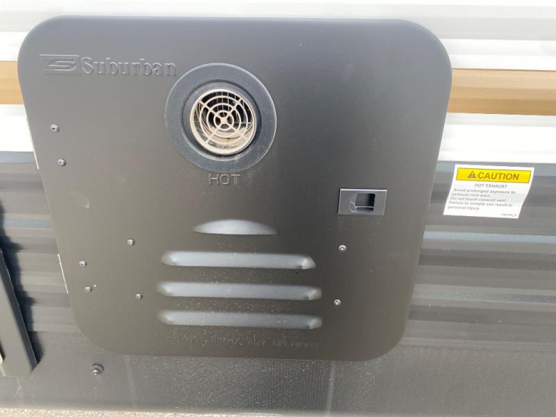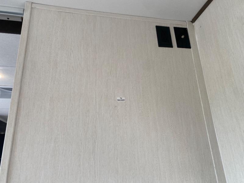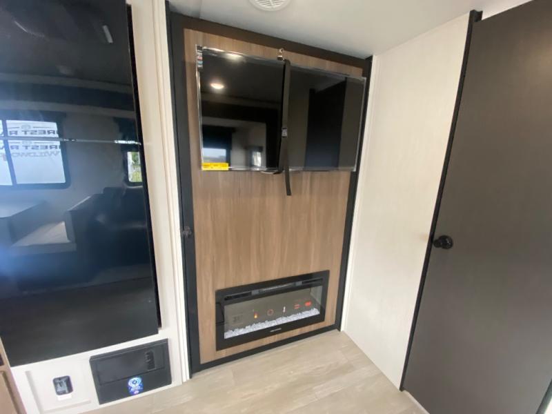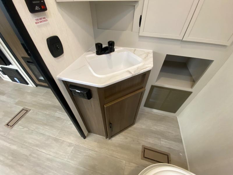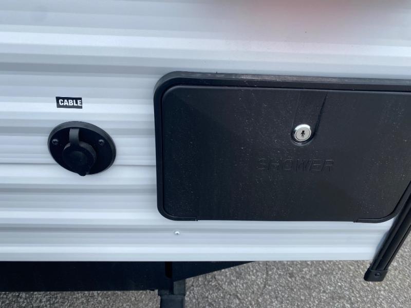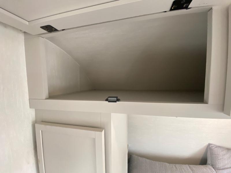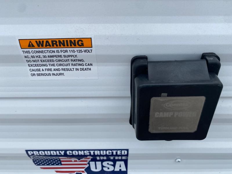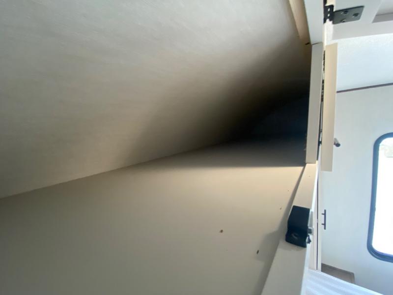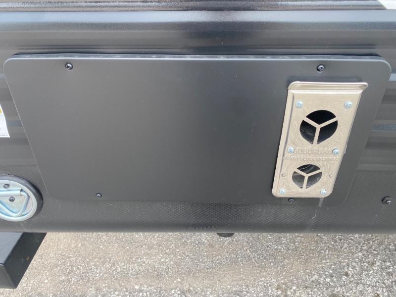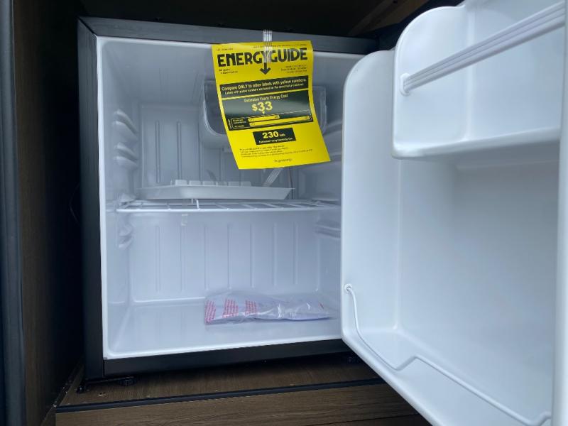 You'll appreciate the added space in this travel trailer thanks to the large slide out! The booth dinette and sofa are found here, and there is a moveable storage ottoman for extra blankets or board games. You'll have your own space up front in the private bedroom, complete with a camp king bed and storage for your things. The chef of your group will find a three burner cooktop and a built-in convection microwave with an air fryer to cook meals, plus there is a 12V refrigerator and hidden pantry for food storage. This unit also includes a power awning outdoors and an outside refrigerator to keep cold drinks close by.