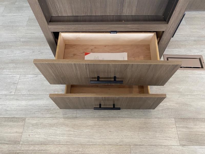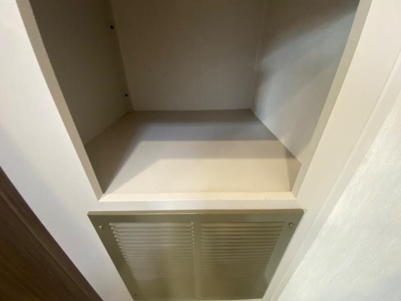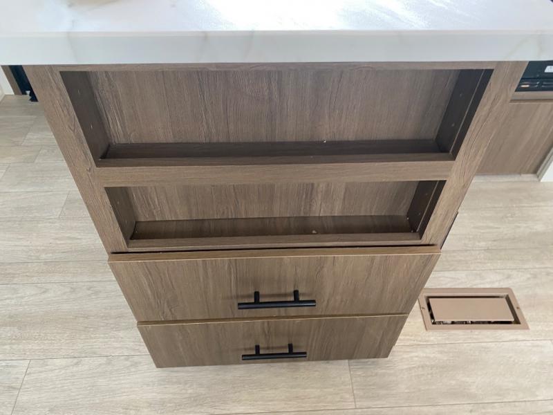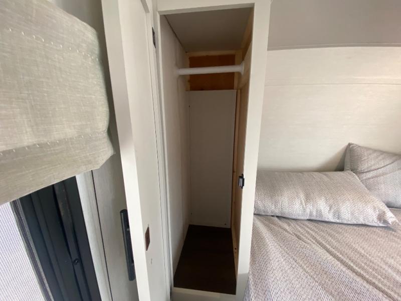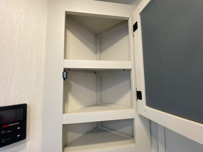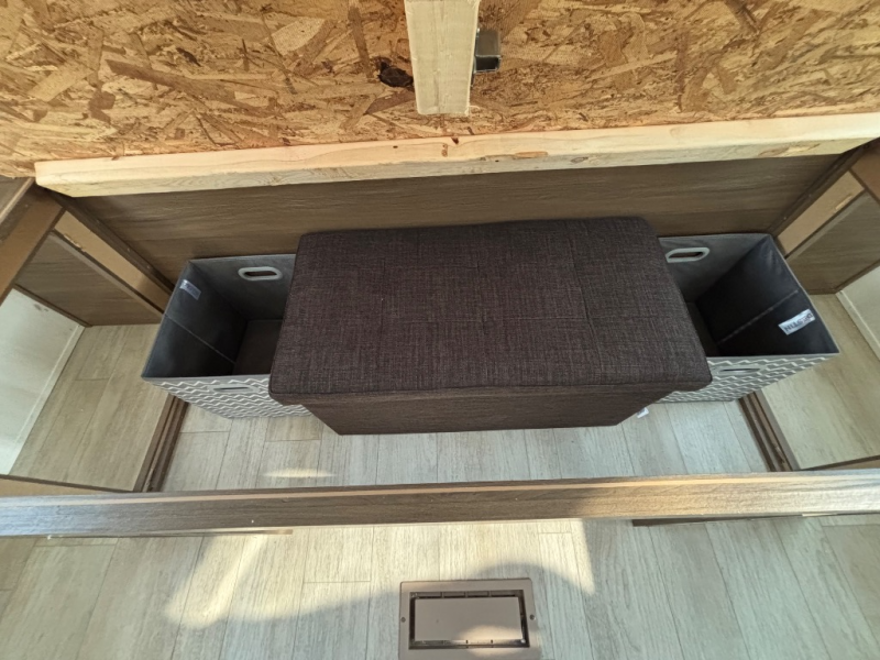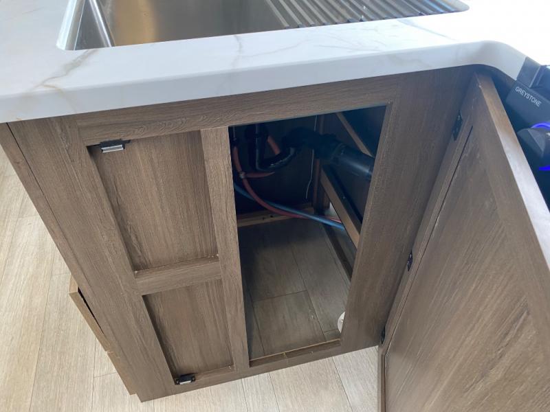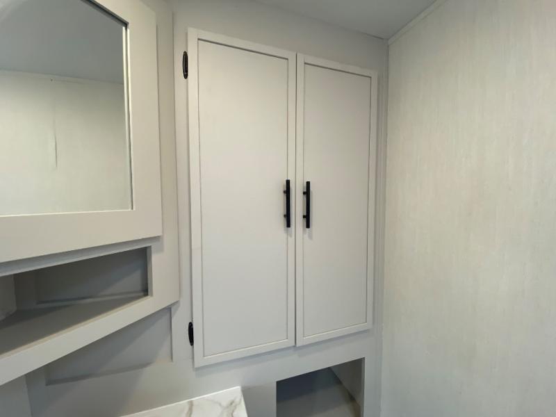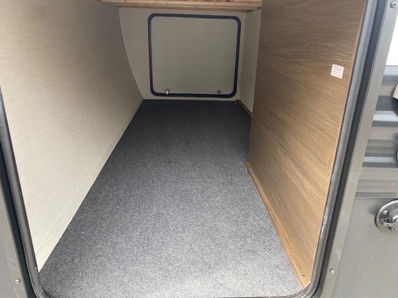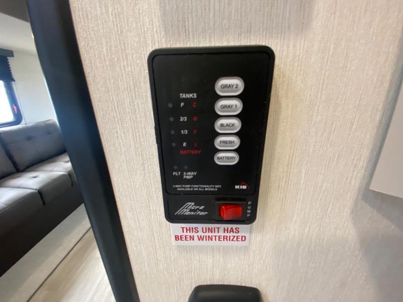 You'll appreciate the added space in this travel trailer thanks to the large slide out! The booth dinette and sofa are found here, and there is a moveable storage ottoman for extra blankets or board games. You'll have your own space up front in the private bedroom, complete with a camp king bed and storage for your things. The chef of your group will find a three burner cooktop and a built-in convection microwave with an air fryer to cook meals, plus there is a 12V refrigerator and hidden pantry for food storage. This unit also includes a power awning outdoors and an outside refrigerator to keep cold drinks close by.