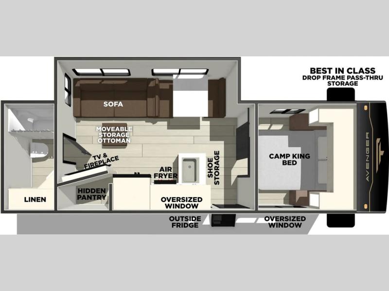 With any Avenger travel trailer by Prime Time RV, you will find innovation, a solid build, and comfort at every turn. Each model is built with Tuff Coat on the exterior metal, a fully enclosed underbelly, and a PVC roof membrane to help extend the life of your trailer. You will also find automotive name badging on the exterior, along with an exterior shower, front rail LED light strips, plus an XL padded entry grab handle to name a few conveniences. There are plenty of storage spaces inside, as well as Congoleum flooring and woven PVC marine grade slide out flooring, a designer shower surround, and seamless pressed countertops. You are sure to appreciate the onboard water filtration system, tankless water heater, plus 30K BTU furnace and 15K ducted A/C to help keep you comfortable.
