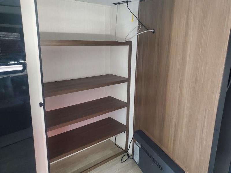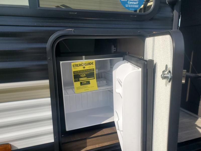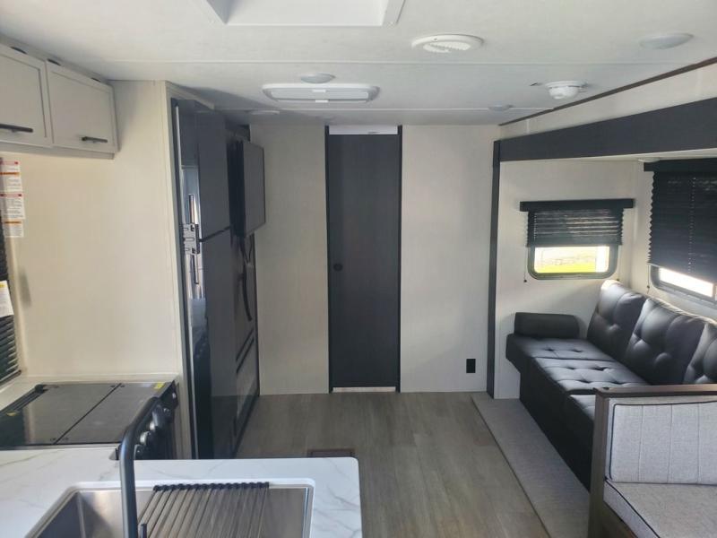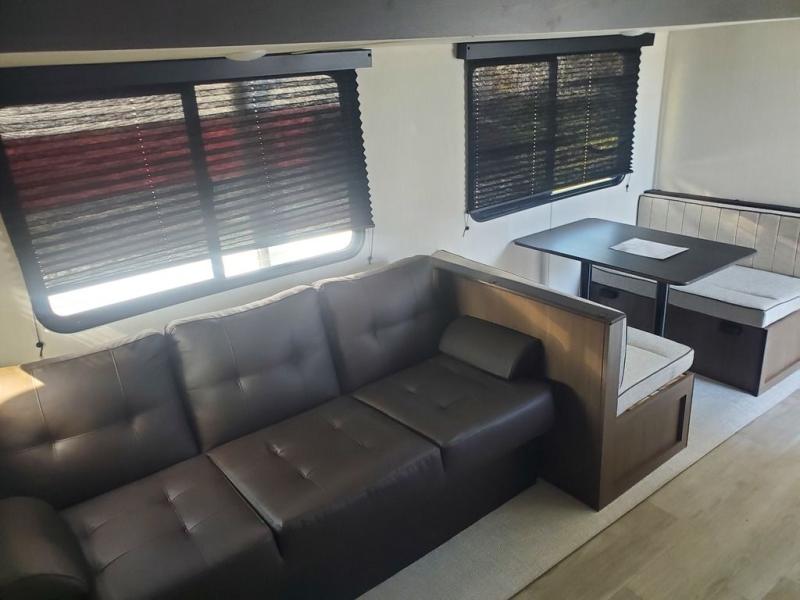 You'll appreciate the added space in this travel trailer thanks to the large slide out! The booth dinette and sofa are found here, and there is a moveable storage ottoman for extra blankets or board games. You'll have your own space up front in the private bedroom, complete with a camp king bed and storage for your things. The chef of your group will find a three burner cooktop and a built-in convection microwave with an air fryer to cook meals, plus there is a 12V refrigerator and hidden pantry for food storage. This unit also includes a power awning outdoors and an outside refrigerator to keep cold drinks close by.