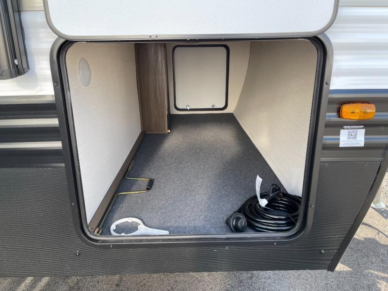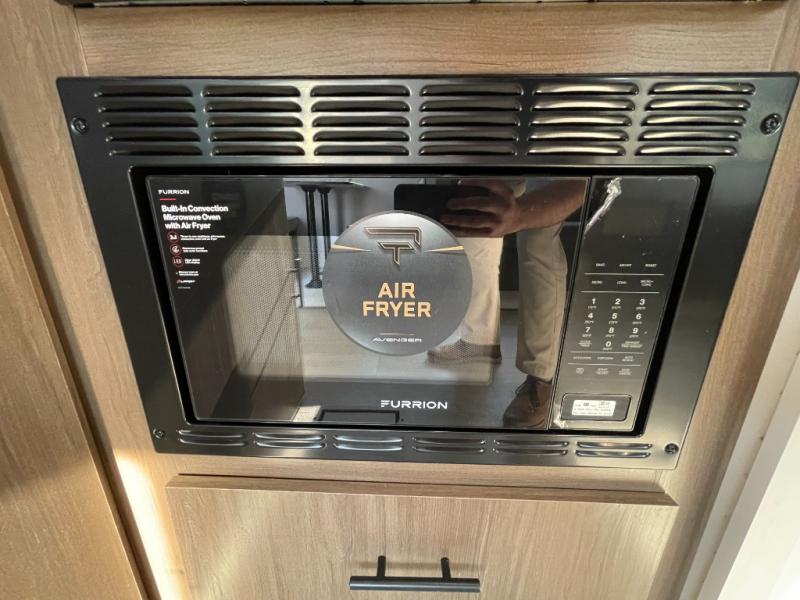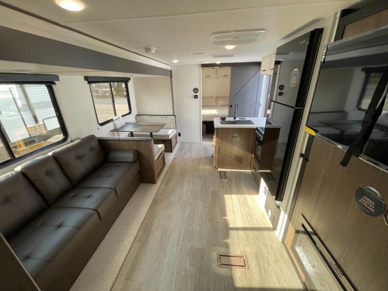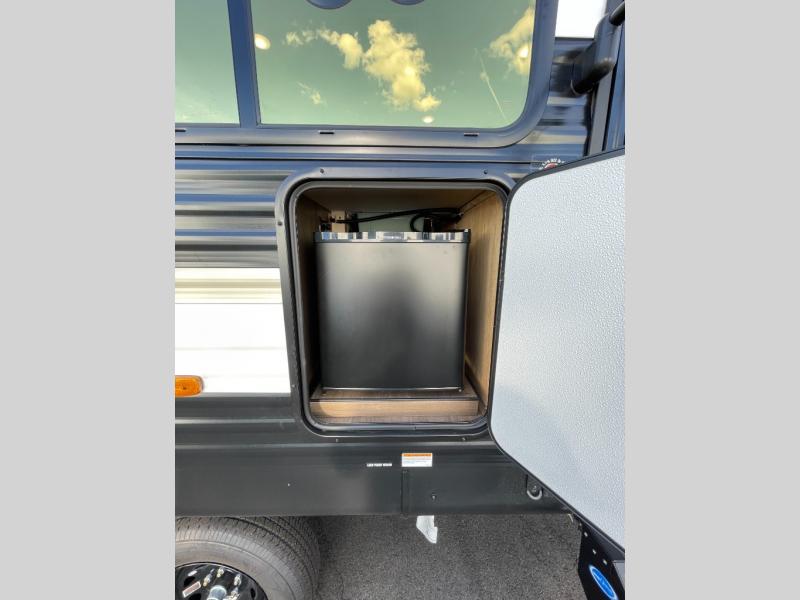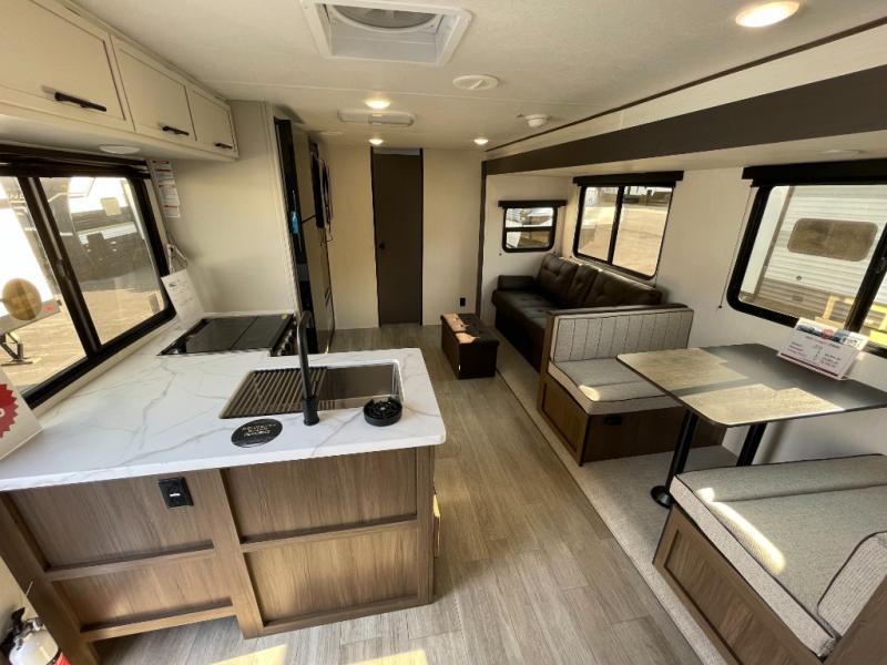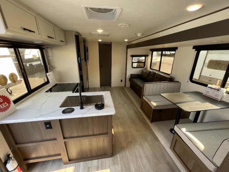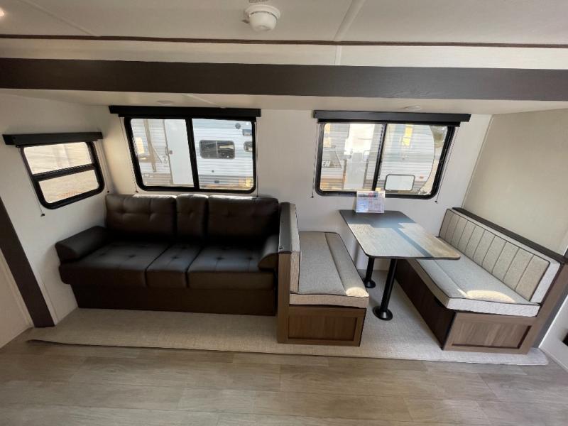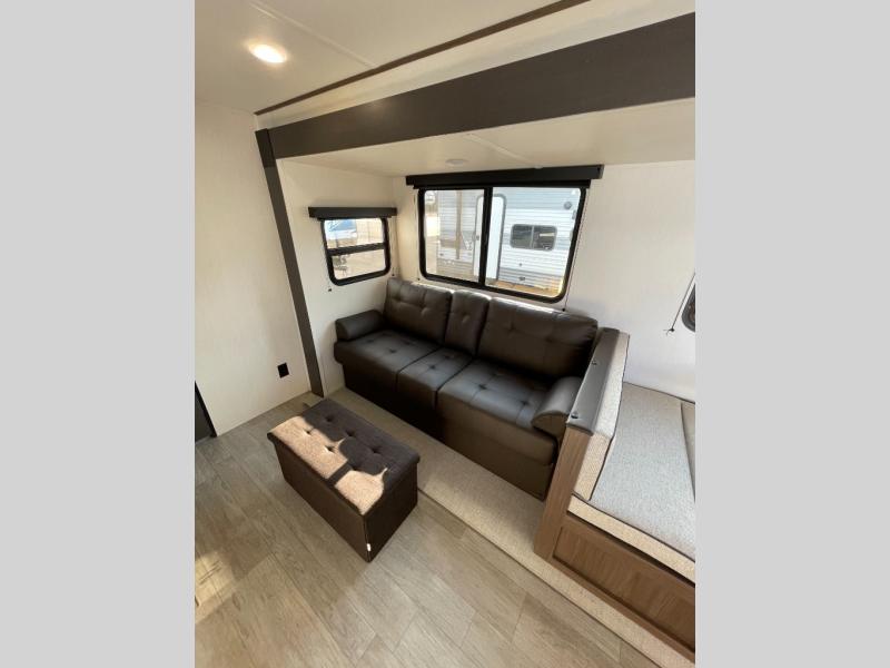 You'll appreciate the added space in this travel trailer thanks to the large slide out! The booth dinette and sofa are found here, and there is a moveable storage ottoman for extra blankets or board games. You'll have your own space up front in the private bedroom, complete with a camp king bed and storage for your things. The chef of your group will find a three burner cooktop and a built-in convection microwave with an air fryer to cook meals, plus there is a 12V refrigerator and hidden pantry for food storage. This unit also includes a power awning outdoors and an outside refrigerator to keep cold drinks close by.