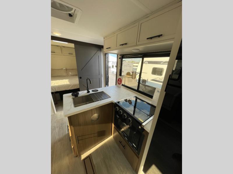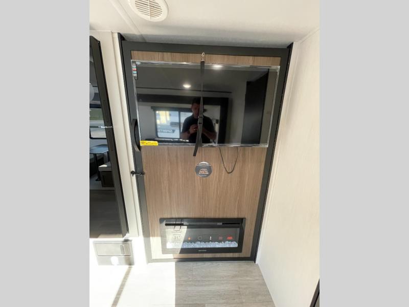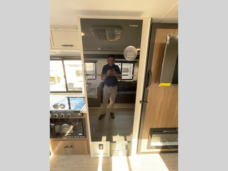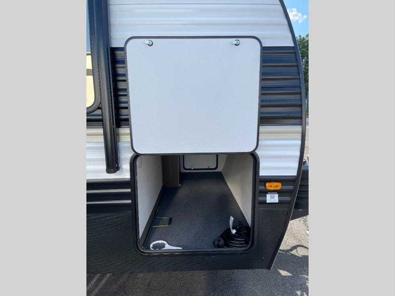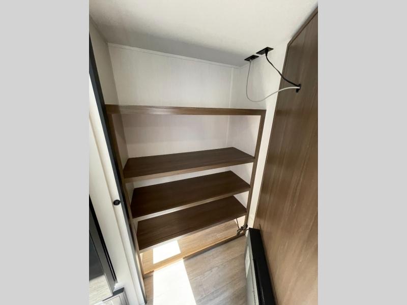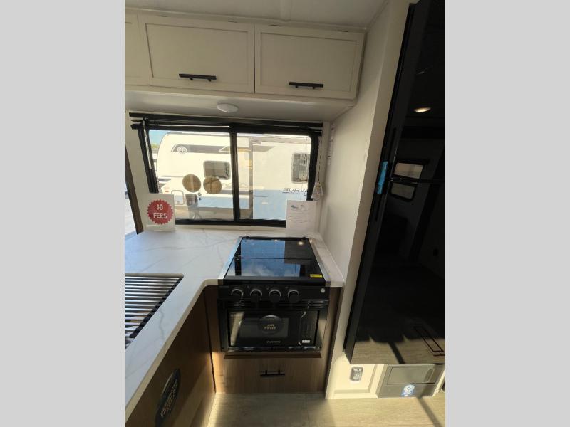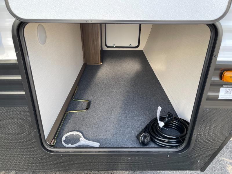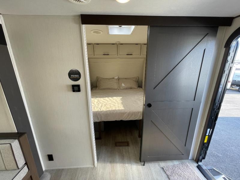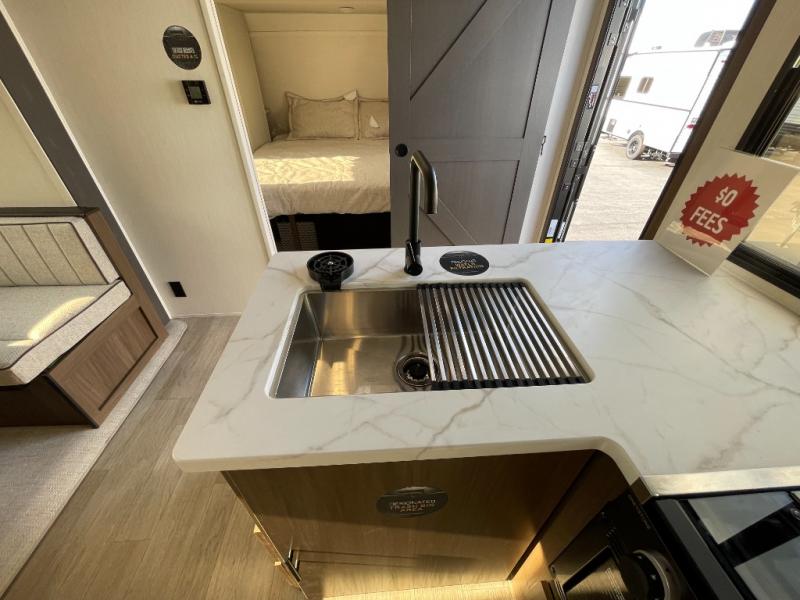 You'll appreciate the added space in this travel trailer thanks to the large slide out! The booth dinette and sofa are found here, and there is a moveable storage ottoman for extra blankets or board games. You'll have your own space up front in the private bedroom, complete with a camp king bed and storage for your things. The chef of your group will find a three burner cooktop and a built-in convection microwave with an air fryer to cook meals, plus there is a 12V refrigerator and hidden pantry for food storage. This unit also includes a power awning outdoors and an outside refrigerator to keep cold drinks close by.
