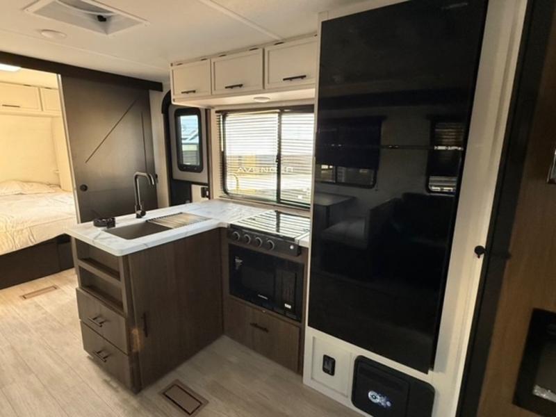 With any Avenger travel trailer by Prime Time RV, you will find innovation, a solid build, and comfort at every turn. Each model is built with Tuff Coat on the exterior metal, a fully enclosed underbelly, and a PVC roof membrane to help extend the life of your trailer. You will also find automotive name badging on the exterior, along with an exterior shower, front rail LED light strips, plus an XL padded entry grab handle to name a few conveniences. There are plenty of storage spaces inside, as well as Congoleum flooring and woven PVC marine grade slide out flooring, a designer shower surround, and seamless pressed countertops. You are sure to appreciate the onboard water filtration system, tankless water heater, plus 30K BTU furnace and 15K ducted A/C to help keep you comfortable.