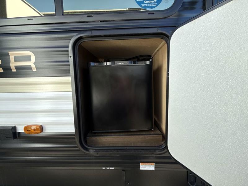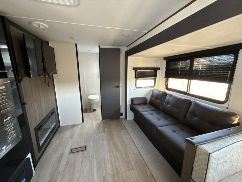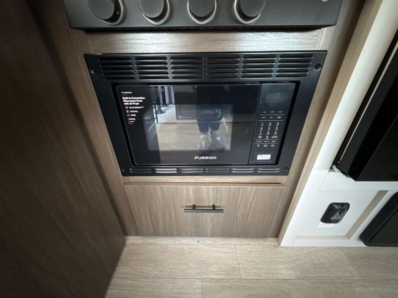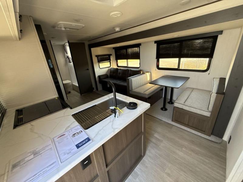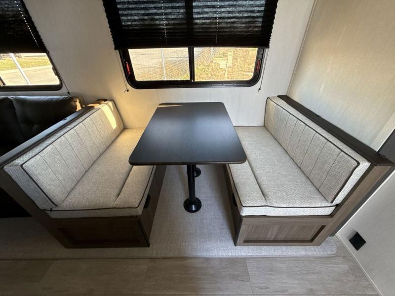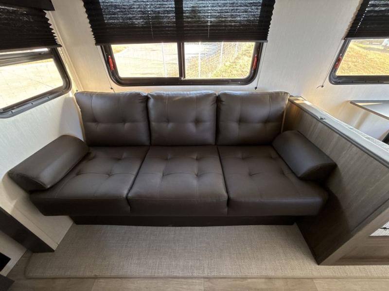 You'll appreciate the added space in this travel trailer thanks to the large slide out! The booth dinette and sofa are found here, and there is a moveable storage ottoman for extra blankets or board games. You'll have your own space up front in the private bedroom, complete with a camp king bed and storage for your things. The chef of your group will find a three burner cooktop and a built-in convection microwave with an air fryer to cook meals, plus there is a 12V refrigerator and hidden pantry for food storage. This unit also includes a power awning outdoors and an outside refrigerator to keep cold drinks close by.