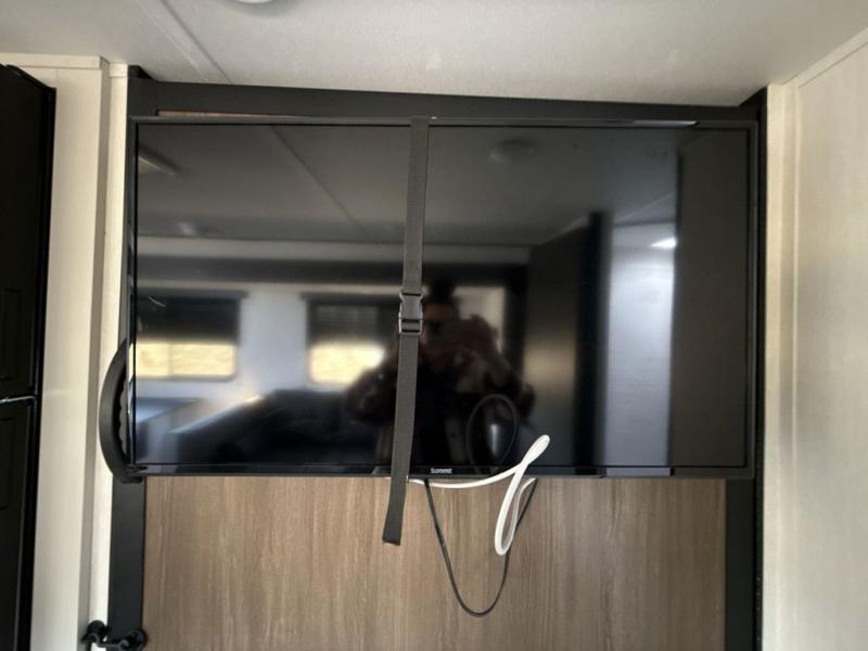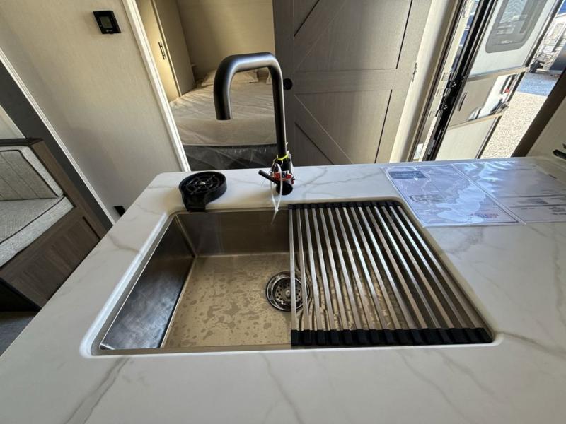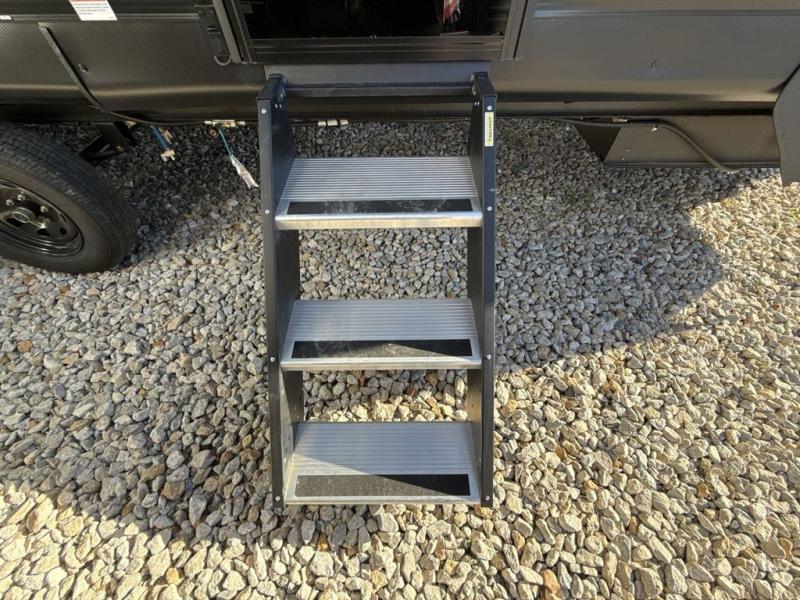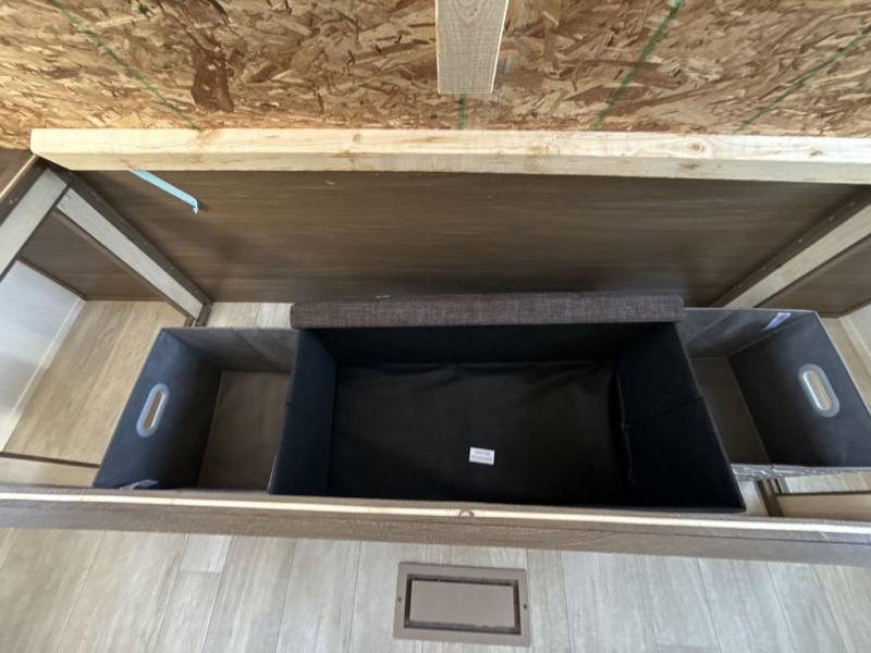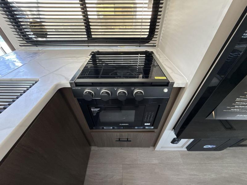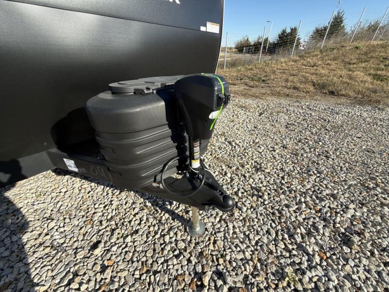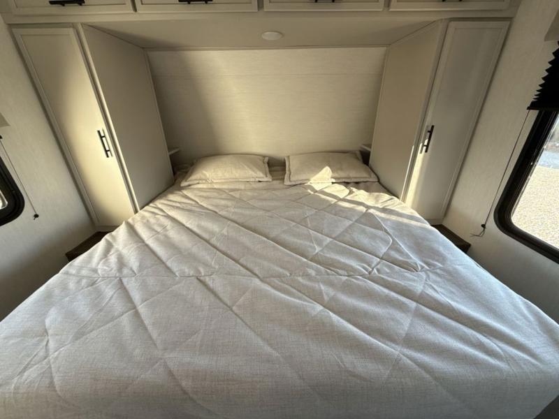 You'll appreciate the added space in this travel trailer thanks to the large slide out! The booth dinette and sofa are found here, and there is a moveable storage ottoman for extra blankets or board games. You'll have your own space up front in the private bedroom, complete with a camp king bed and storage for your things. The chef of your group will find a three burner cooktop and a built-in convection microwave with an air fryer to cook meals, plus there is a 12V refrigerator and hidden pantry for food storage. This unit also includes a power awning outdoors and an outside refrigerator to keep cold drinks close by.