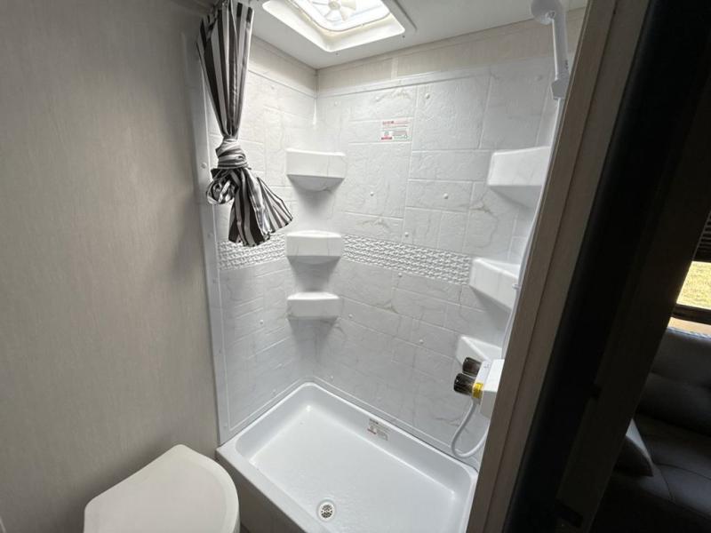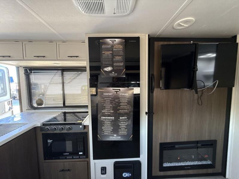 With any Avenger travel trailer by Prime Time RV, you will find innovation, a solid build, and comfort at every turn. Each model is built with Tuff Coat on the exterior metal, a fully enclosed underbelly, and a PVC roof membrane to help extend the life of your trailer. You will also find automotive name badging on the exterior, along with an exterior shower, front rail LED light strips, plus an XL padded entry grab handle to name a few conveniences. There are plenty of storage spaces inside, as well as Congoleum flooring and woven PVC marine grade slide out flooring, a designer shower surround, and seamless pressed countertops. You are sure to appreciate the onboard water filtration system, tankless water heater, plus 30K BTU furnace and 15K ducted A/C to help keep you comfortable.