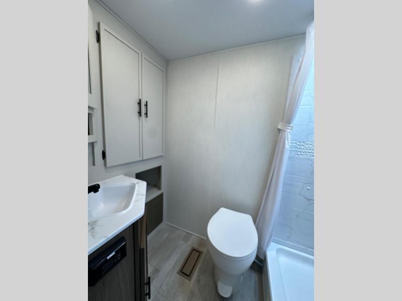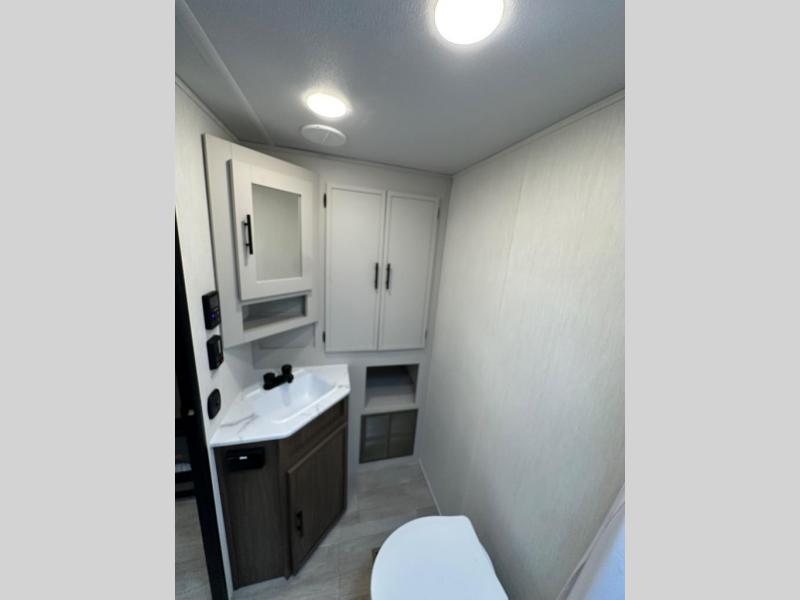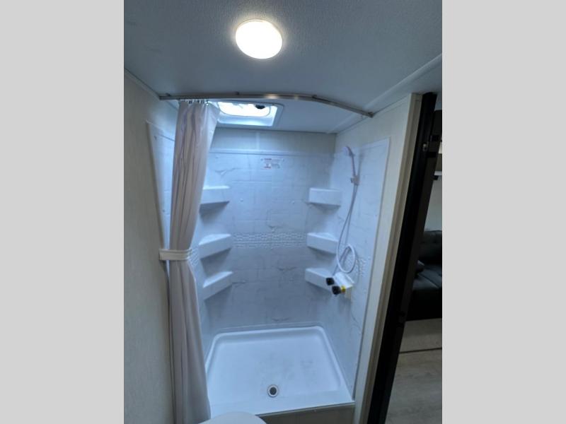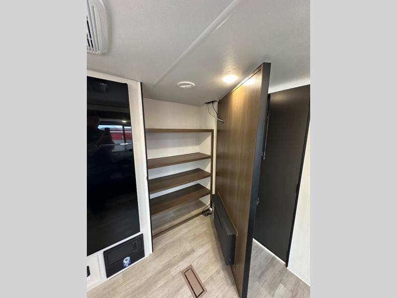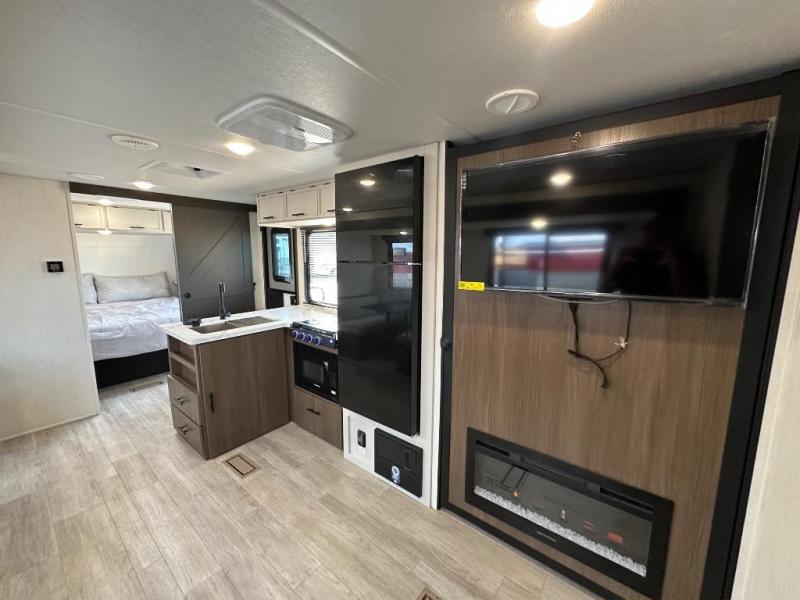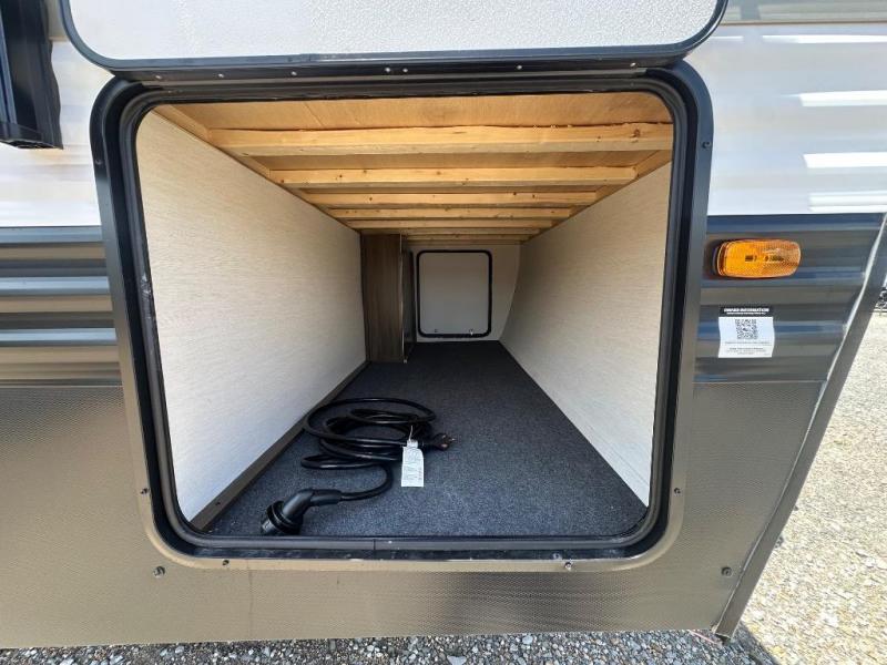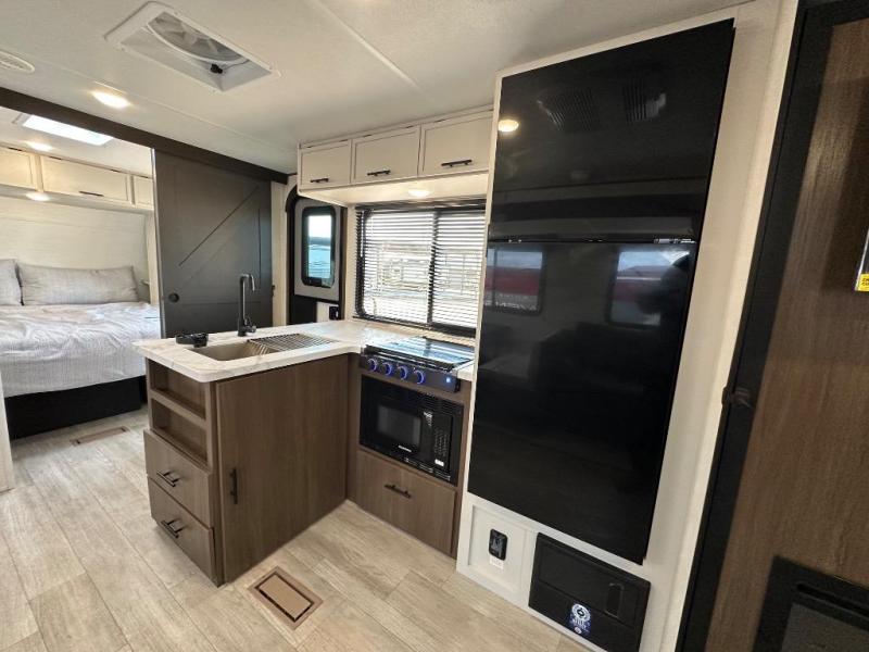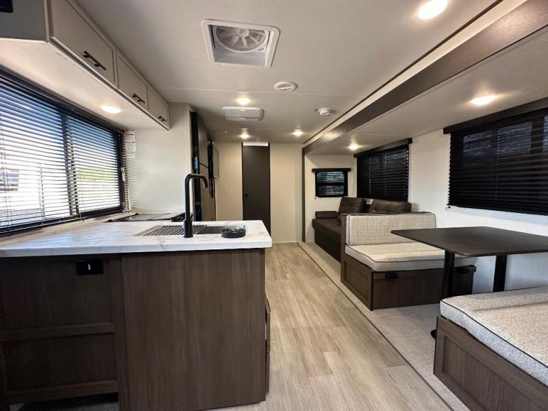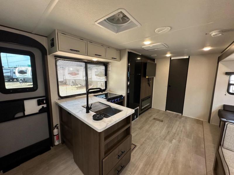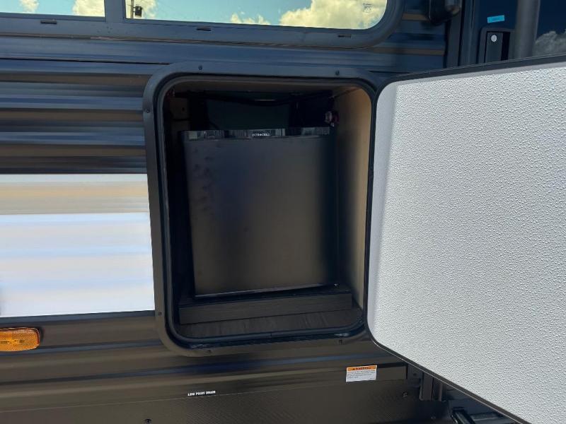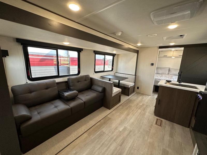 You'll appreciate the added space in this travel trailer thanks to the large slide out! The booth dinette and sofa are found here, and there is a moveable storage ottoman for extra blankets or board games. You'll have your own space up front in the private bedroom, complete with a camp king bed and storage for your things. The chef of your group will find a three burner cooktop and a built-in convection microwave with an air fryer to cook meals, plus there is a 12V refrigerator and hidden pantry for food storage. This unit also includes a power awning outdoors and an outside refrigerator to keep cold drinks close by.