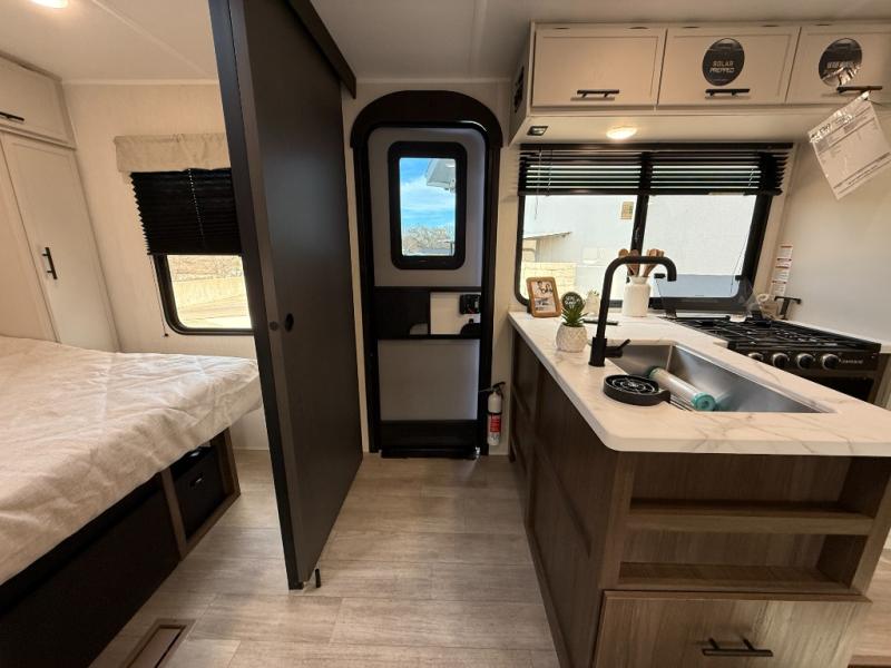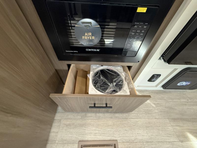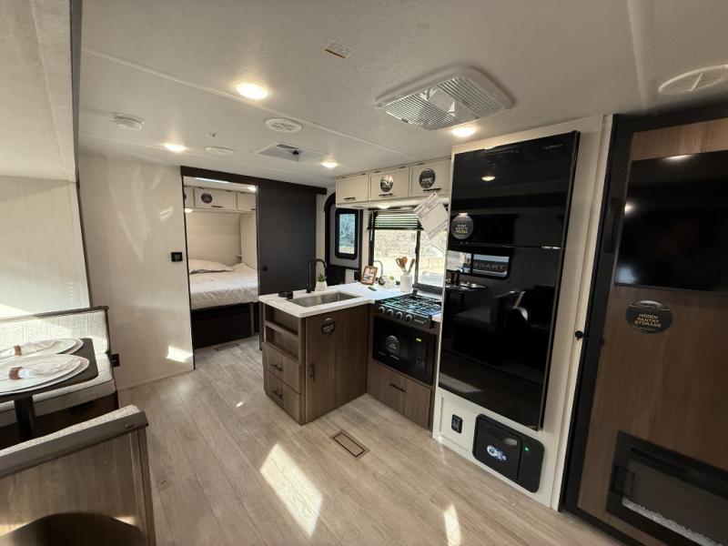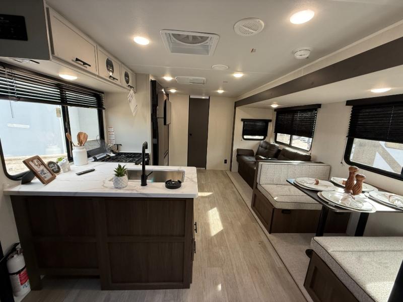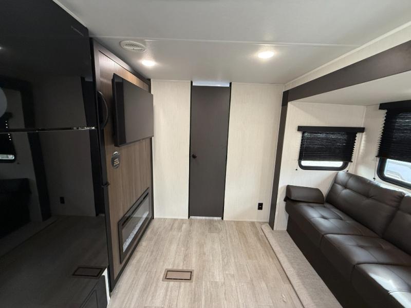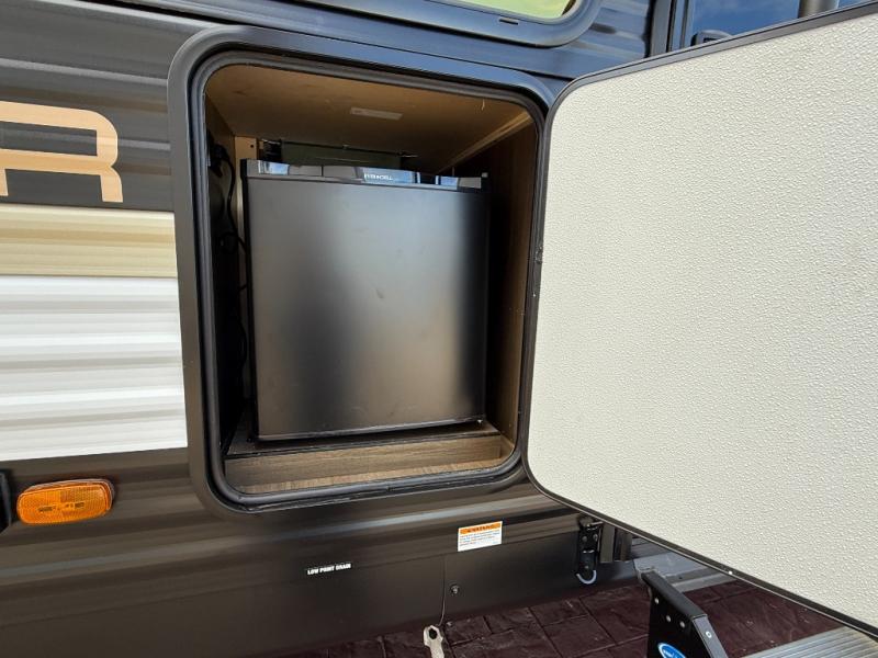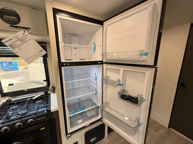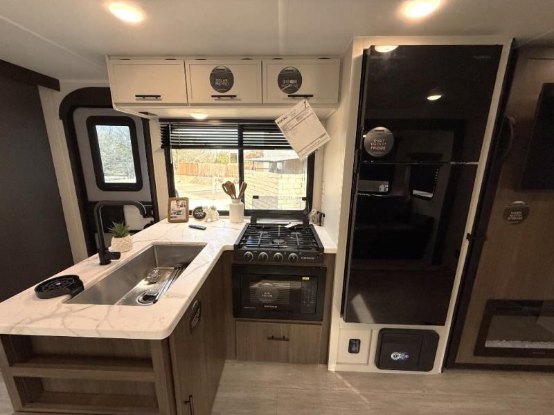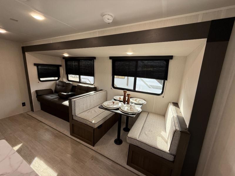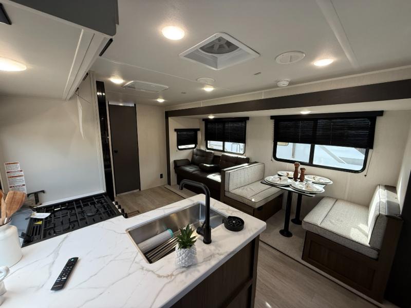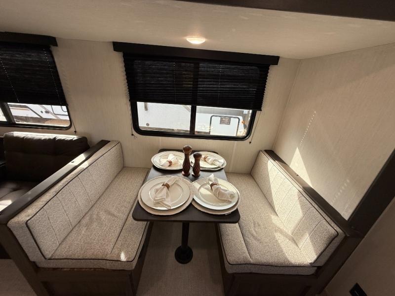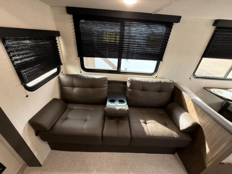 You'll appreciate the added space in this travel trailer thanks to the large slide out! The booth dinette and sofa are found here, and there is a moveable storage ottoman for extra blankets or board games. You'll have your own space up front in the private bedroom, complete with a camp king bed and storage for your things. The chef of your group will find a three burner cooktop and a built-in convection microwave with an air fryer to cook meals, plus there is a 12V refrigerator and hidden pantry for food storage. This unit also includes a power awning outdoors and an outside refrigerator to keep cold drinks close by.