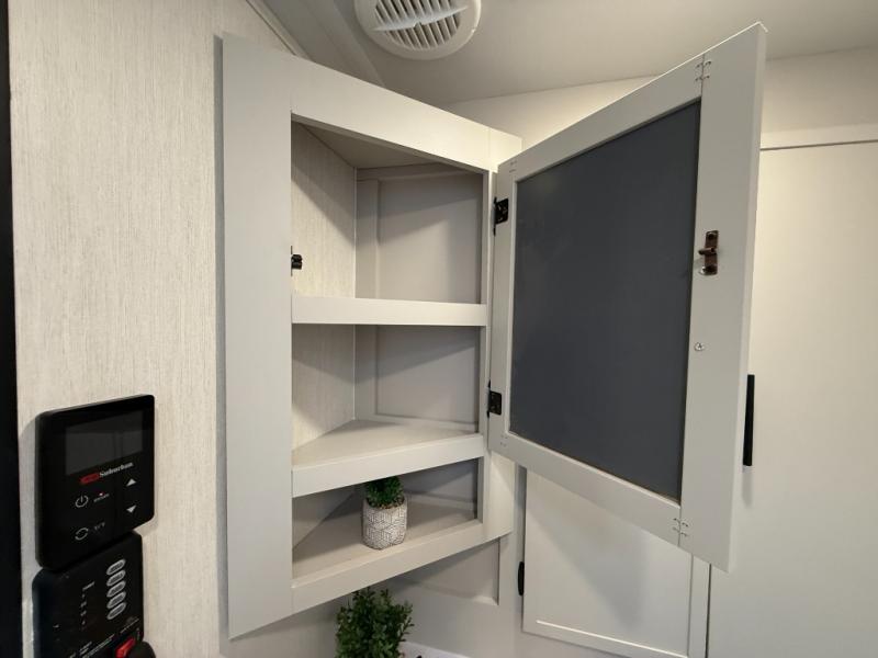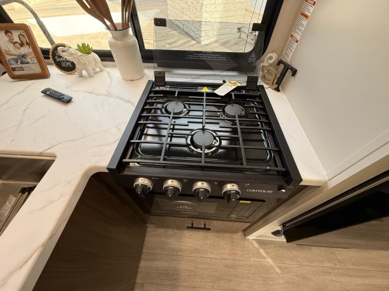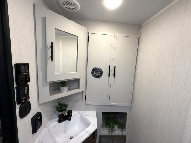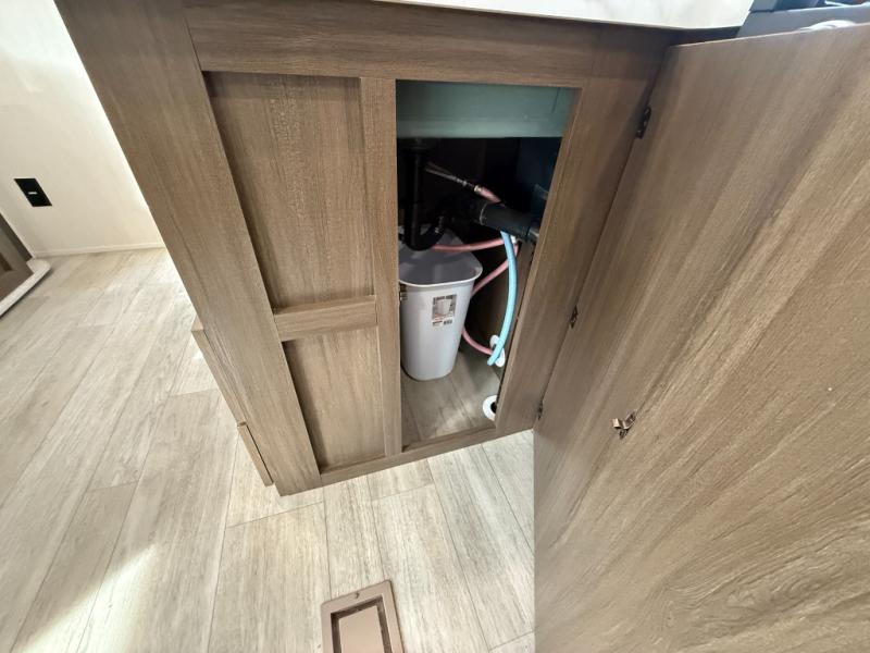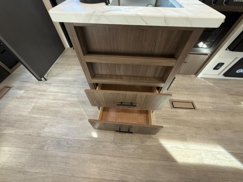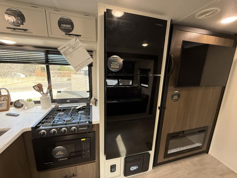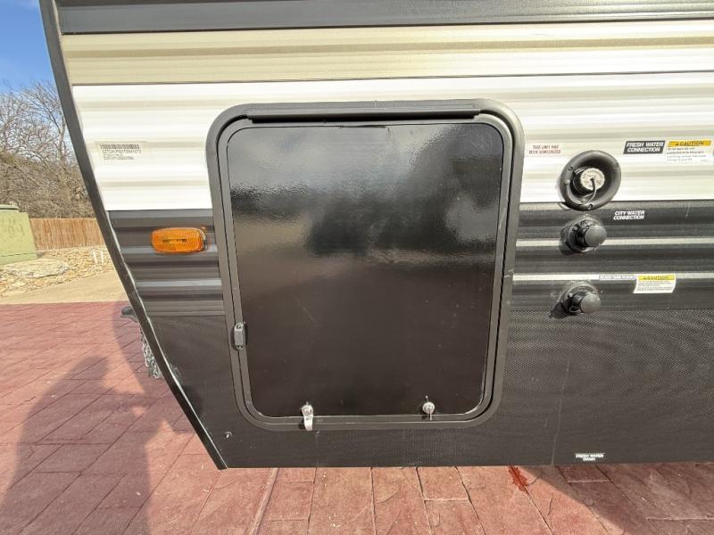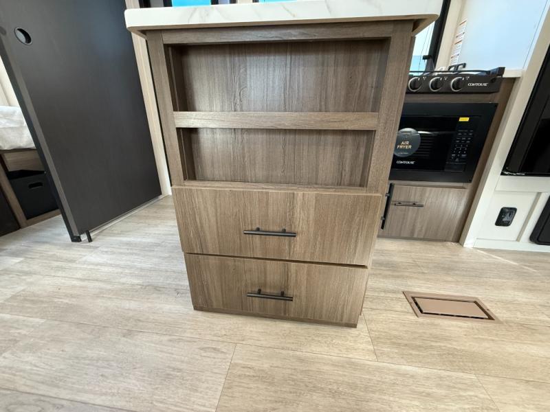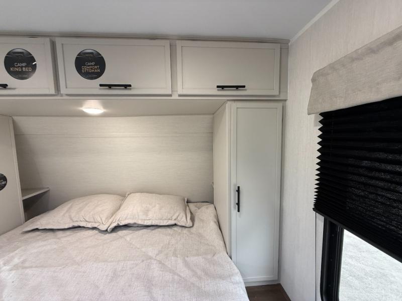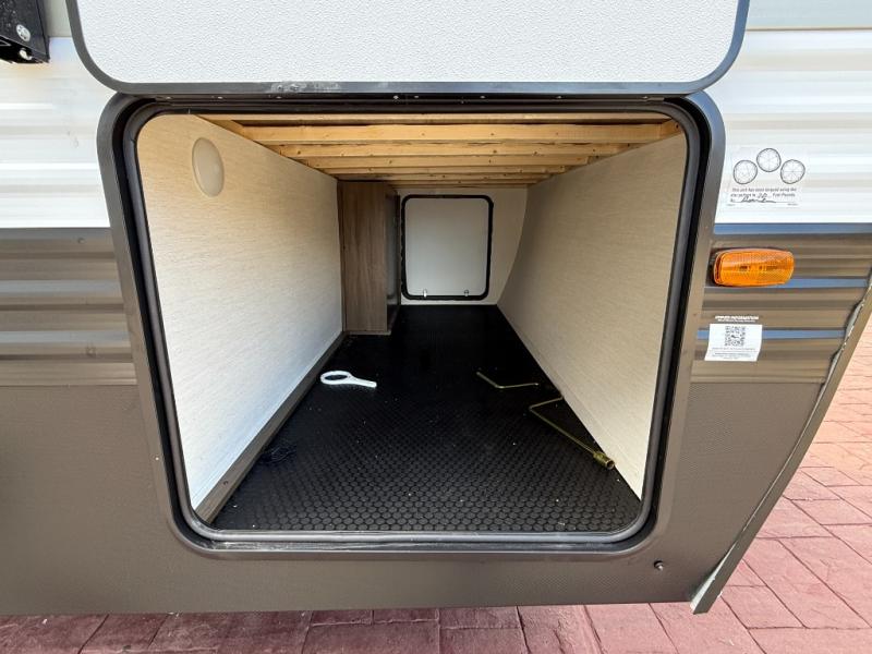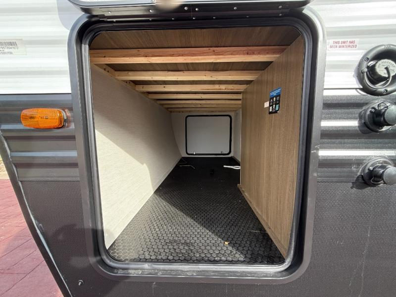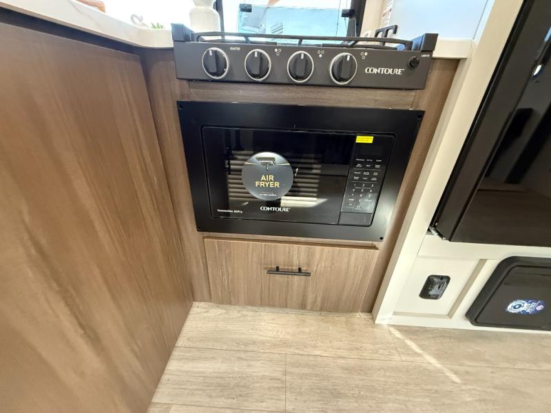 You'll appreciate the added space in this travel trailer thanks to the large slide out! The booth dinette and sofa are found here, and there is a moveable storage ottoman for extra blankets or board games. You'll have your own space up front in the private bedroom, complete with a camp king bed and storage for your things. The chef of your group will find a three burner cooktop and a built-in convection microwave with an air fryer to cook meals, plus there is a 12V refrigerator and hidden pantry for food storage. This unit also includes a power awning outdoors and an outside refrigerator to keep cold drinks close by.