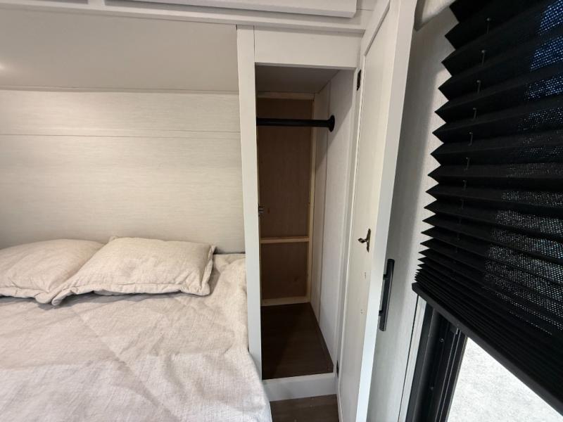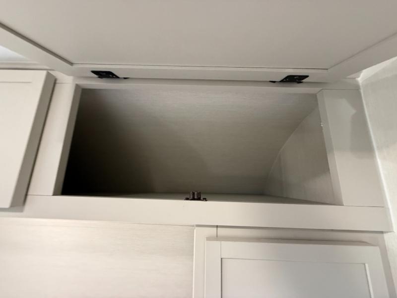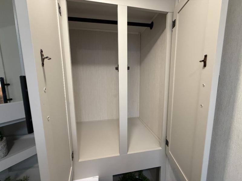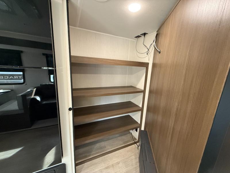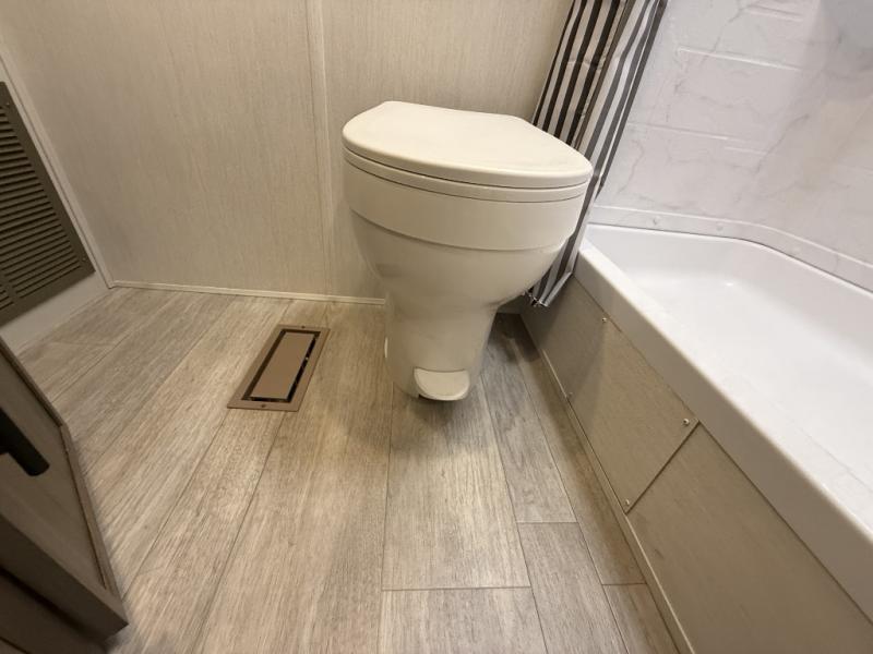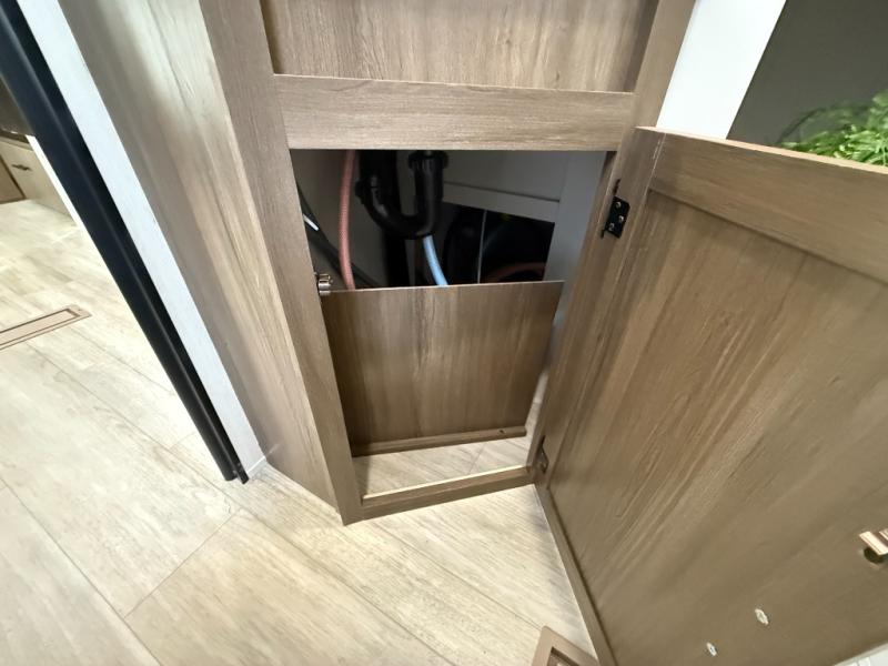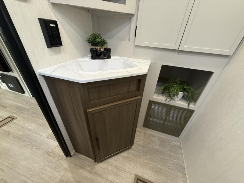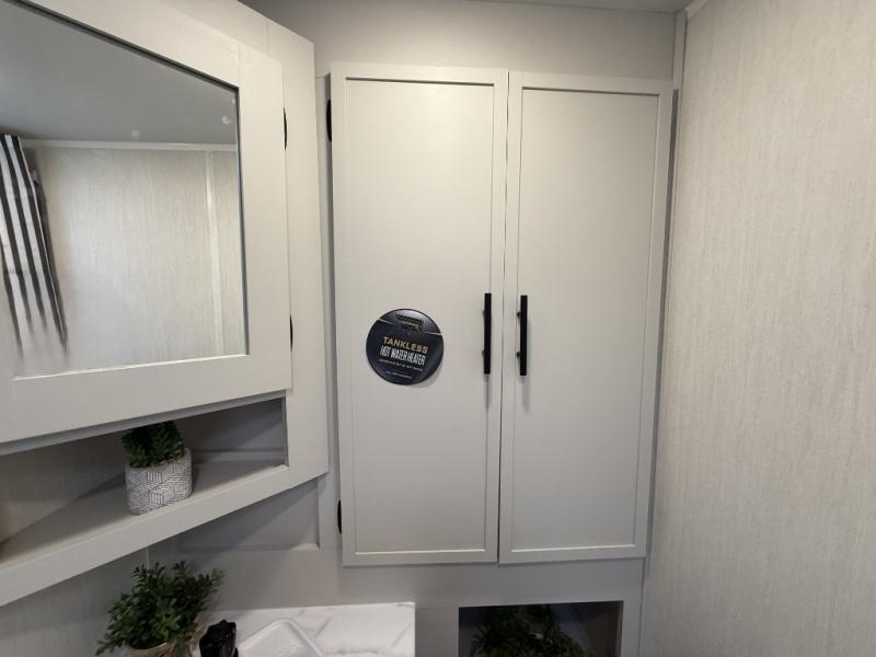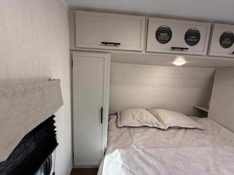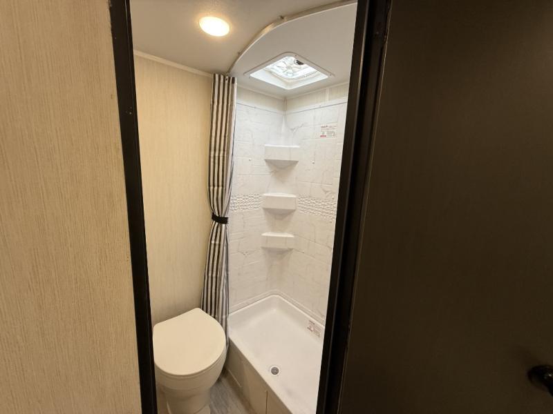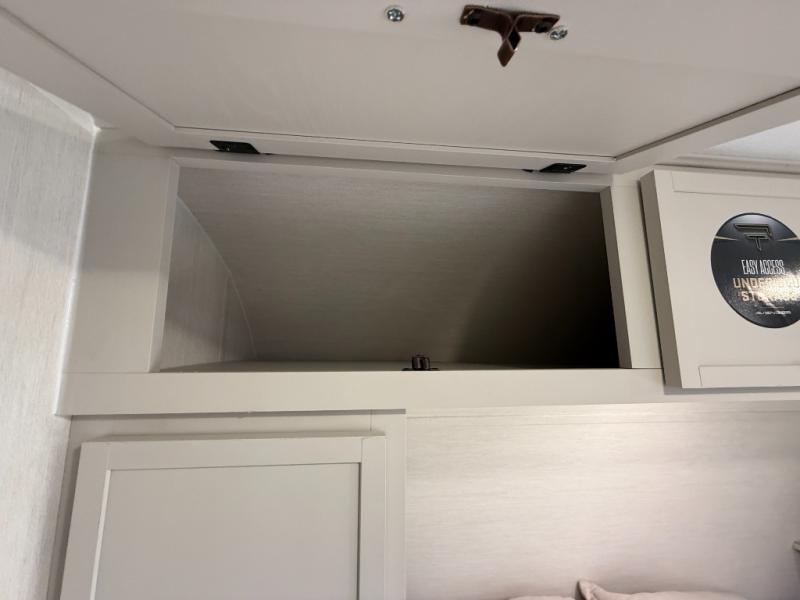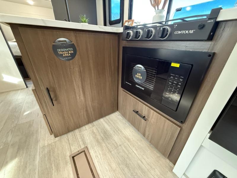 You'll appreciate the added space in this travel trailer thanks to the large slide out! The booth dinette and sofa are found here, and there is a moveable storage ottoman for extra blankets or board games. You'll have your own space up front in the private bedroom, complete with a camp king bed and storage for your things. The chef of your group will find a three burner cooktop and a built-in convection microwave with an air fryer to cook meals, plus there is a 12V refrigerator and hidden pantry for food storage. This unit also includes a power awning outdoors and an outside refrigerator to keep cold drinks close by.