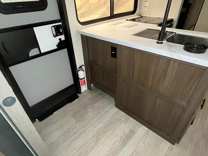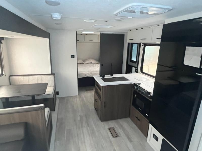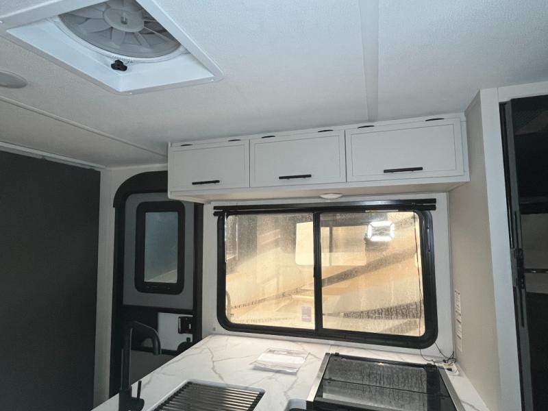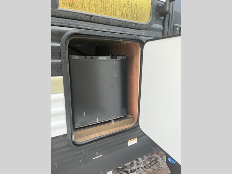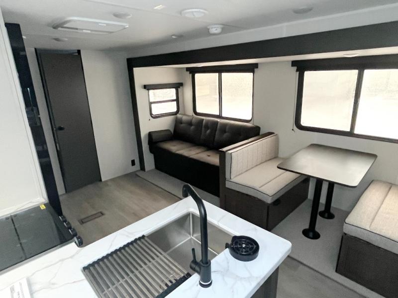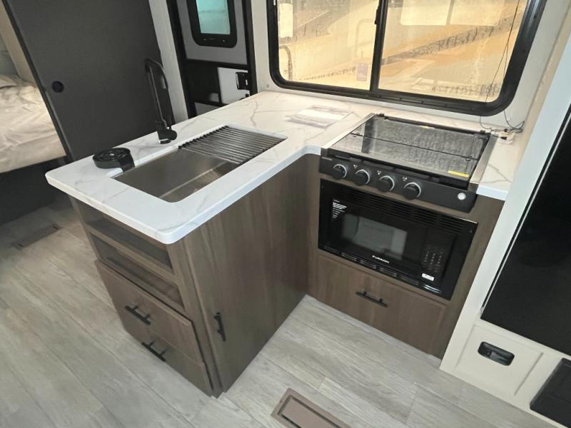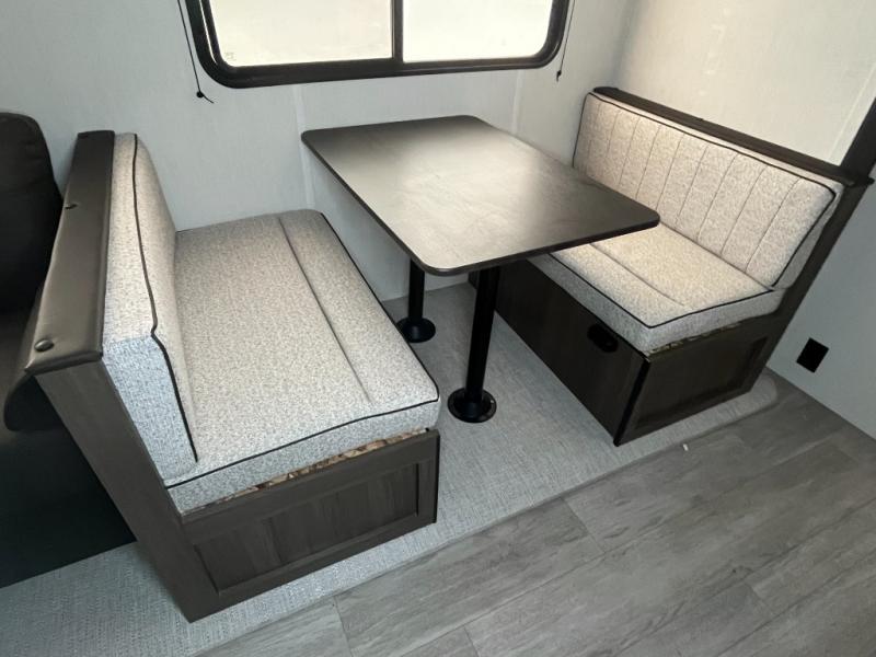 You'll appreciate the added space in this travel trailer thanks to the large slide out! The booth dinette and sofa are found here, and there is a moveable storage ottoman for extra blankets or board games. You'll have your own space up front in the private bedroom, complete with a camp king bed and storage for your things. The chef of your group will find a three burner cooktop and a built-in convection microwave with an air fryer to cook meals, plus there is a 12V refrigerator and hidden pantry for food storage. This unit also includes a power awning outdoors and an outside refrigerator to keep cold drinks close by.