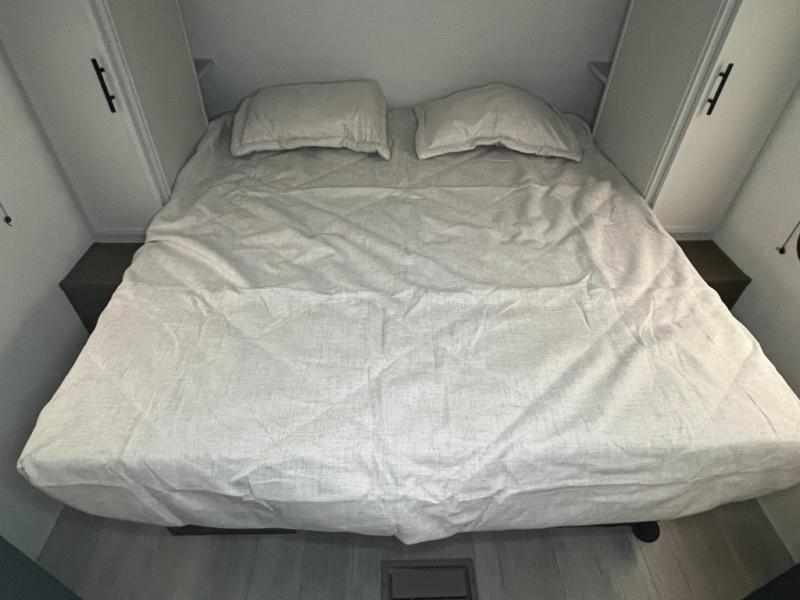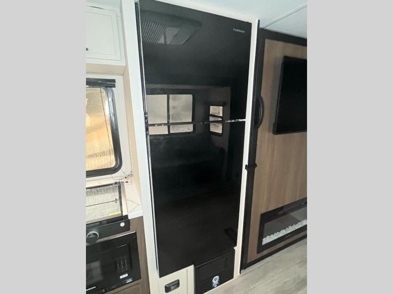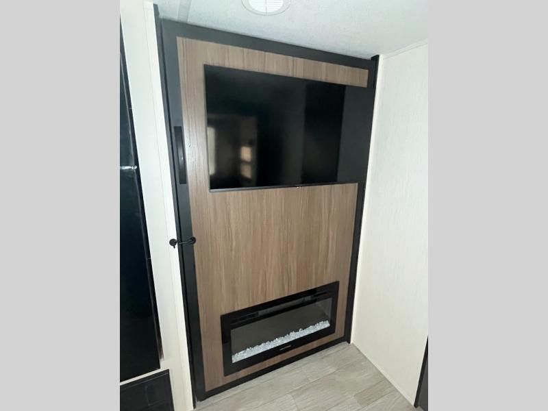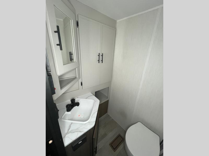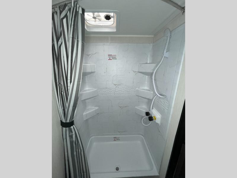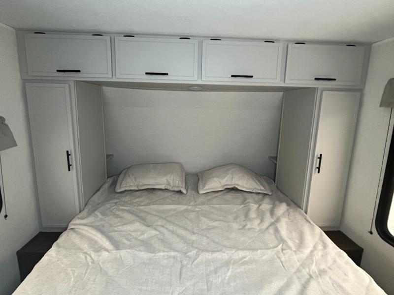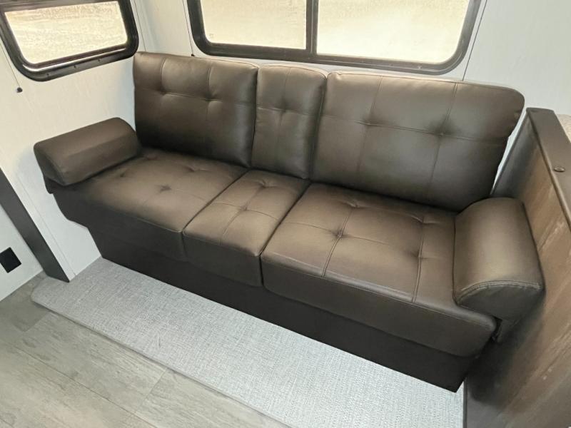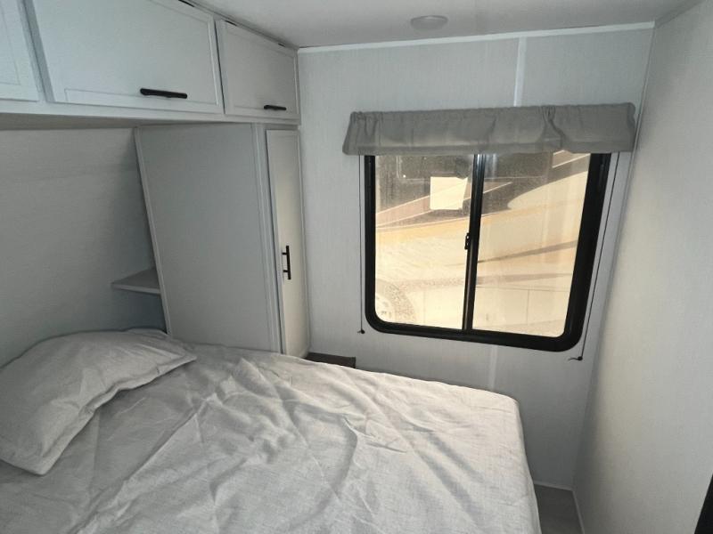 You'll appreciate the added space in this travel trailer thanks to the large slide out! The booth dinette and sofa are found here, and there is a moveable storage ottoman for extra blankets or board games. You'll have your own space up front in the private bedroom, complete with a camp king bed and storage for your things. The chef of your group will find a three burner cooktop and a built-in convection microwave with an air fryer to cook meals, plus there is a 12V refrigerator and hidden pantry for food storage. This unit also includes a power awning outdoors and an outside refrigerator to keep cold drinks close by.