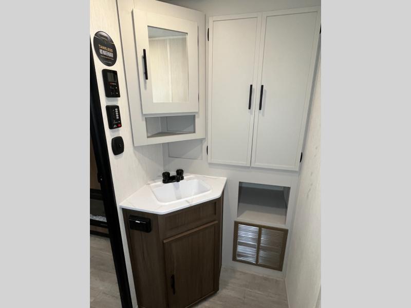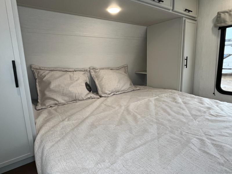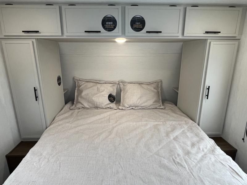 You'll appreciate the added space in this travel trailer thanks to the large slide out! The booth dinette and sofa are found here, and there is a moveable storage ottoman for extra blankets or board games. You'll have your own space up front in the private bedroom, complete with a camp king bed and storage for your things. The chef of your group will find a three burner cooktop and a built-in convection microwave with an air fryer to cook meals, plus there is a 12V refrigerator and hidden pantry for food storage. This unit also includes a power awning outdoors and an outside refrigerator to keep cold drinks close by.