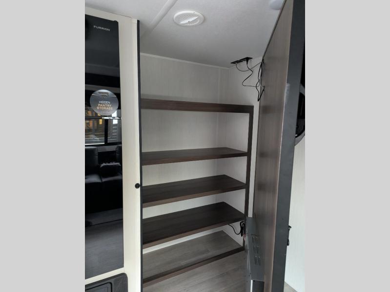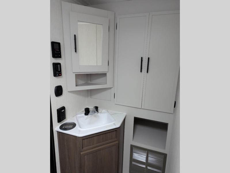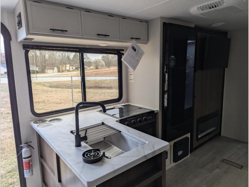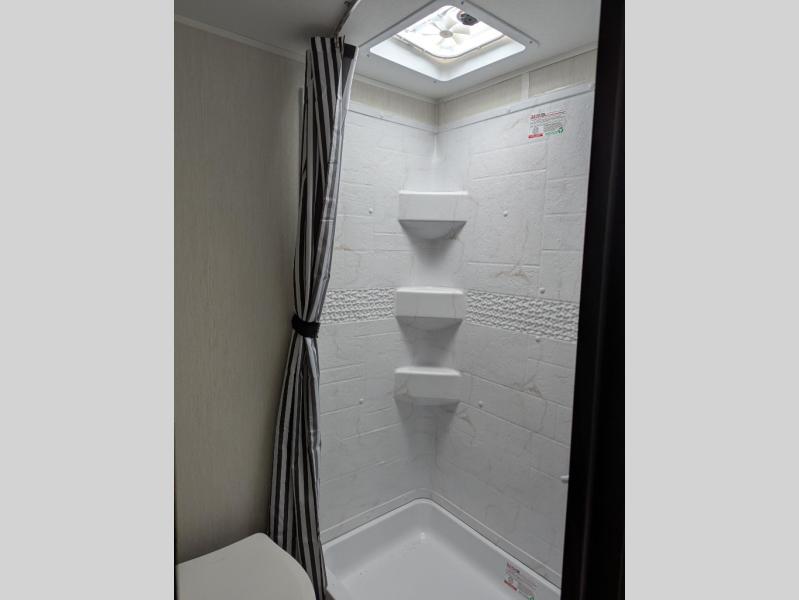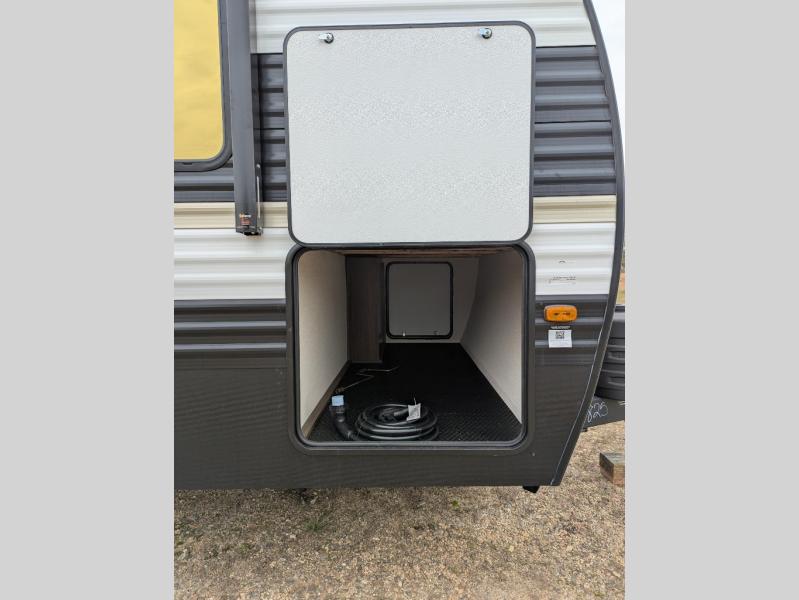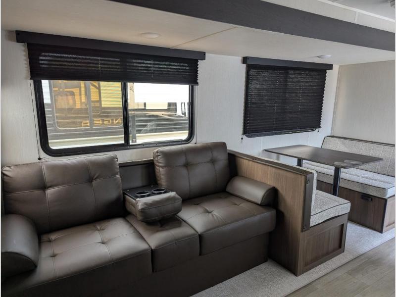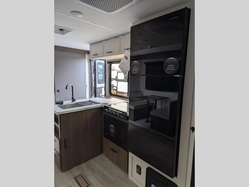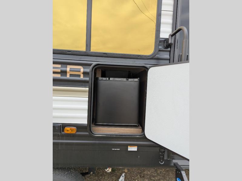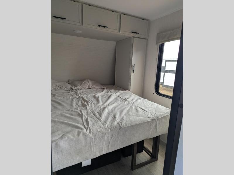 You'll appreciate the added space in this travel trailer thanks to the large slide out! The booth dinette and sofa are found here, and there is a moveable storage ottoman for extra blankets or board games. You'll have your own space up front in the private bedroom, complete with a camp king bed and storage for your things. The chef of your group will find a three burner cooktop and a built-in convection microwave with an air fryer to cook meals, plus there is a 12V refrigerator and hidden pantry for food storage. This unit also includes a power awning outdoors and an outside refrigerator to keep cold drinks close by.