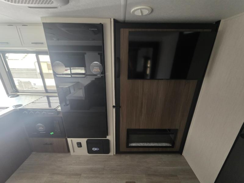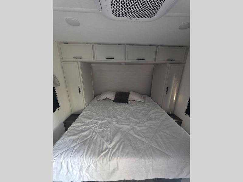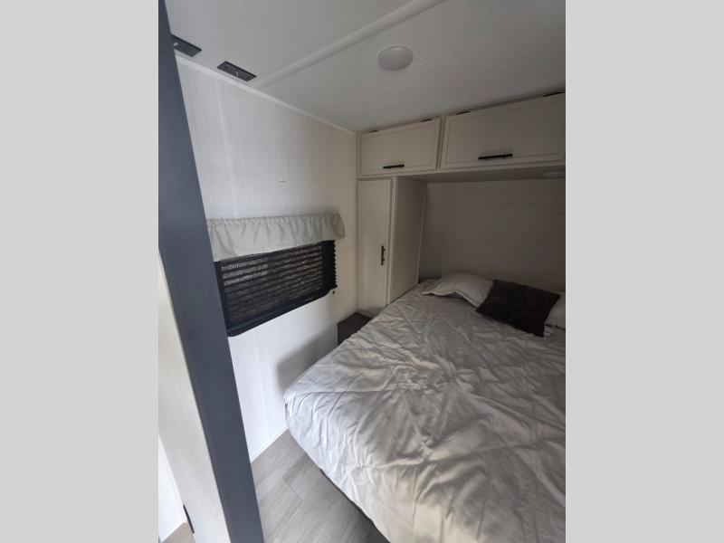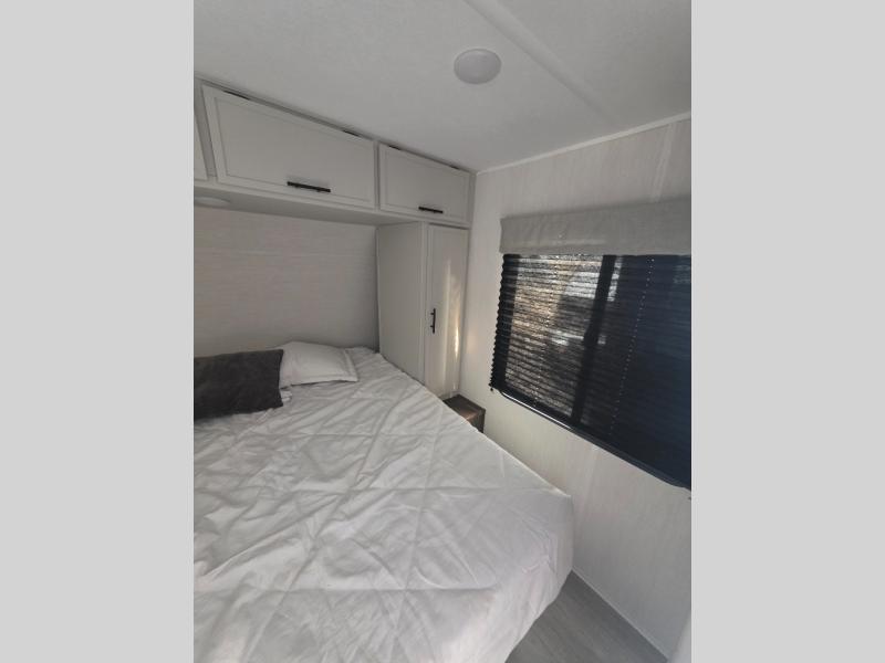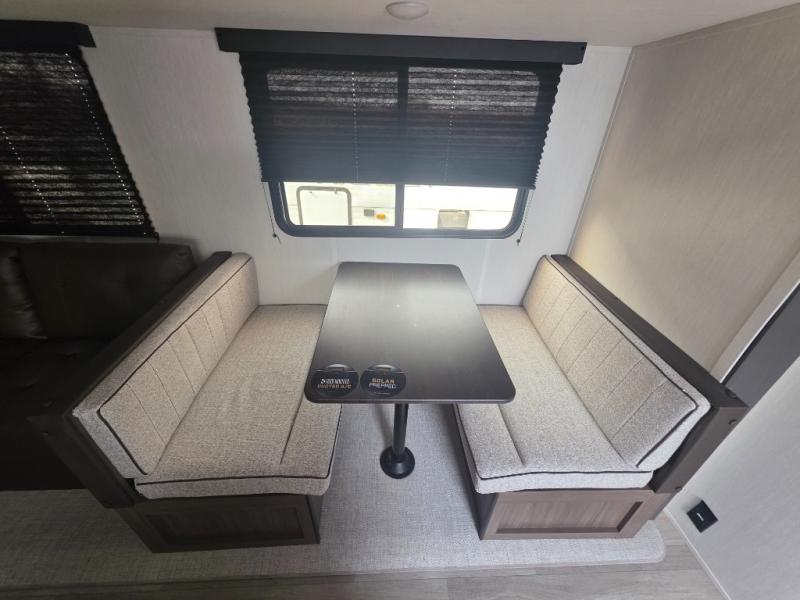 You'll appreciate the added space in this travel trailer thanks to the large slide out! The booth dinette and sofa are found here, and there is a moveable storage ottoman for extra blankets or board games. You'll have your own space up front in the private bedroom, complete with a camp king bed and storage for your things. The chef of your group will find a three burner cooktop and a built-in convection microwave with an air fryer to cook meals, plus there is a 12V refrigerator and hidden pantry for food storage. This unit also includes a power awning outdoors and an outside refrigerator to keep cold drinks close by.