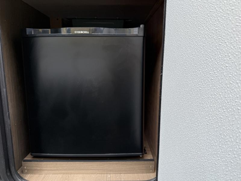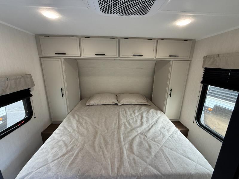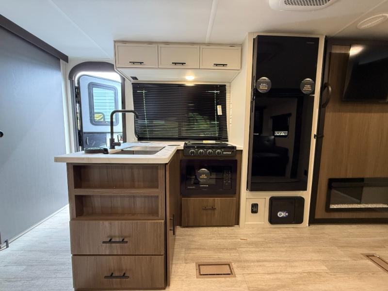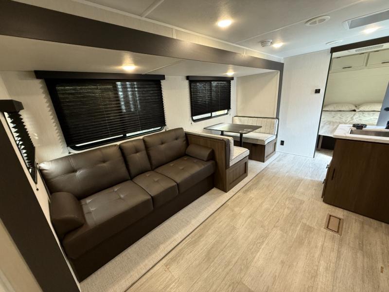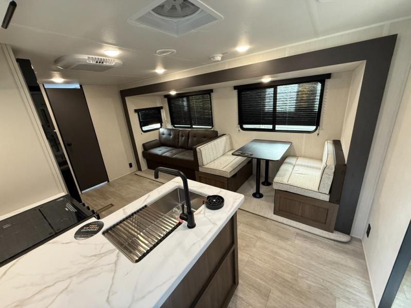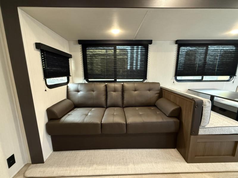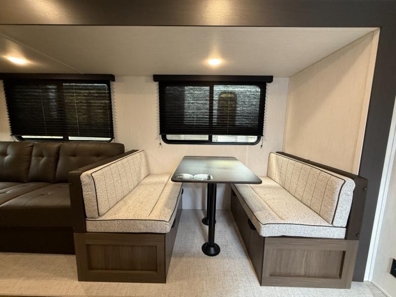 You'll appreciate the added space in this travel trailer thanks to the large slide out! The booth dinette and sofa are found here, and there is a moveable storage ottoman for extra blankets or board games. You'll have your own space up front in the private bedroom, complete with a camp king bed and storage for your things. The chef of your group will find a three burner cooktop and a built-in convection microwave with an air fryer to cook meals, plus there is a 12V refrigerator and hidden pantry for food storage. This unit also includes a power awning outdoors and an outside refrigerator to keep cold drinks close by.