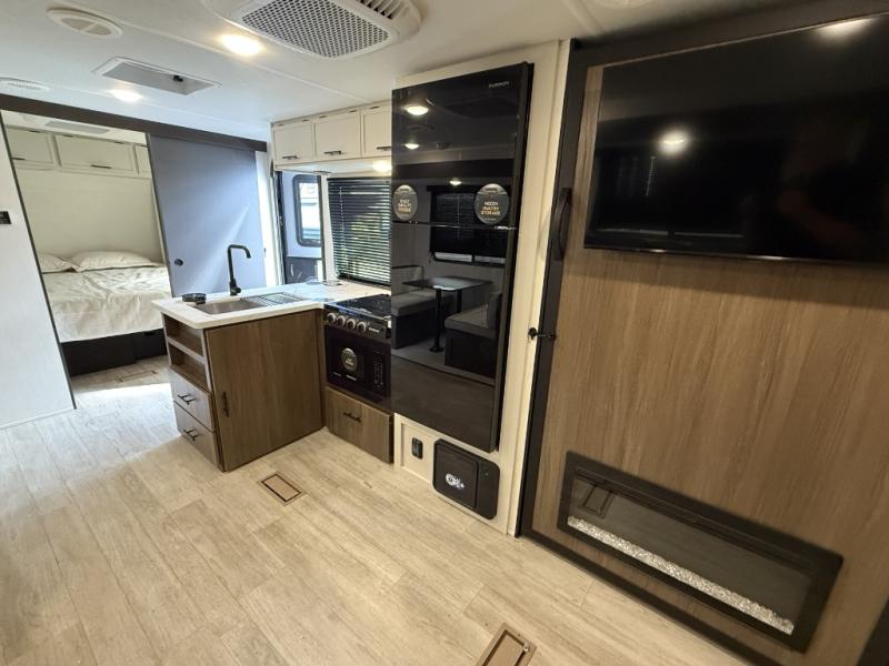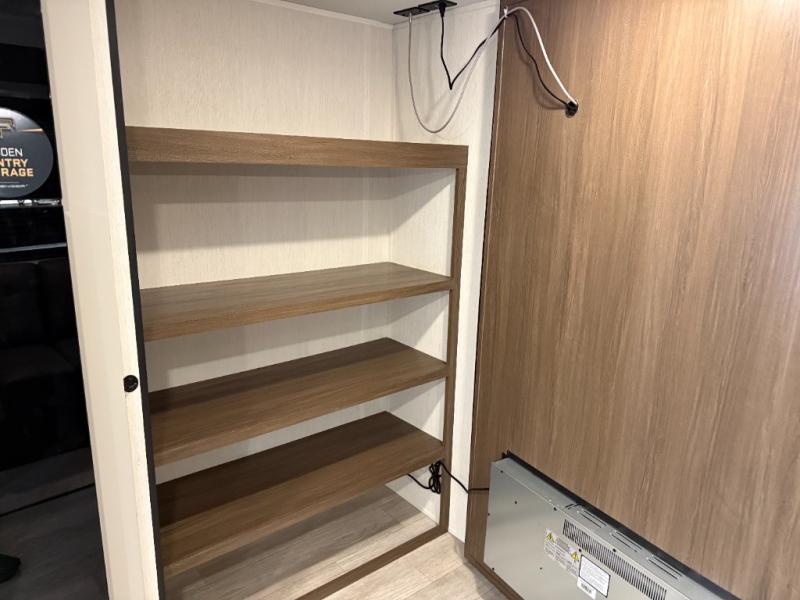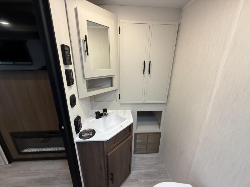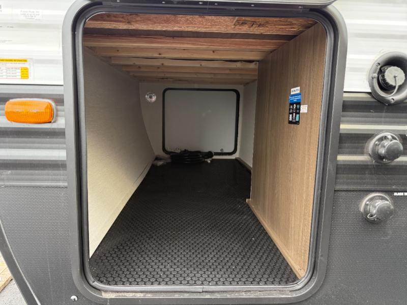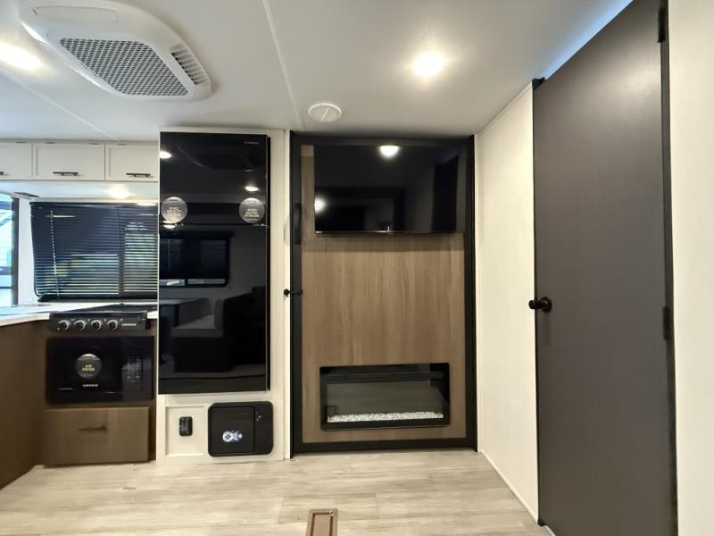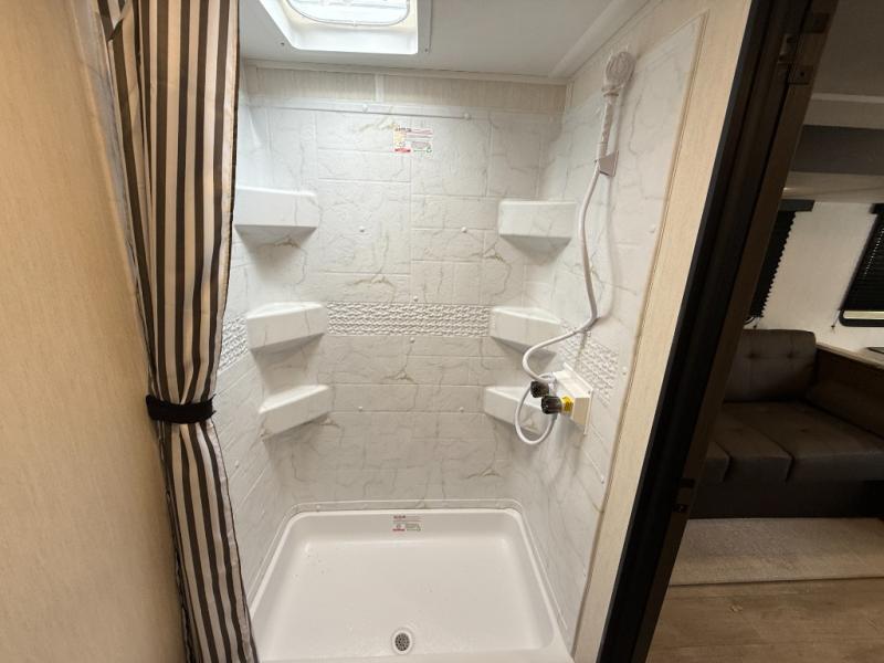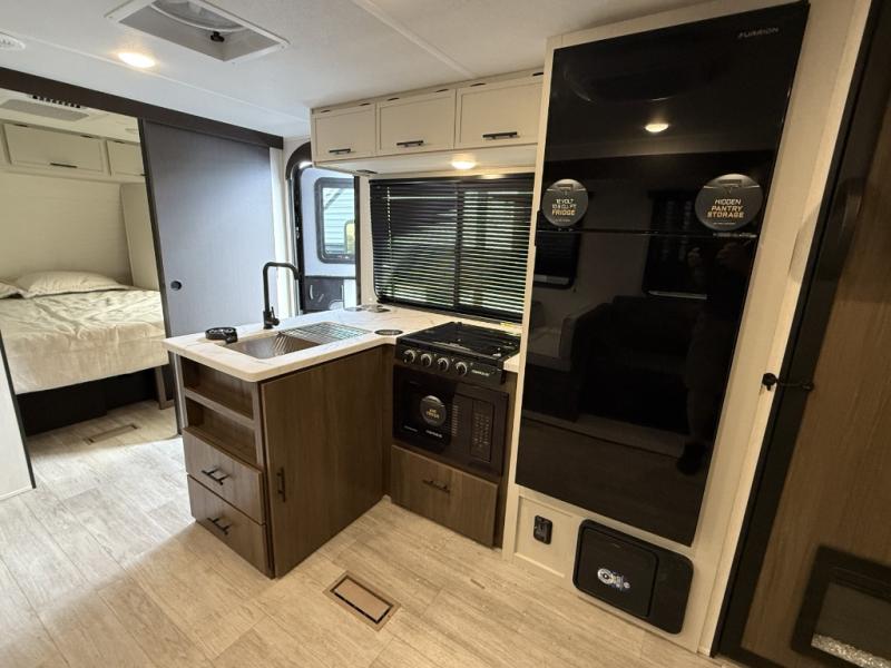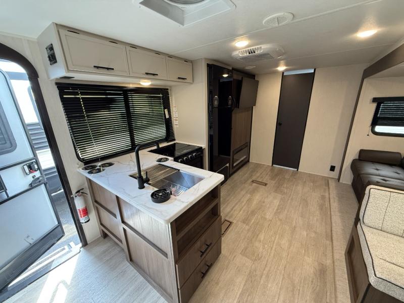 You'll appreciate the added space in this travel trailer thanks to the large slide out! The booth dinette and sofa are found here, and there is a moveable storage ottoman for extra blankets or board games. You'll have your own space up front in the private bedroom, complete with a camp king bed and storage for your things. The chef of your group will find a three burner cooktop and a built-in convection microwave with an air fryer to cook meals, plus there is a 12V refrigerator and hidden pantry for food storage. This unit also includes a power awning outdoors and an outside refrigerator to keep cold drinks close by.