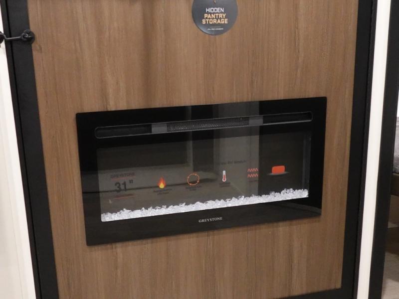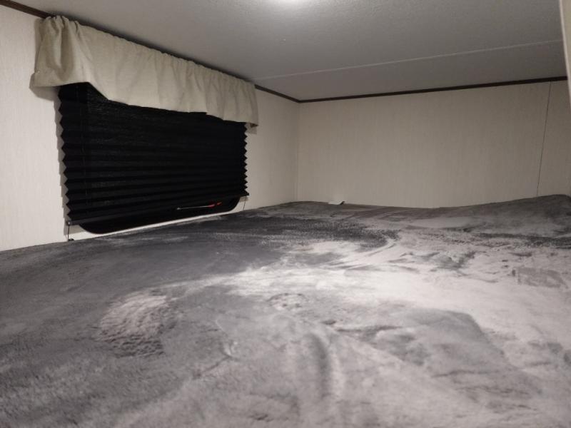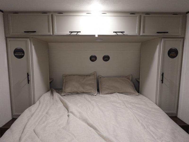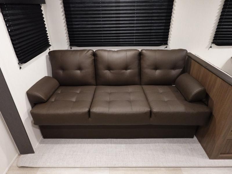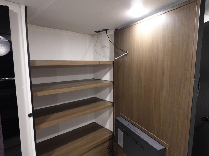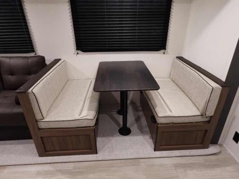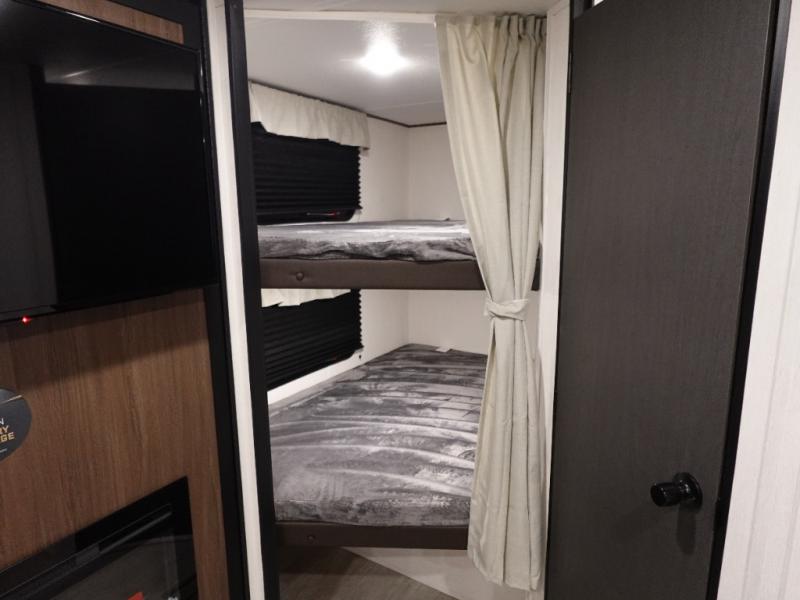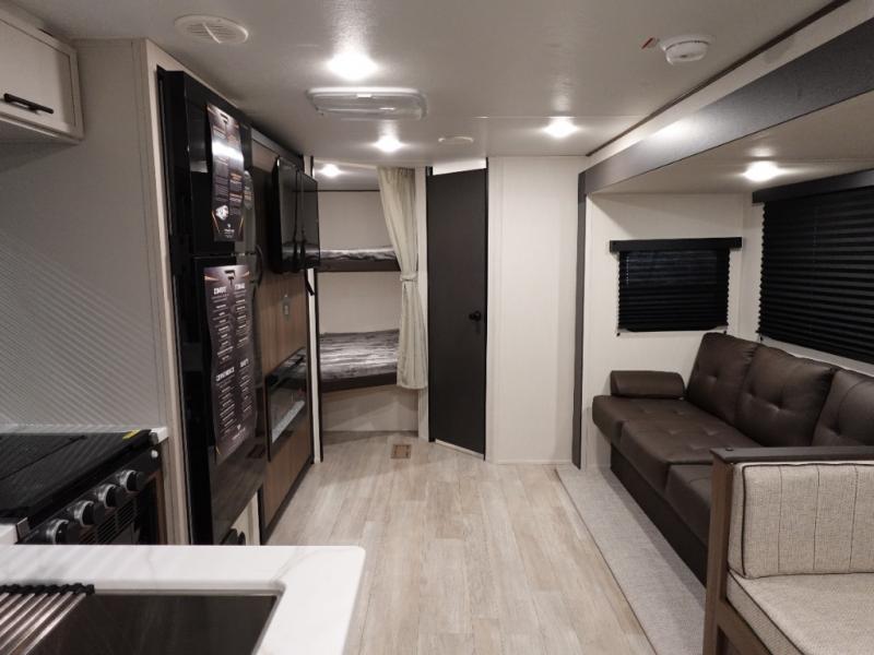 You'll appreciate the added space in this travel trailer thanks to the large slide out! The booth dinette and sofa are found here, and there is a moveable storage ottoman for extra blankets or board games. You'll have your own space up front in the private bedroom, complete with a camp king bed and storage for your things, while your guests take the double-size bunk beds towards the back. The chef of your group will find a three burner cooktop and a built-in convection microwave with an air fryer to cook meals, plus there is a 12V refrigerator and large hidden pantry for food storage. This unit also includes a power awning outdoors and an outside refrigerator to keep cold drinks close by.