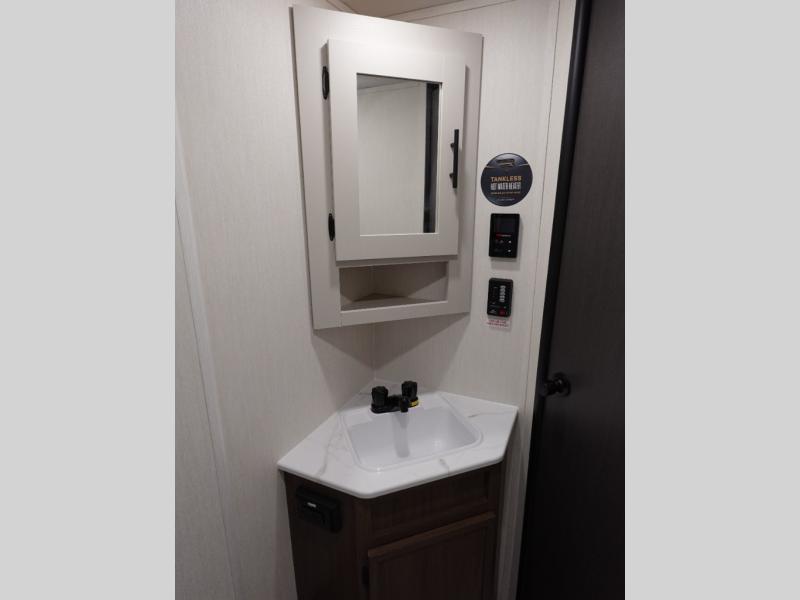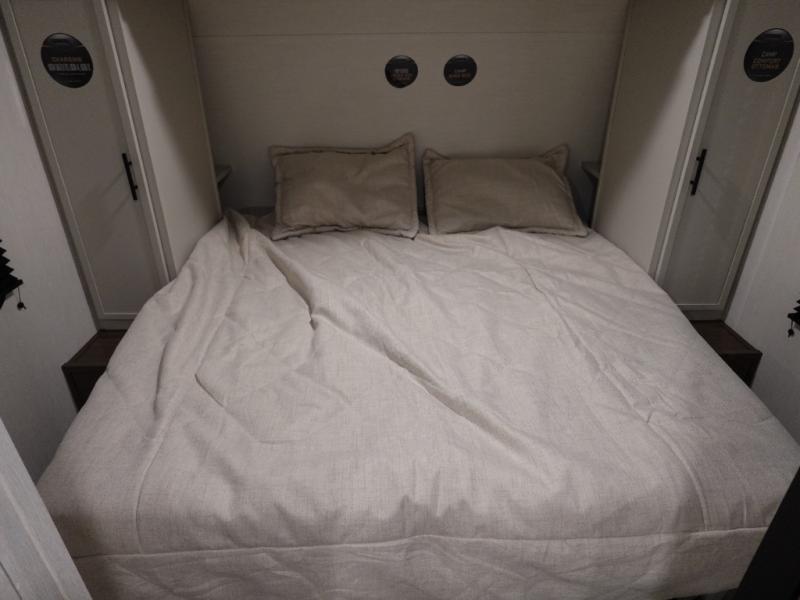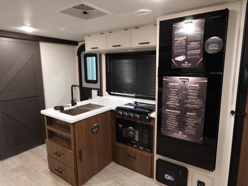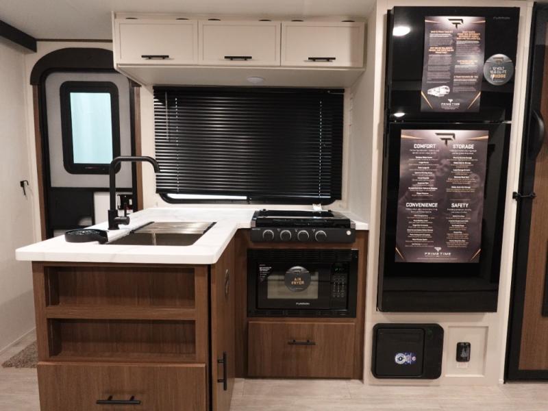 With any Avenger travel trailer by Prime Time RV, you will find innovation, a solid build, and comfort at every turn. Each model is built with Tuff Coat on the exterior metal, a fully enclosed underbelly, and a PVC roof membrane to help extend the life of your trailer. You will also find automotive name badging on the exterior, along with an exterior shower, front rail LED light strips, plus an XL padded entry grab handle to name a few conveniences. There are plenty of storage spaces inside, as well as Congoleum flooring and woven PVC marine grade slide out flooring, a designer shower surround, and seamless pressed countertops. You are sure to appreciate the onboard water filtration system, tankless water heater, plus 30K BTU furnace and 15K ducted A/C to help keep you comfortable.