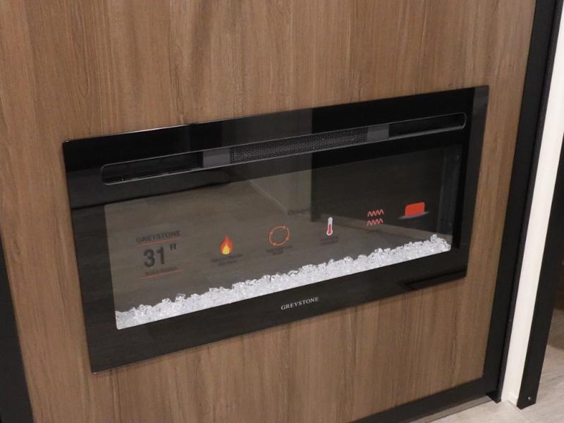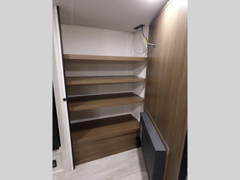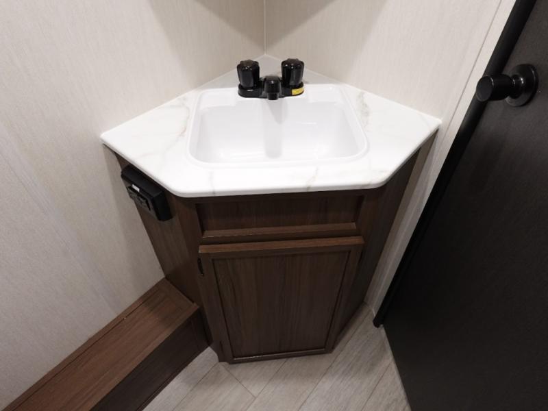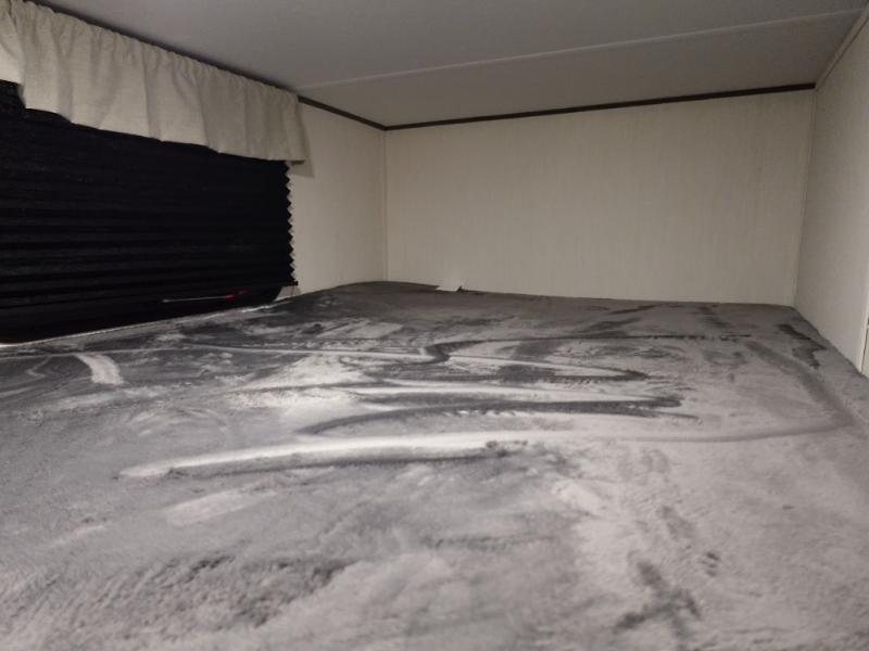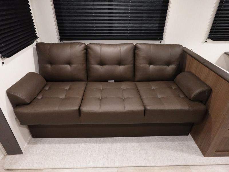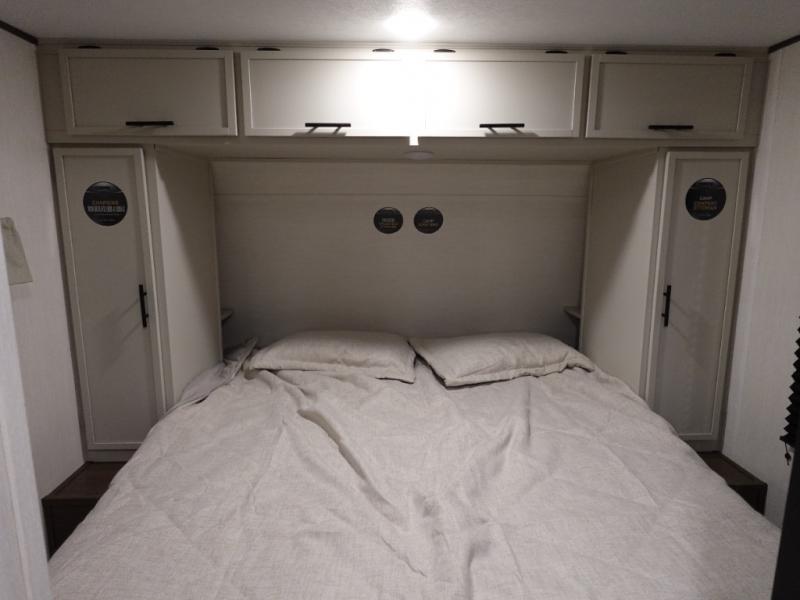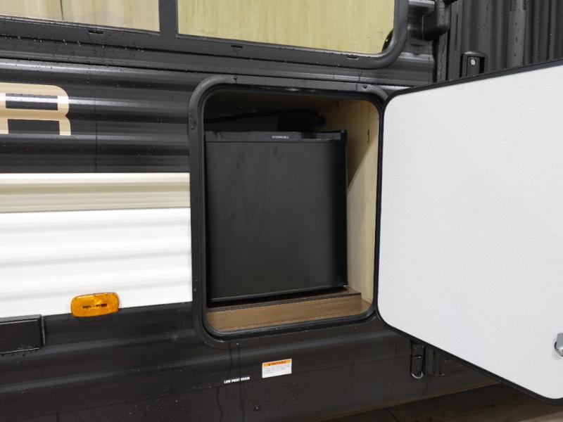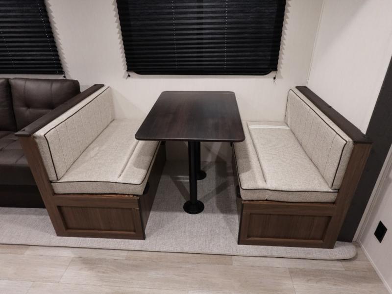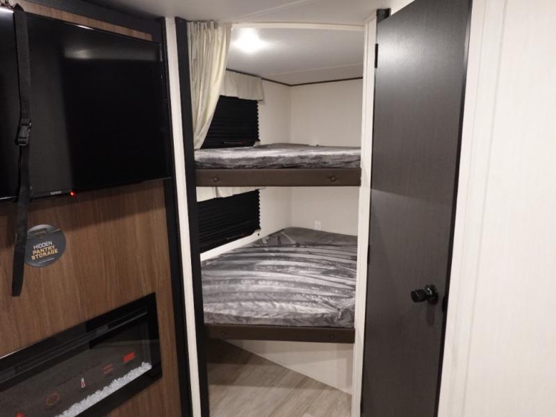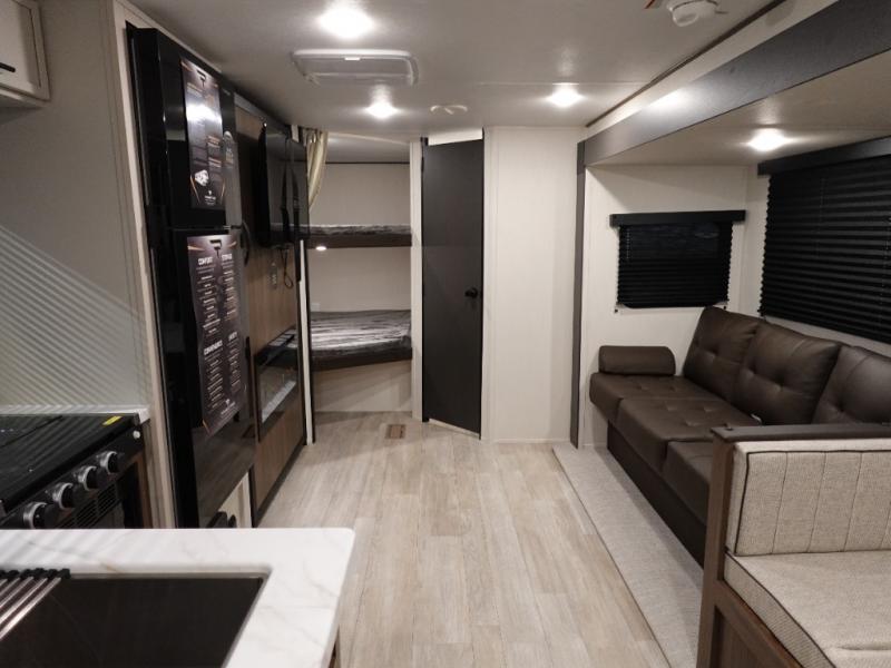 You'll appreciate the added space in this travel trailer thanks to the large slide out! The booth dinette and sofa are found here, and there is a moveable storage ottoman for extra blankets or board games. You'll have your own space up front in the private bedroom, complete with a camp king bed and storage for your things, while your guests take the double-size bunk beds towards the back. The chef of your group will find a three burner cooktop and a built-in convection microwave with an air fryer to cook meals, plus there is a 12V refrigerator and large hidden pantry for food storage. This unit also includes a power awning outdoors and an outside refrigerator to keep cold drinks close by.