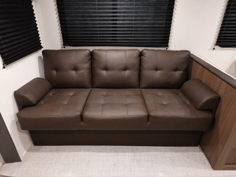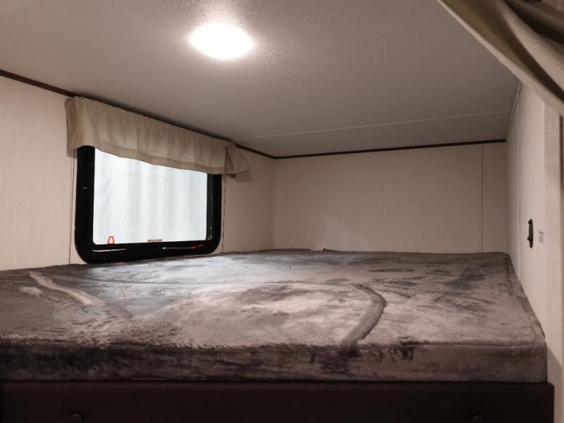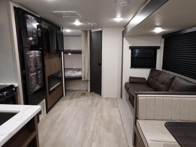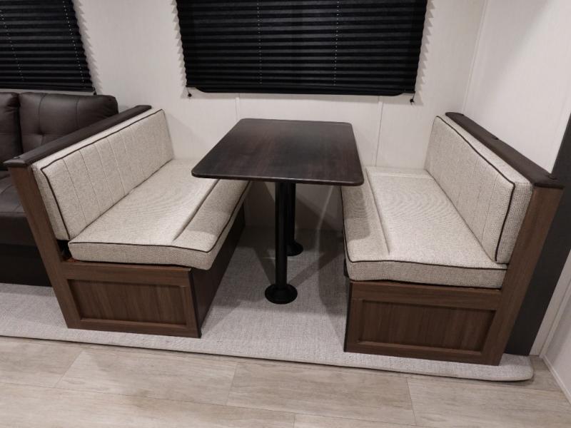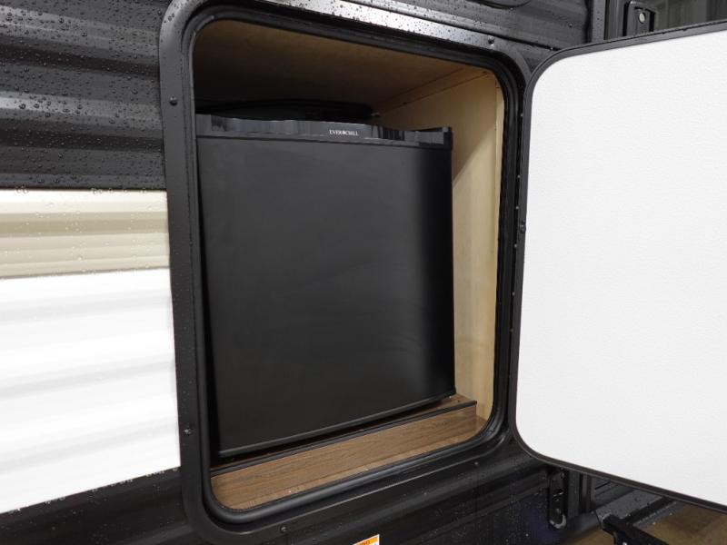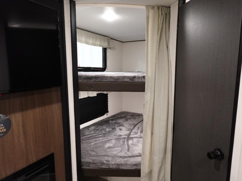 You'll appreciate the added space in this travel trailer thanks to the large slide out! The booth dinette and sofa are found here, and there is a moveable storage ottoman for extra blankets or board games. You'll have your own space up front in the private bedroom, complete with a camp king bed and storage for your things, while your guests take the double-size bunk beds towards the back. The chef of your group will find a three burner cooktop and a built-in convection microwave with an air fryer to cook meals, plus there is a 12V refrigerator and large hidden pantry for food storage. This unit also includes a power awning outdoors and an outside refrigerator to keep cold drinks close by.
