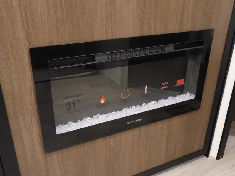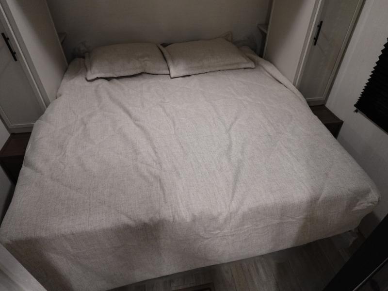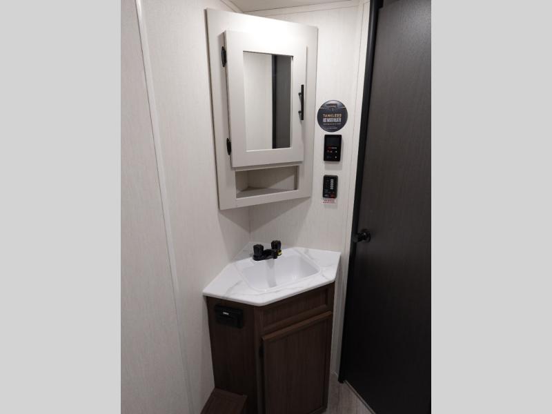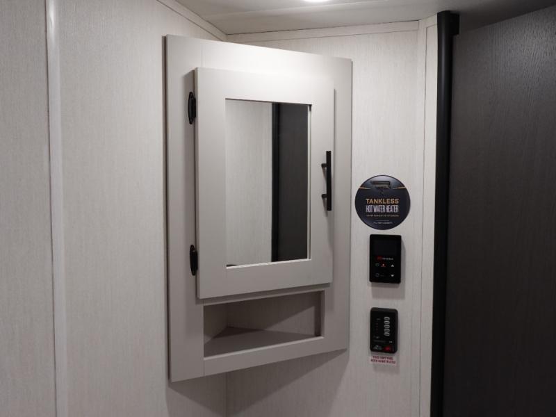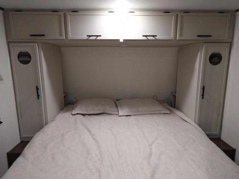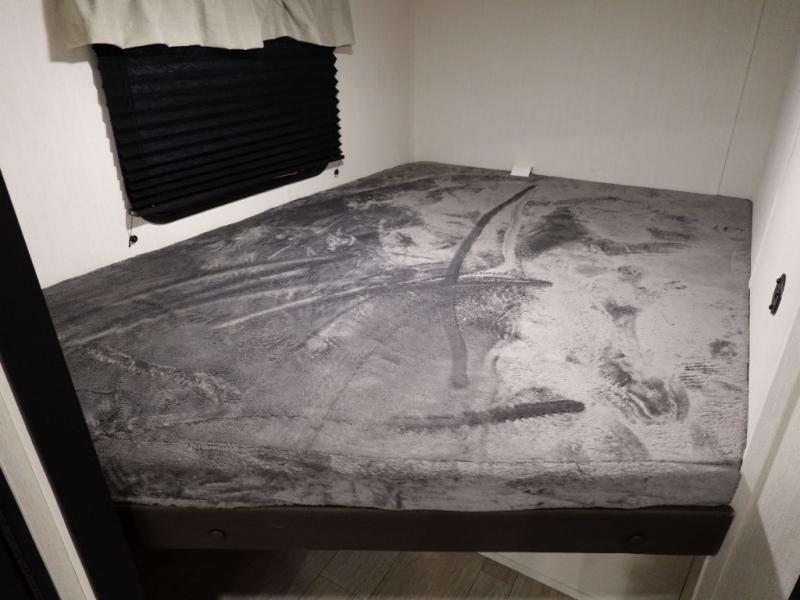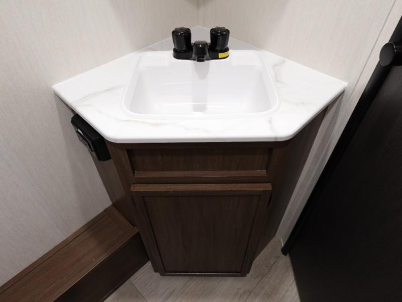 You'll appreciate the added space in this travel trailer thanks to the large slide out! The booth dinette and sofa are found here, and there is a moveable storage ottoman for extra blankets or board games. You'll have your own space up front in the private bedroom, complete with a camp king bed and storage for your things, while your guests take the double-size bunk beds towards the back. The chef of your group will find a three burner cooktop and a built-in convection microwave with an air fryer to cook meals, plus there is a 12V refrigerator and large hidden pantry for food storage. This unit also includes a power awning outdoors and an outside refrigerator to keep cold drinks close by.