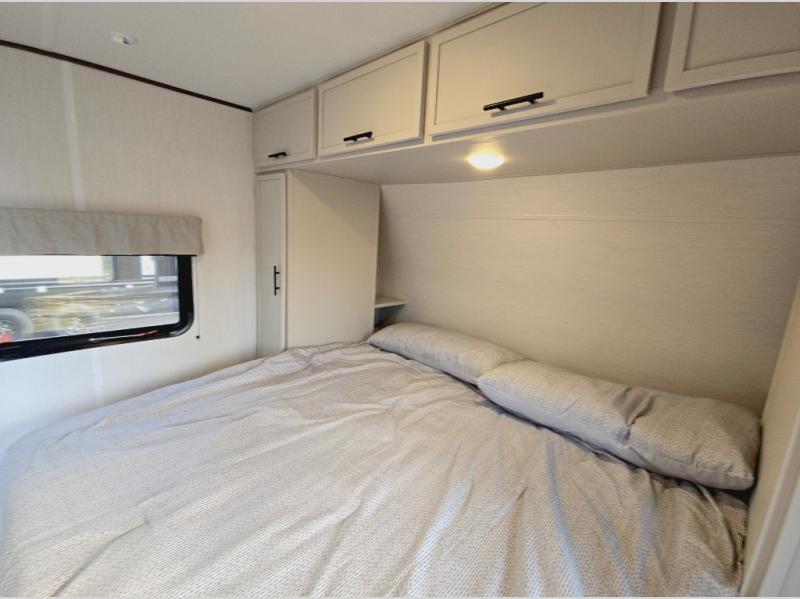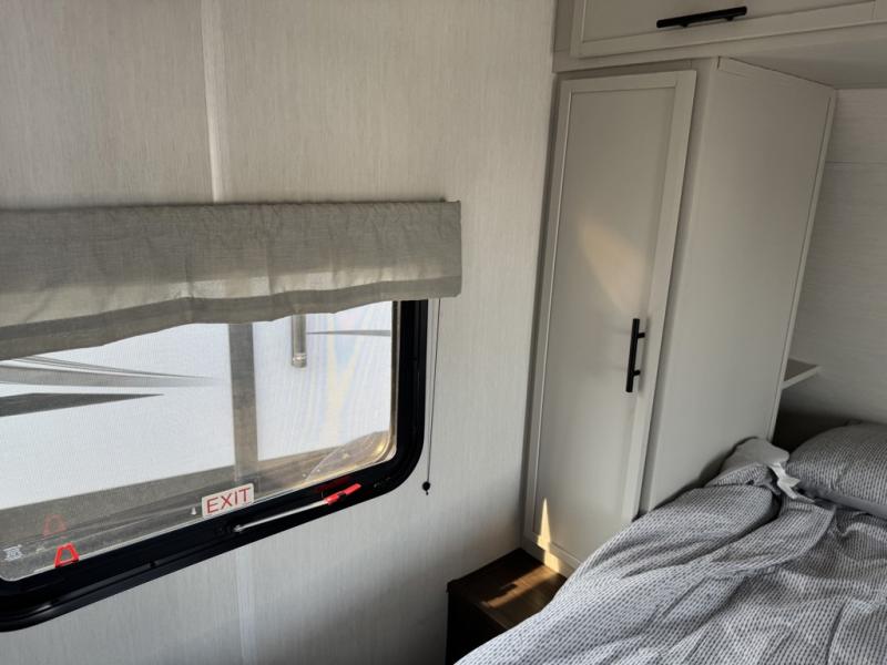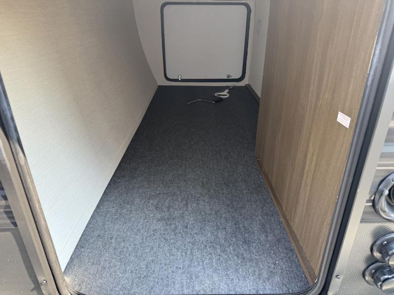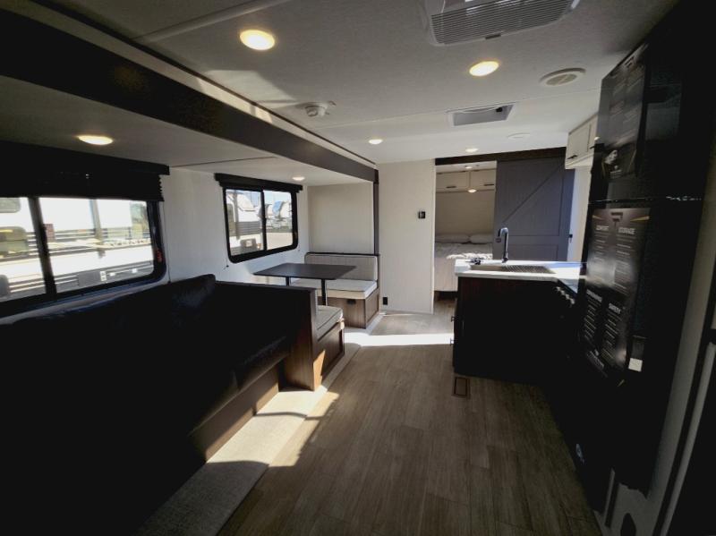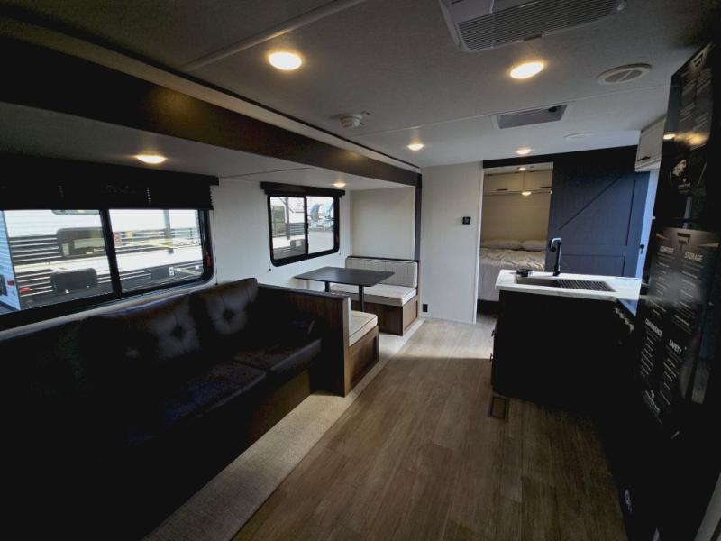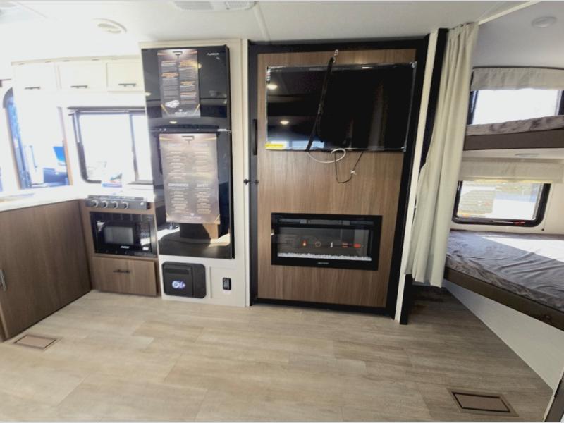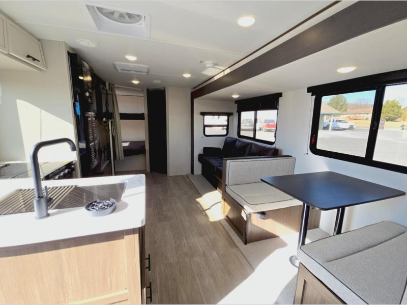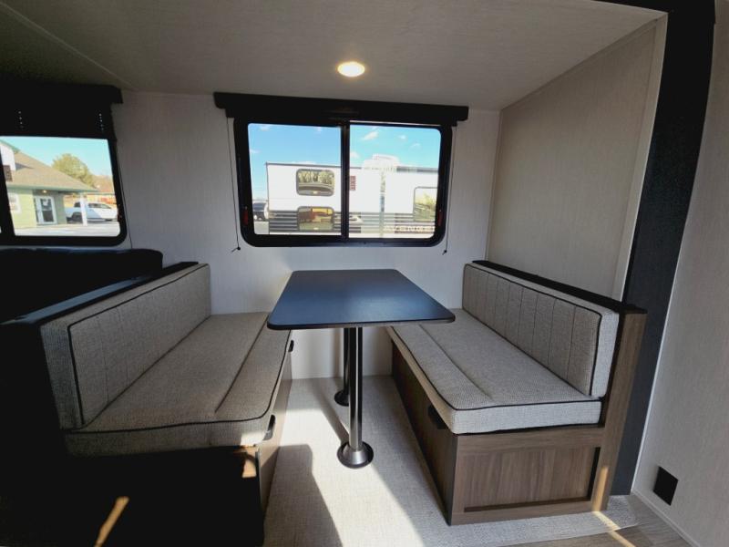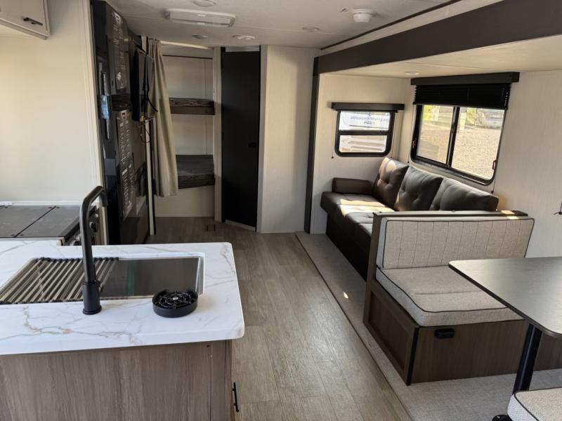You'll appreciate the added space in this travel trailer thanks to the large slide out! The booth dinette and sofa are found here, and there is a moveable storage ottoman for extra blankets or board games. You'll have your own space up front in the private bedroom, complete with a camp king bed and storage for your things, while your guests take the double-size bunk beds towards the back. The chef of your group will find a three burner cooktop and a built-in convection microwave with an air fryer to cook meals, plus there is a 12V refrigerator and large hidden pantry for food storage. This unit also includes a power awning outdoors and an outside refrigerator to keep cold drinks close by.